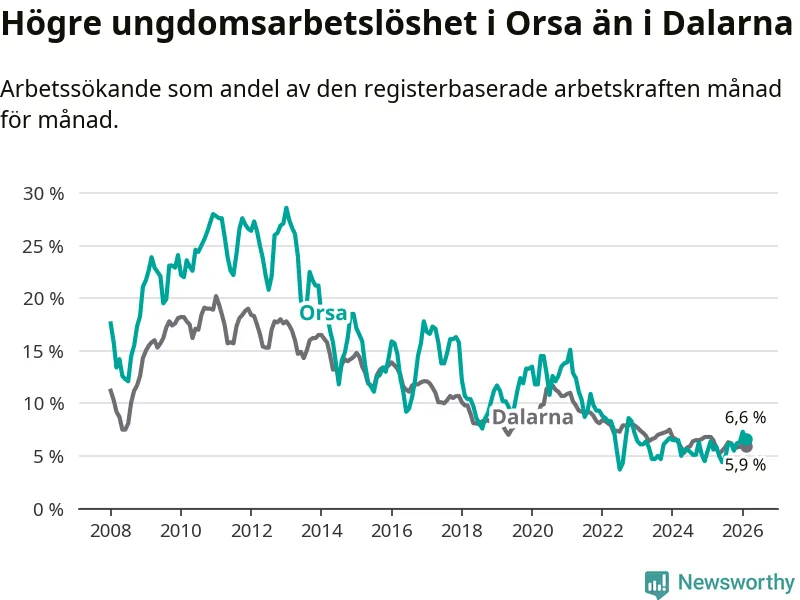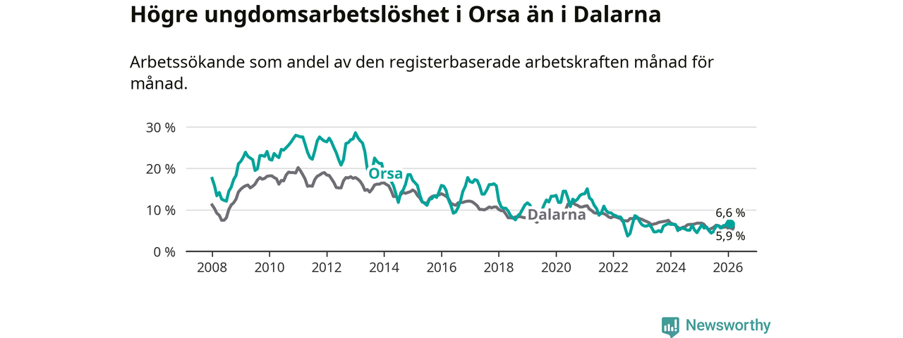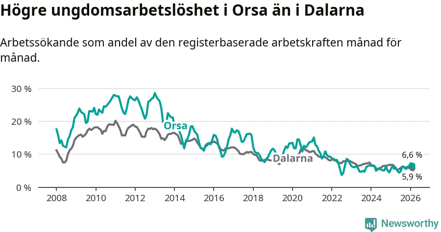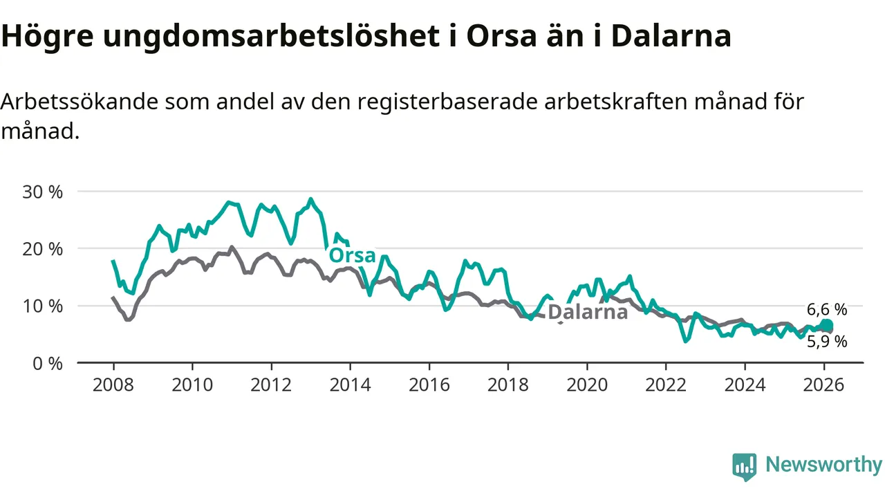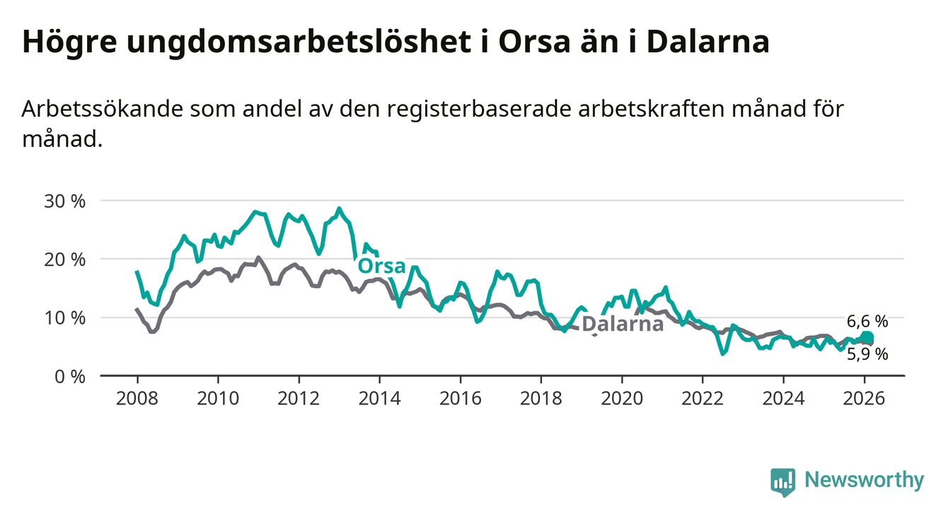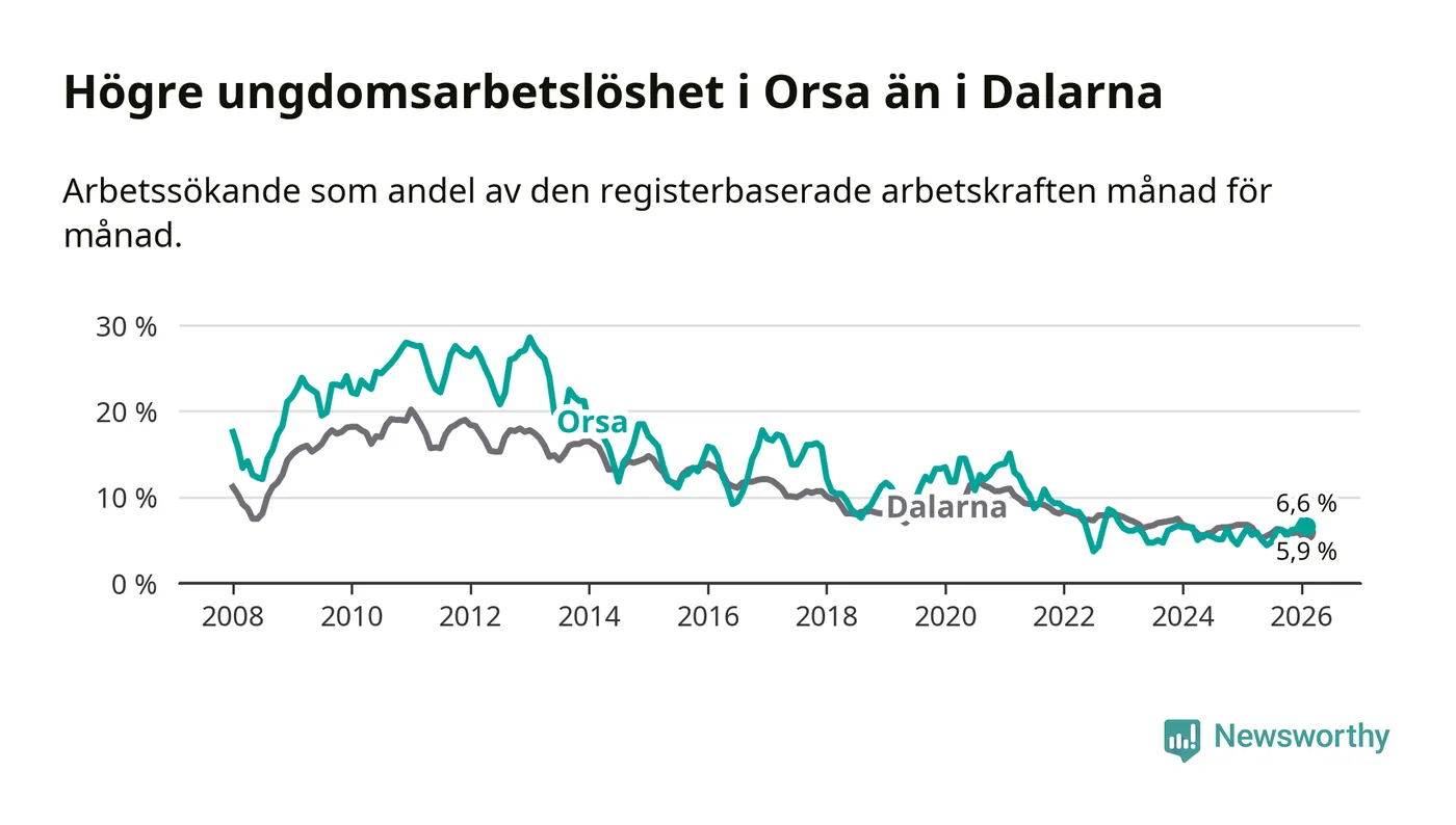 Precis som den totala arbetslösheten ligger ungdomsarbetslösheten i Orsa högre än i Dalarna som helhet. Skillnaden mellan kommunen och länet är 0,7 procentenheter.