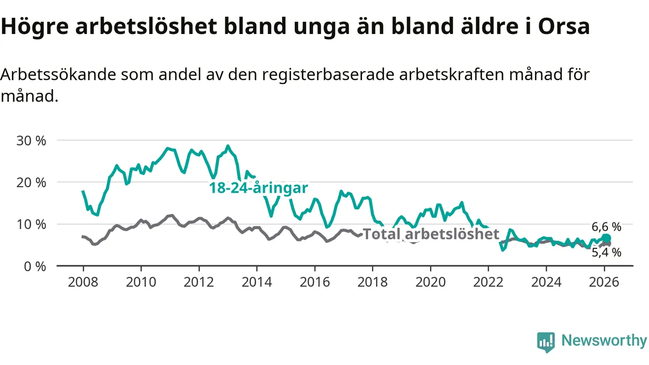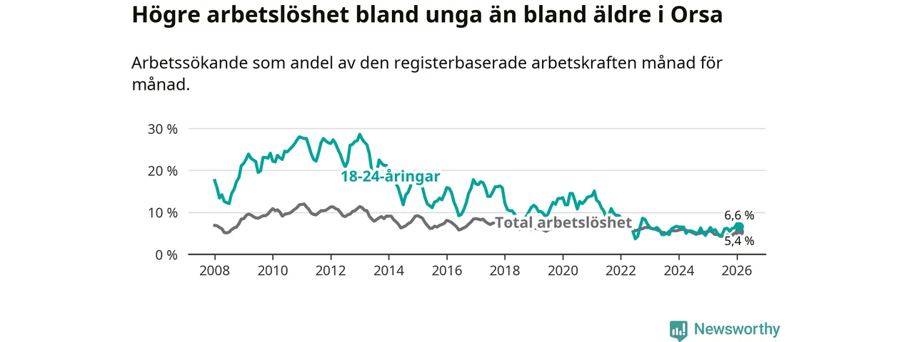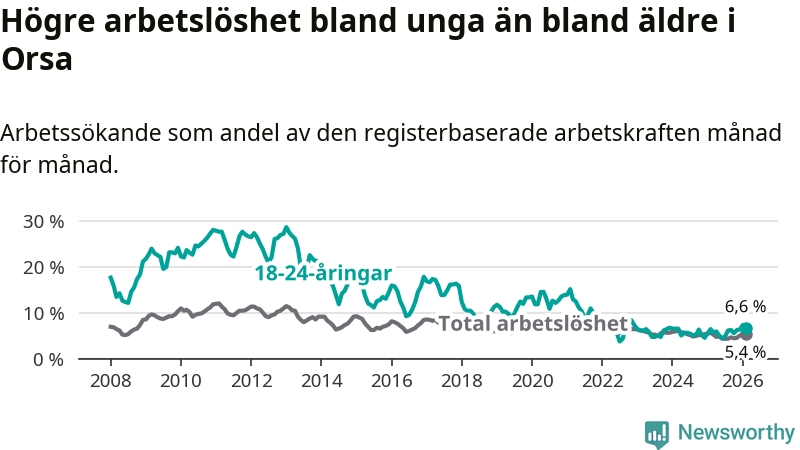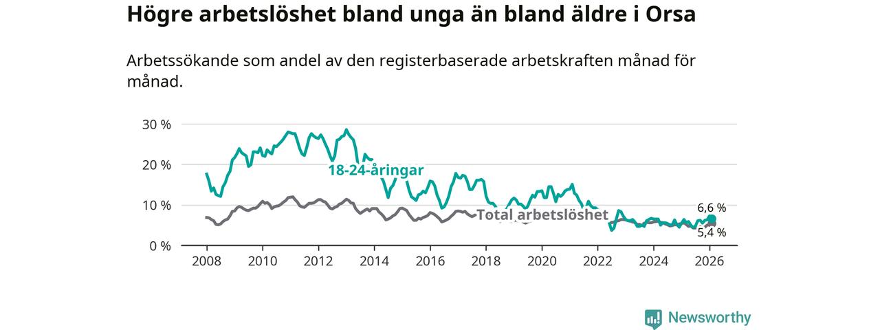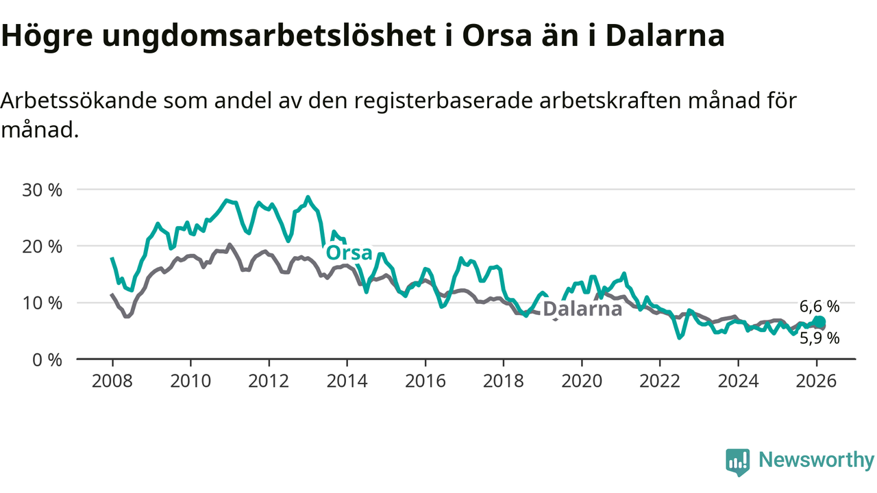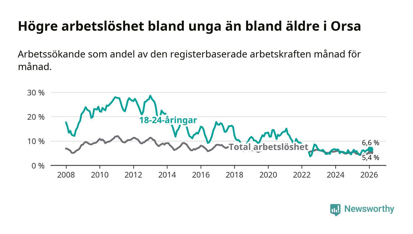 Precis som den totala arbetslösheten ligger ungdomsarbetslösheten i Orsa högre än i Dalarna som helhet. Skillnaden mellan kommunen och länet är 0,7 procentenheter.