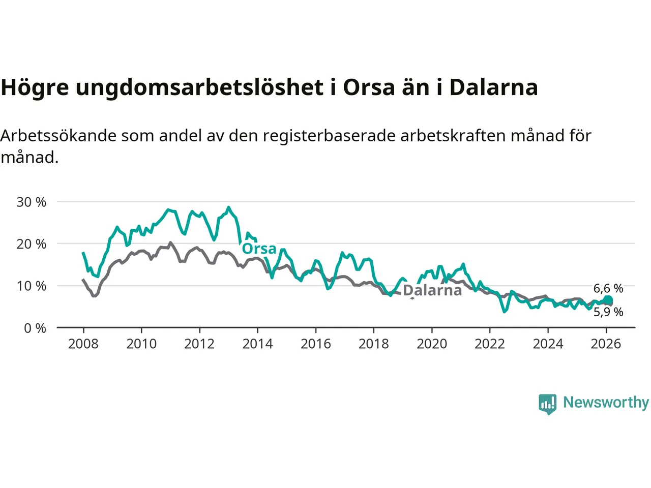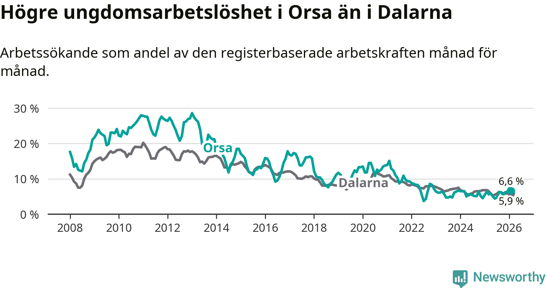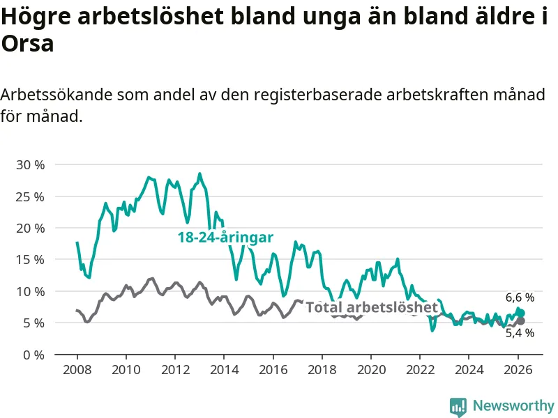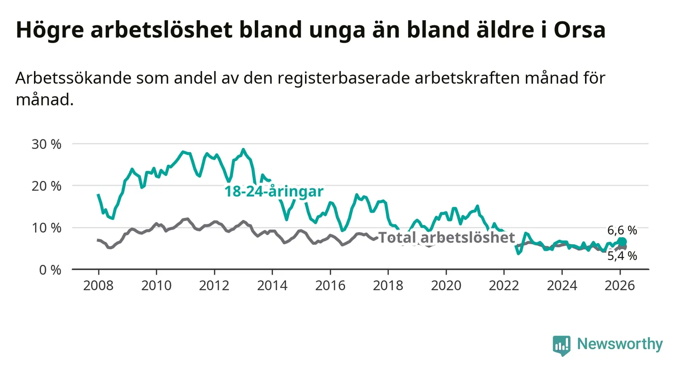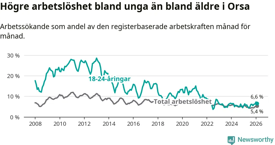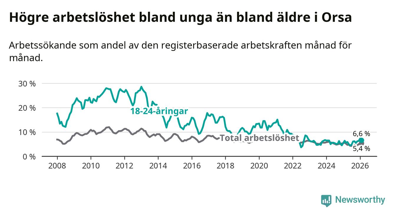 Precis som den totala arbetslösheten ligger ungdomsarbetslösheten i Orsa högre än i Dalarna som helhet. Skillnaden mellan kommunen och länet är 0,7 procentenheter.