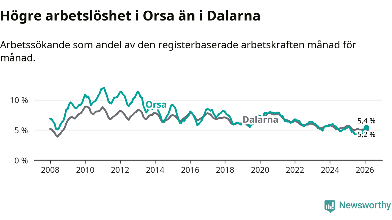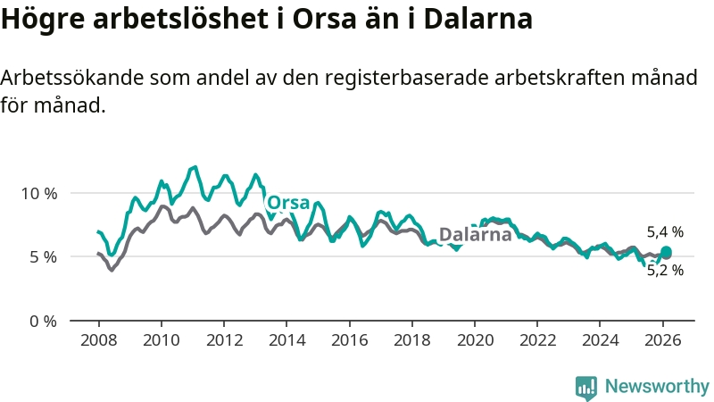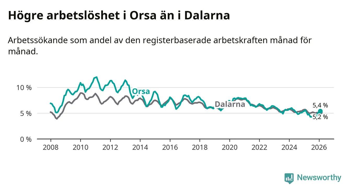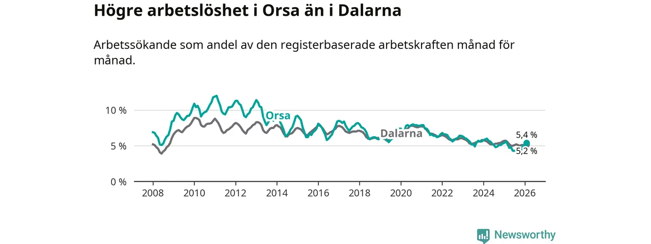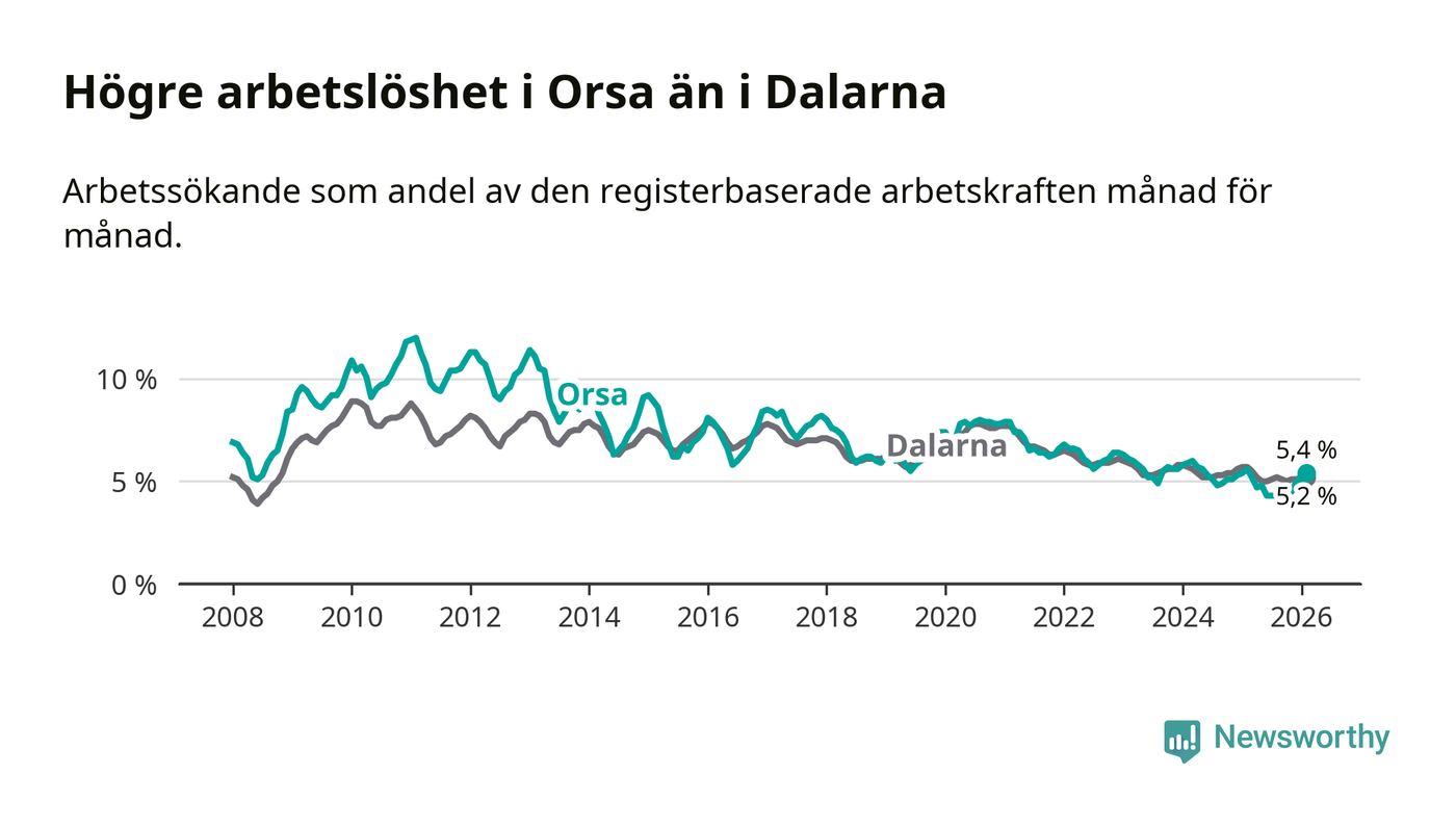 Under februari månad rapporterade Orsa kommun en total arbetslöshet på 5,4 procent. Det är en minskning jämfört med samma tidpunkt i fjol (−0,2 procentenheter). Även i Dalarnas län sjunker arbetslösheten .