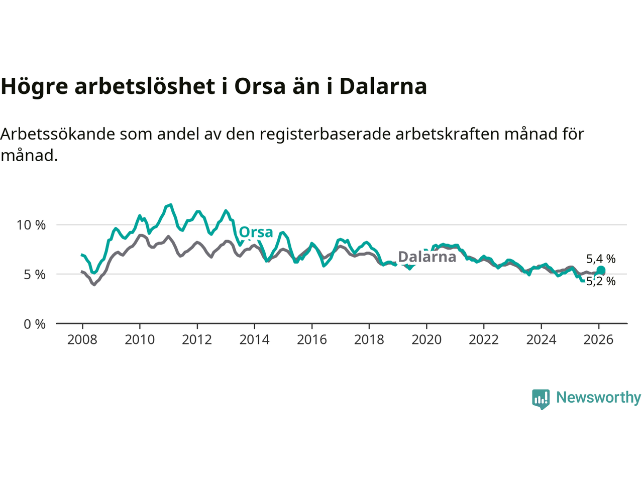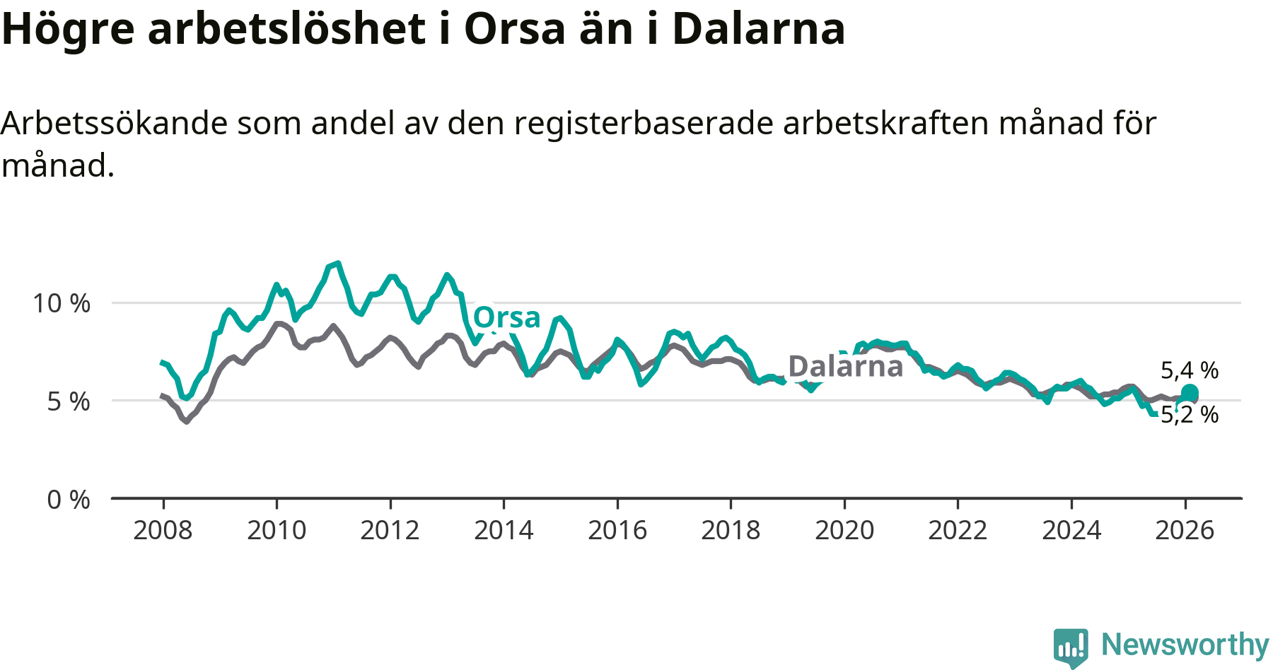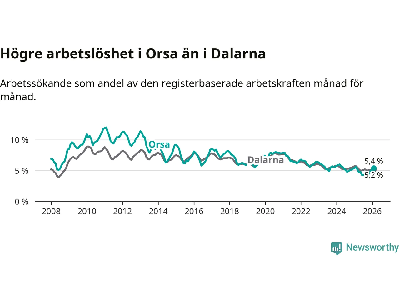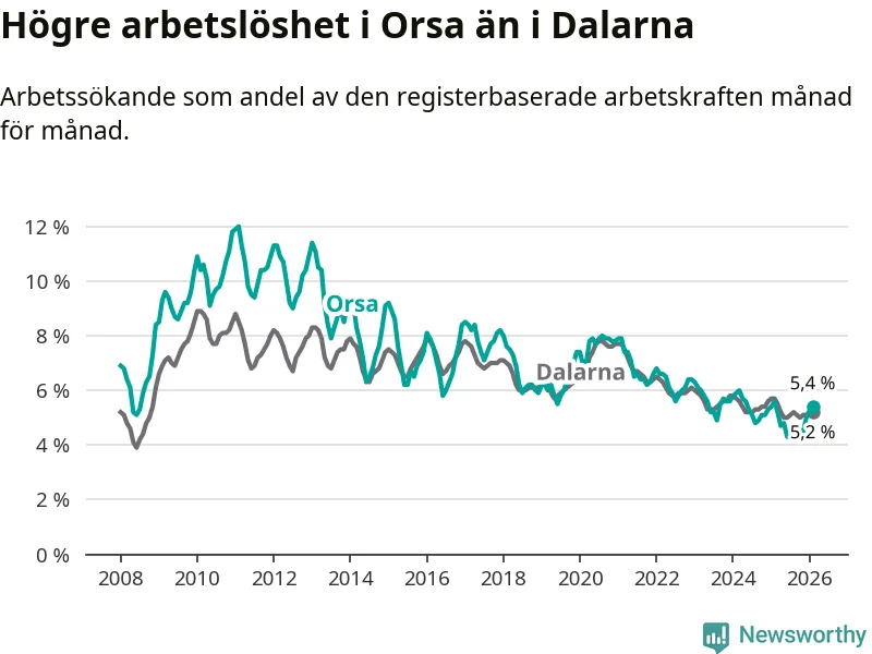 Under februari månad rapporterade Orsa kommun en total arbetslöshet på 5,4 procent. Det är en minskning jämfört med samma tidpunkt i fjol (−0,2 procentenheter). Även i Dalarnas län sjunker arbetslösheten .