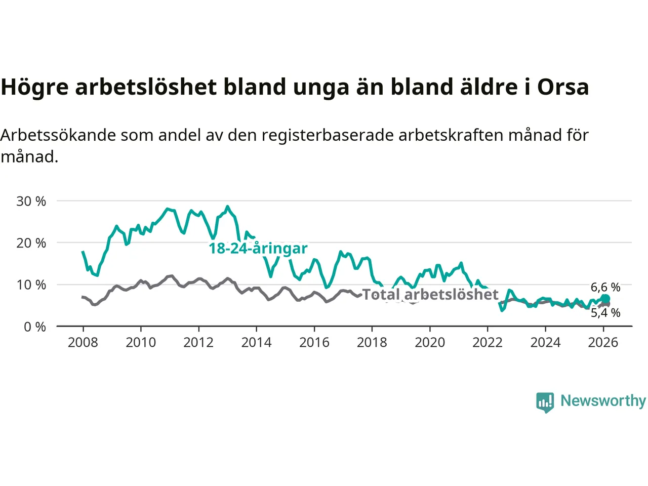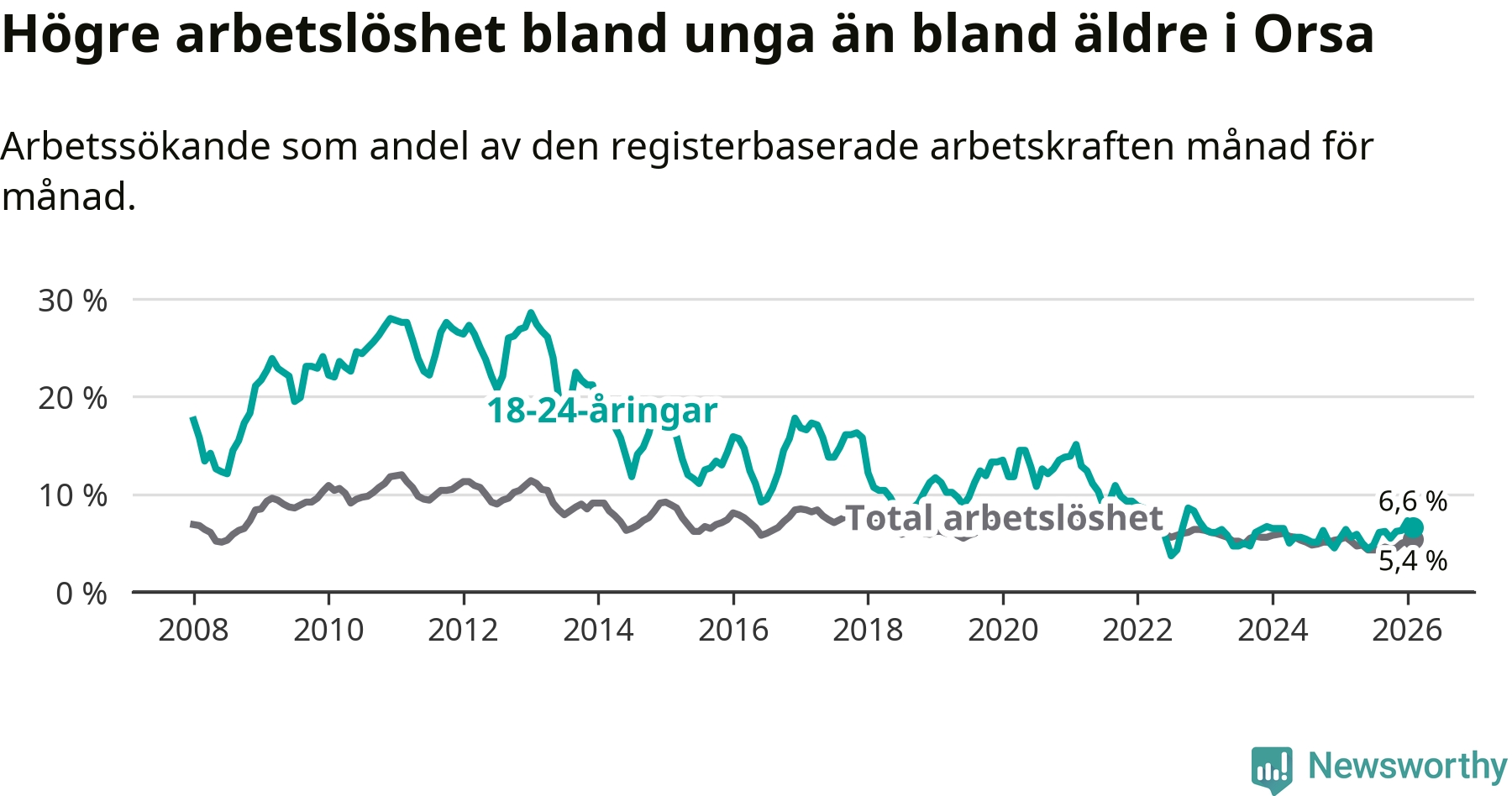 Till skillnad från den totala arbetslösheten stiger arbetslösheten bland unga (+0,2 procentenheter). I februari var 6,6 procent av 18–24-åringarna inskrivna som arbetssökande (motsvarande 20 personer). Mäter vi antalet inskrivna ser vi en minskning med ett personer på ett års sikt.