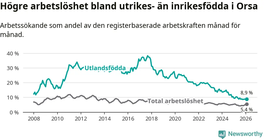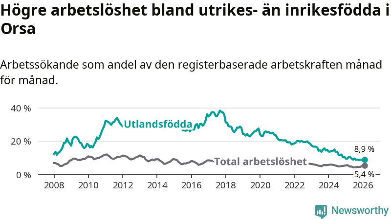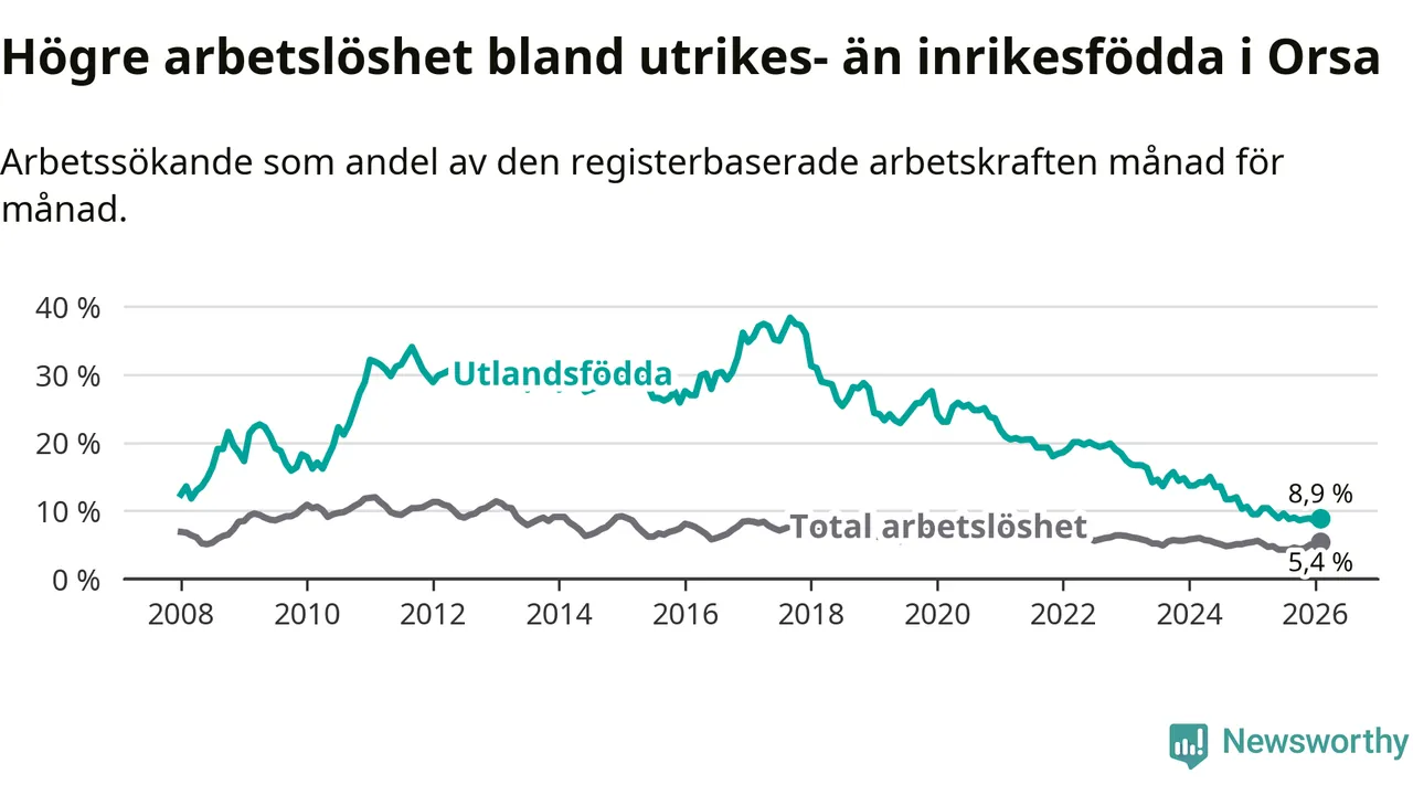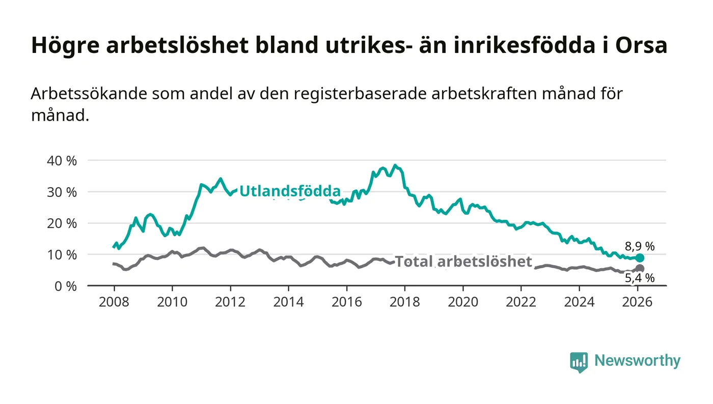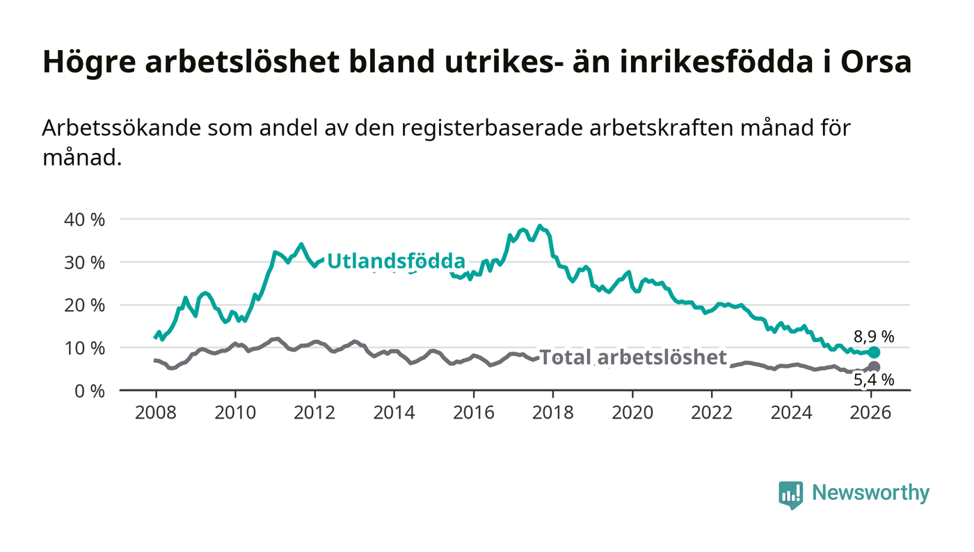 Arbetslösheten bland utlandsfödda var 8,9 procent i Orsa under februari månad, motsvarande 39 av 438 personer. Det är 0,6 procentenheter färre än vid samma tidpunkt i fjol (−4 om man räknar personer). Därmed har de utlandsföddas arbetslöshet varit lägre än vid samma tidpunkt i fjol i över tre år i sträck. Sedan december 2022 har arbetslösheten bland utlandsfödda minskat från 18,5 till 8,9 procent.