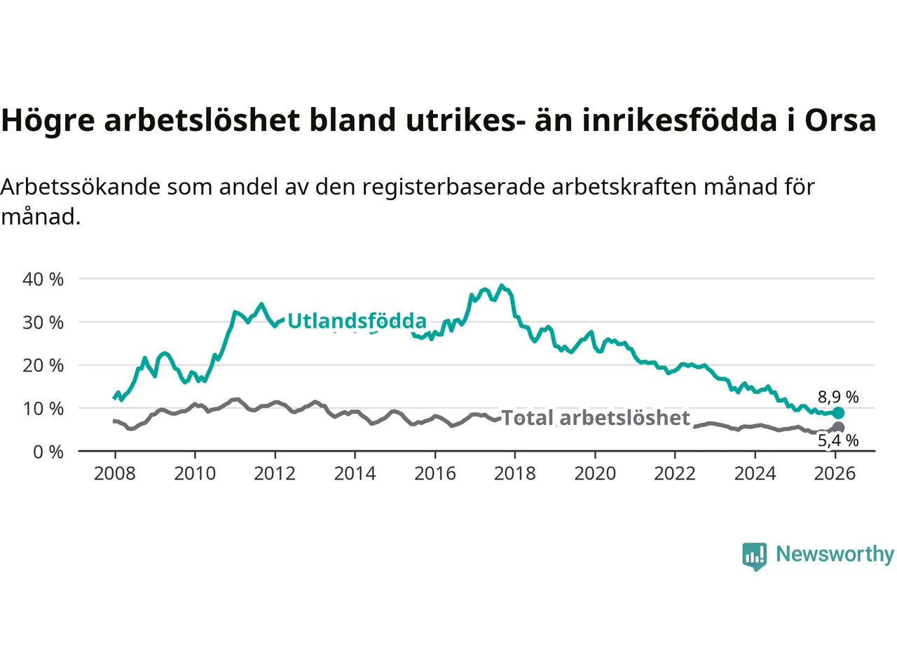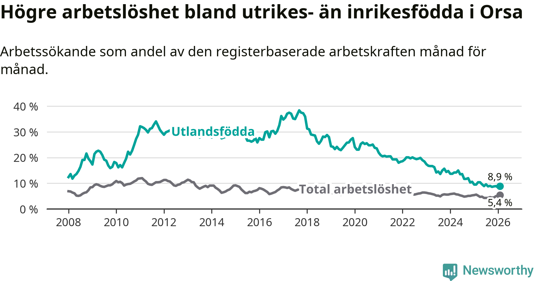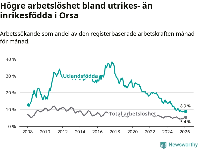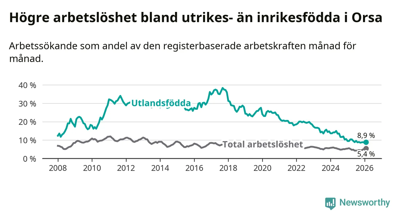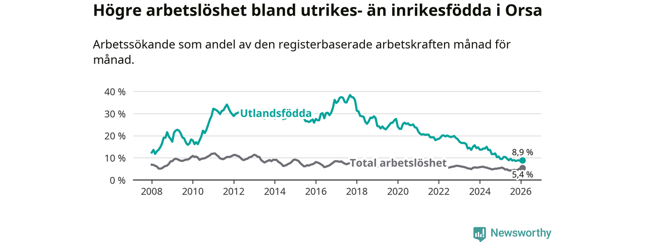 Arbetslösheten bland utlandsfödda var 8,9 procent i Orsa under februari månad, motsvarande 39 av 438 personer. Det är 0,6 procentenheter färre än vid samma tidpunkt i fjol (−4 om man räknar personer). Därmed har de utlandsföddas arbetslöshet varit lägre än vid samma tidpunkt i fjol i över tre år i sträck. Sedan december 2022 har arbetslösheten bland utlandsfödda minskat från 18,5 till 8,9 procent.