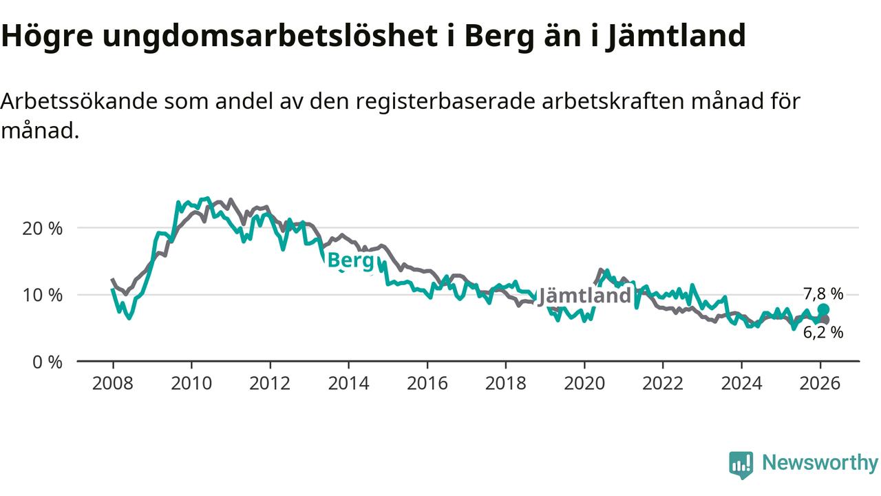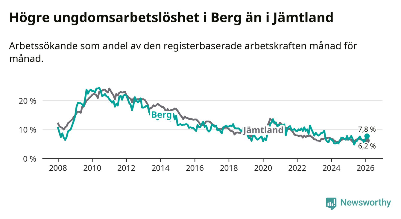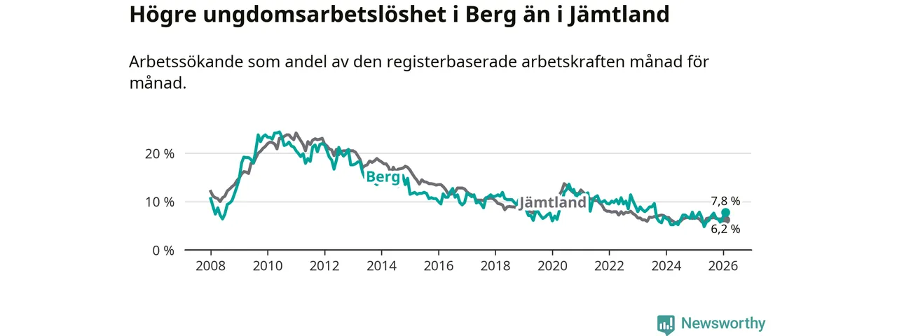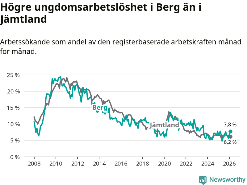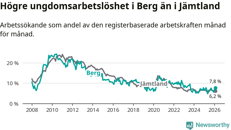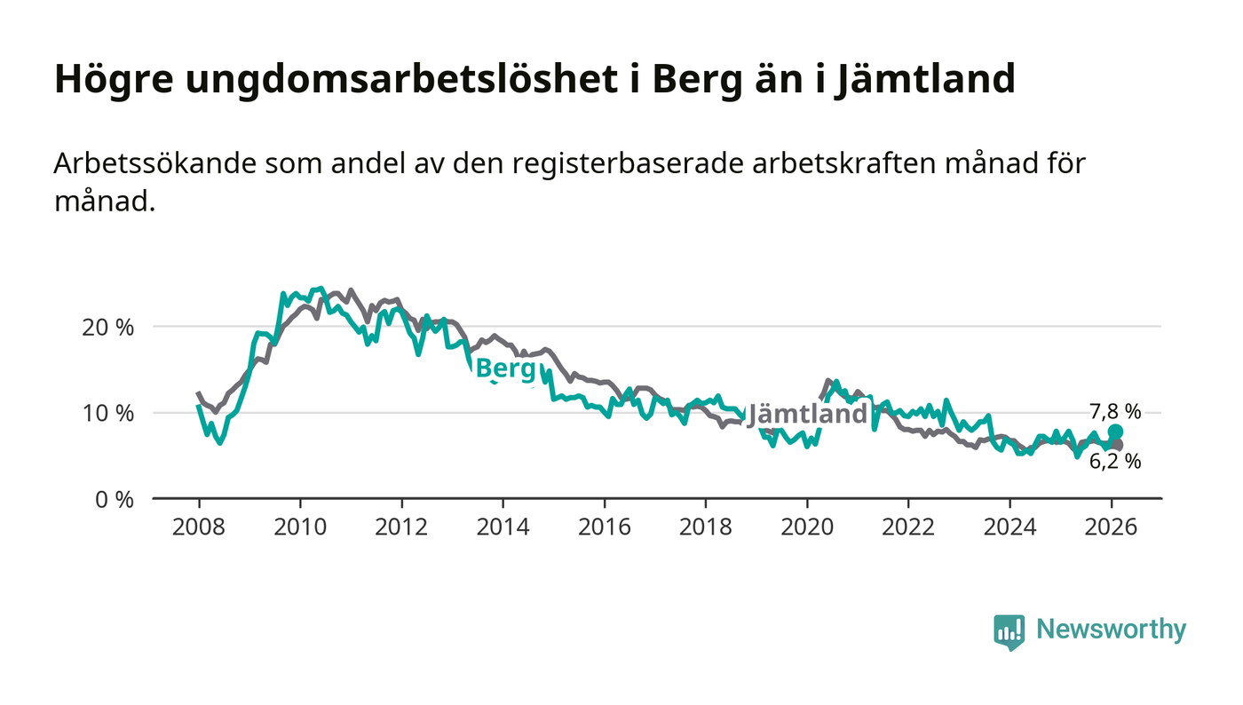 Precis som den totala arbetslösheten ligger ungdomsarbetslösheten i Berg högre än i Jämtland som helhet. Skillnaden mellan kommunen och länet är 1,6 procentenheter.