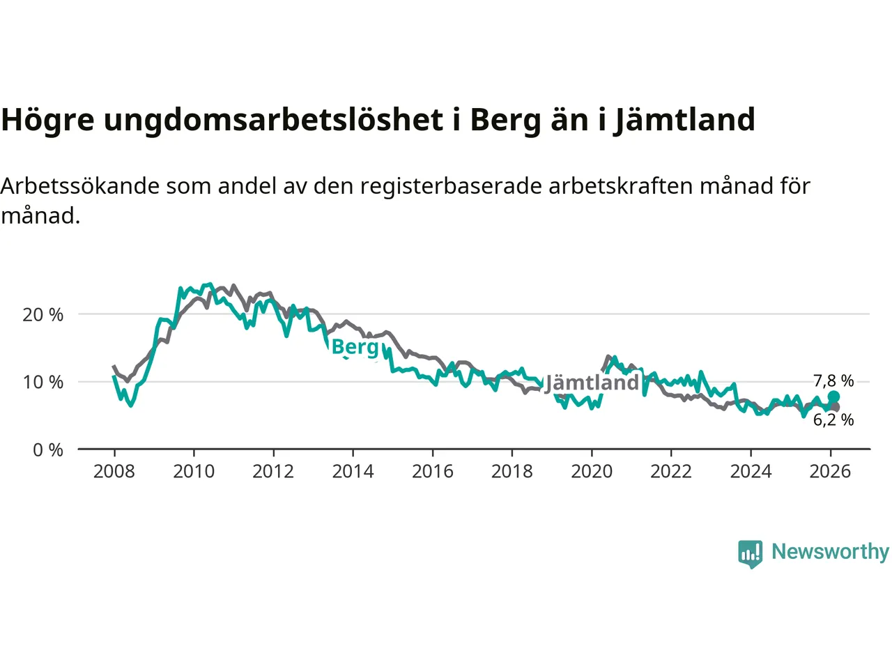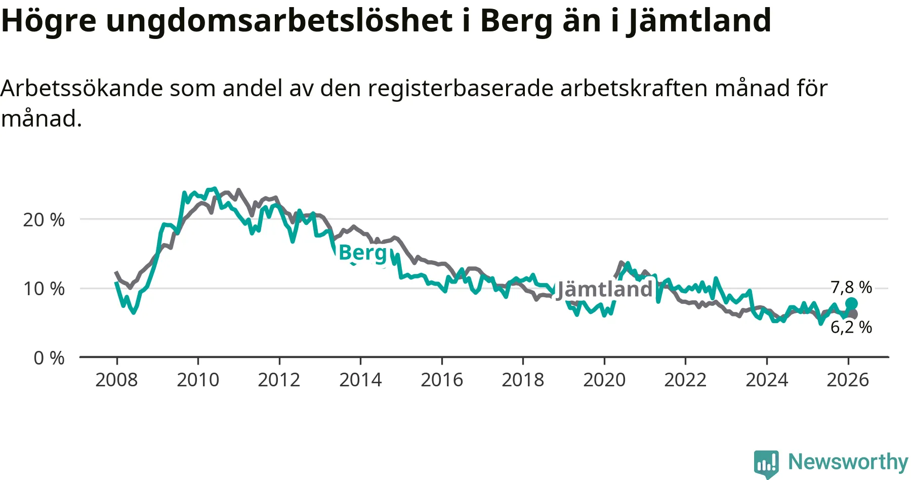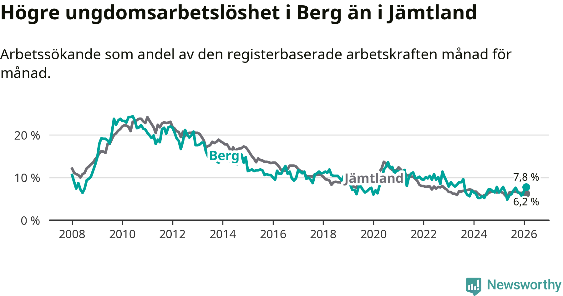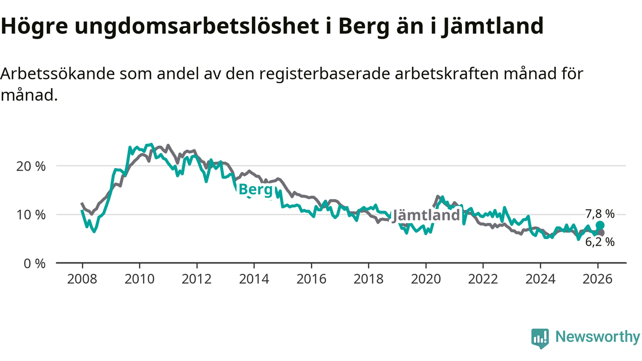 Precis som den totala arbetslösheten ligger ungdomsarbetslösheten i Berg högre än i Jämtland som helhet. Skillnaden mellan kommunen och länet är 1,6 procentenheter.