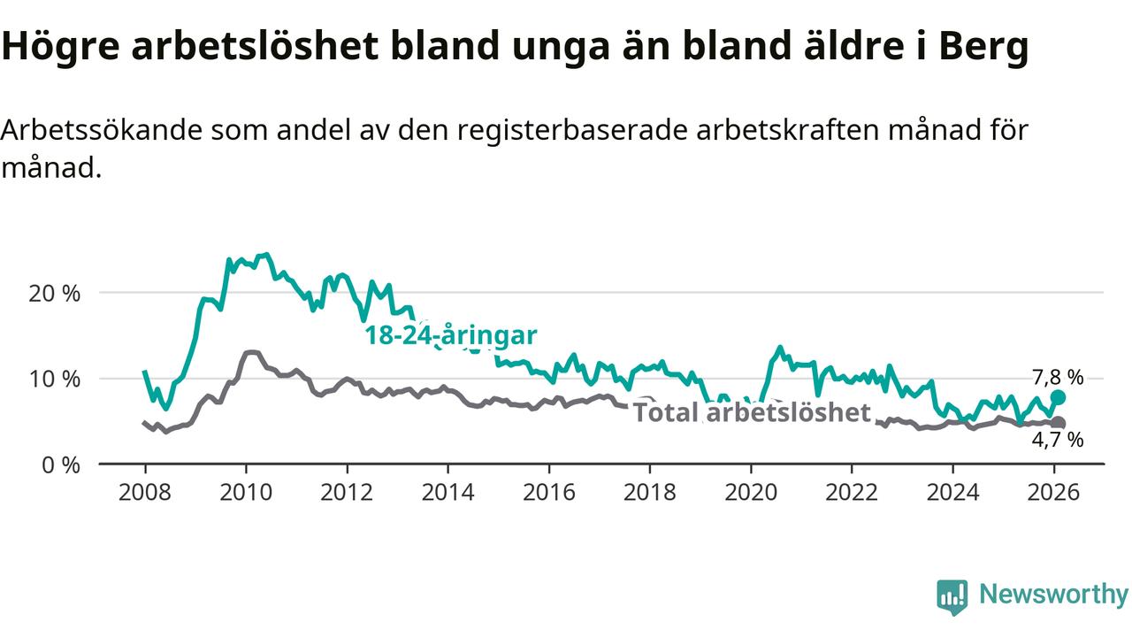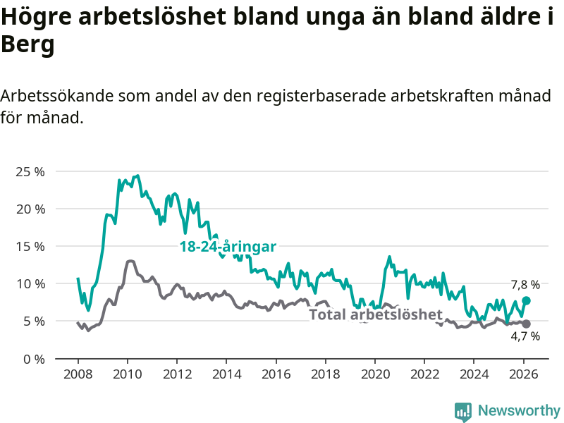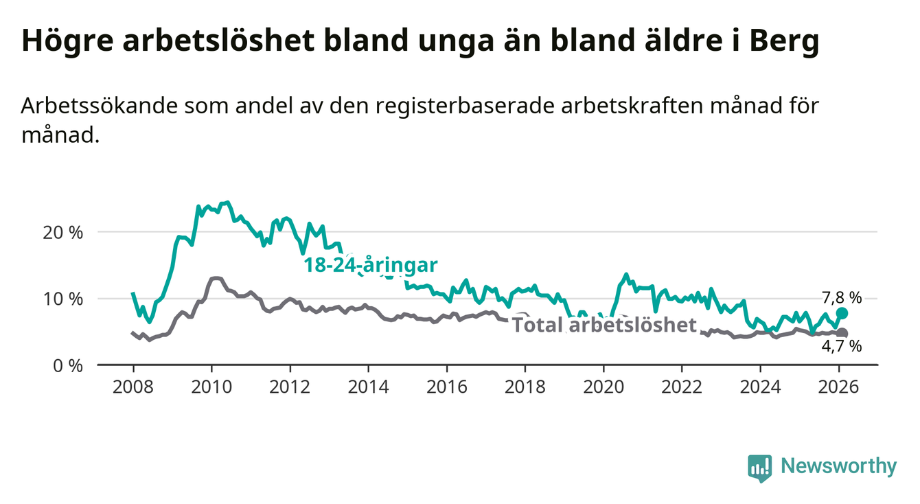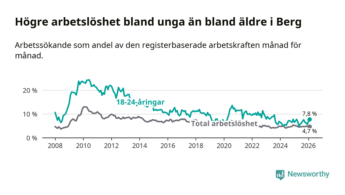 Till skillnad från den totala arbetslösheten stiger arbetslösheten bland unga (+0,7 procentenheter). I februari var 7,8 procent av 18–24-åringarna inskrivna som arbetssökande (motsvarande 25 personer). Mäter vi antalet inskrivna ser vi en ökning med tre personer på ett års sikt.