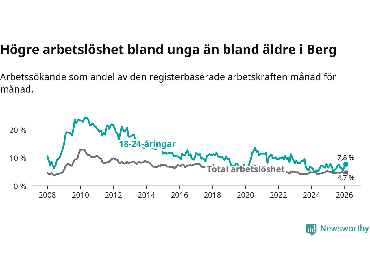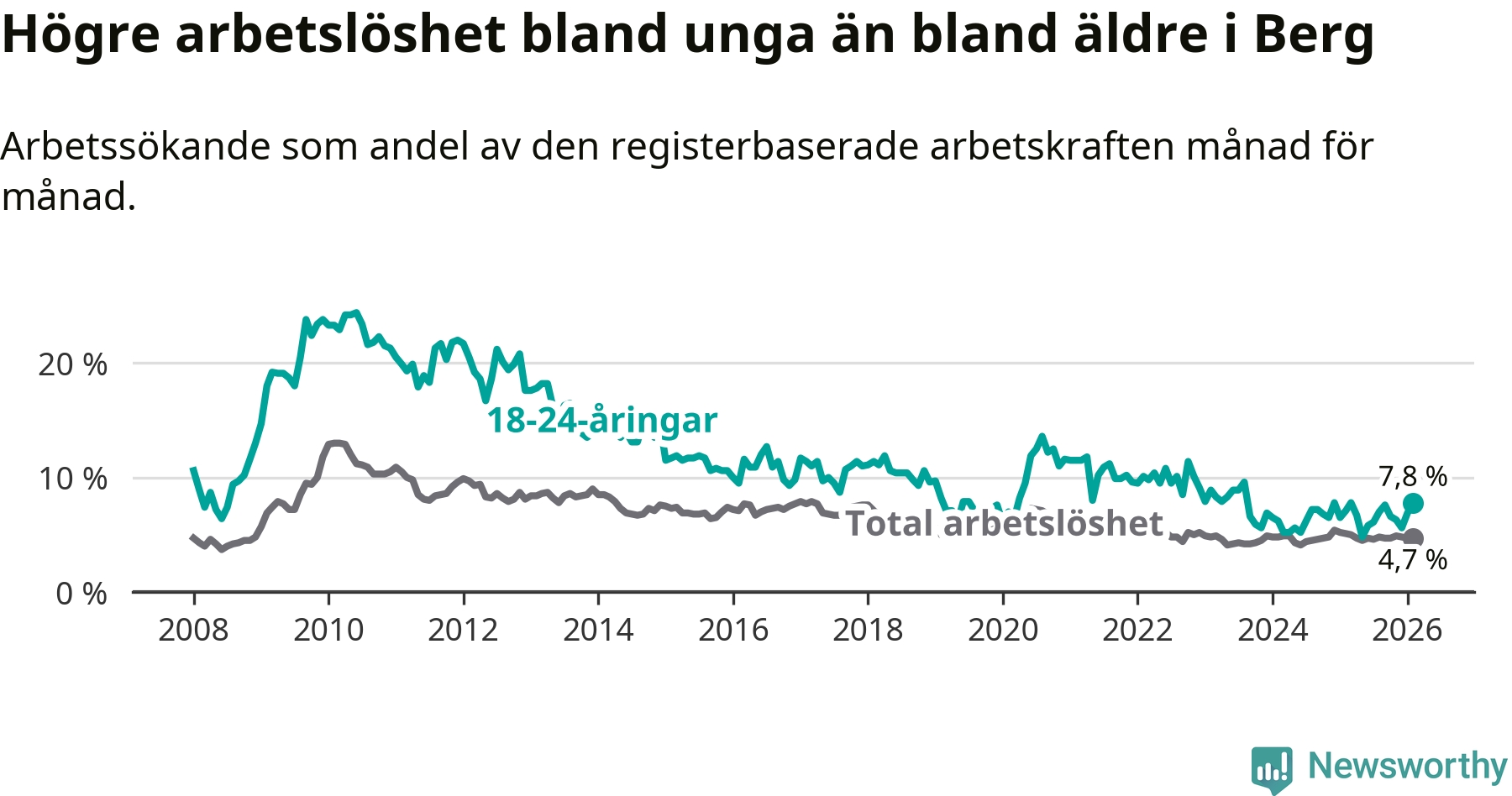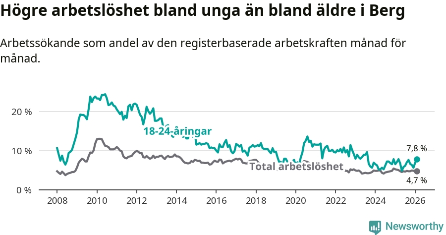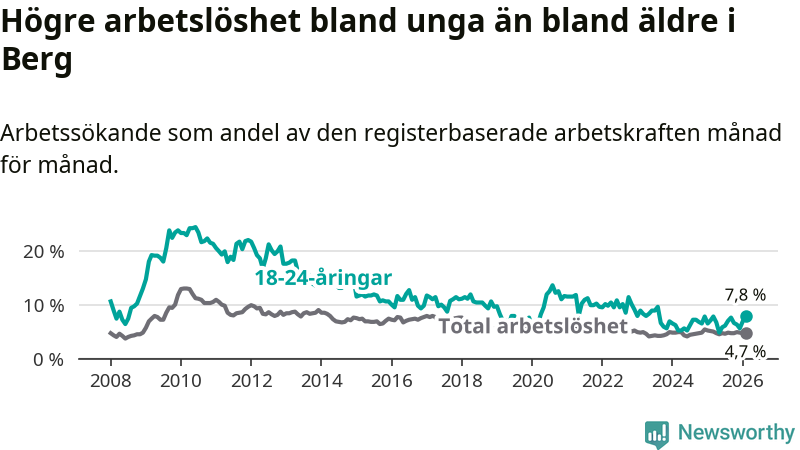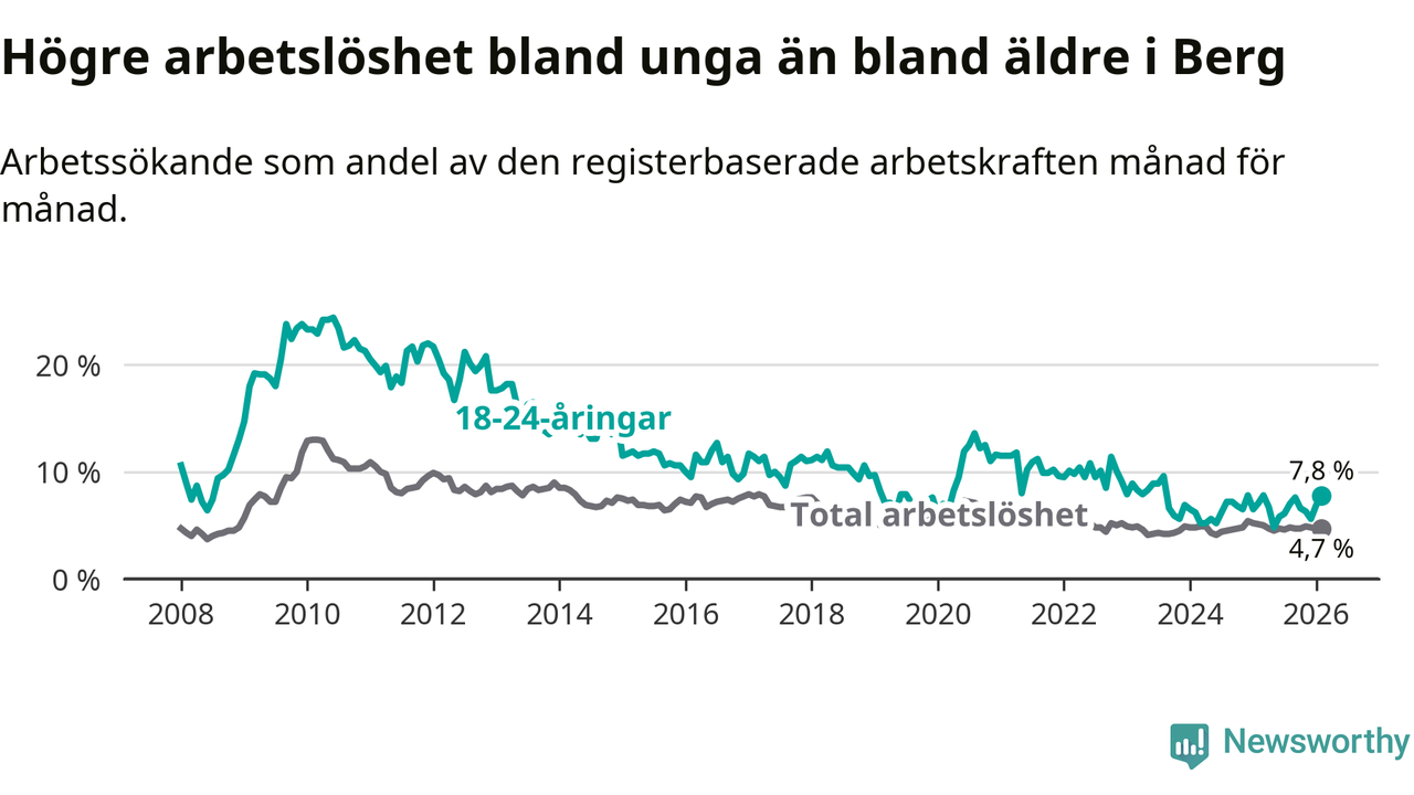 Till skillnad från den totala arbetslösheten stiger arbetslösheten bland unga (+0,7 procentenheter). I februari var 7,8 procent av 18–24-åringarna inskrivna som arbetssökande (motsvarande 25 personer). Mäter vi antalet inskrivna ser vi en ökning med tre personer på ett års sikt.