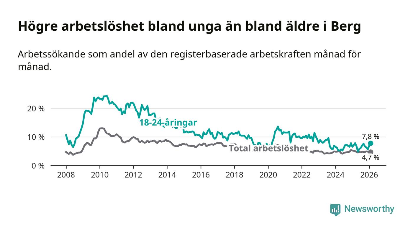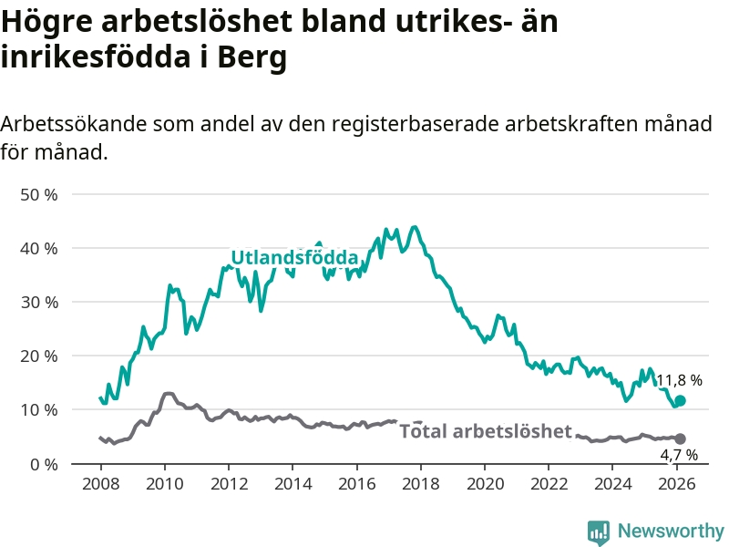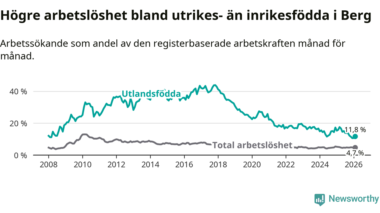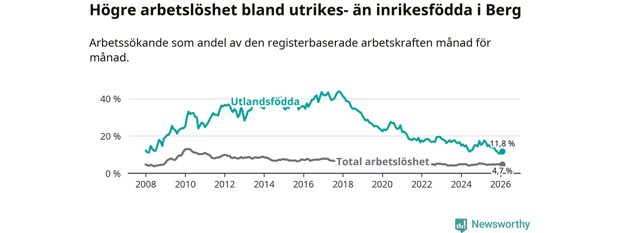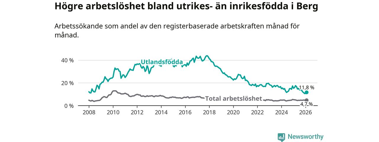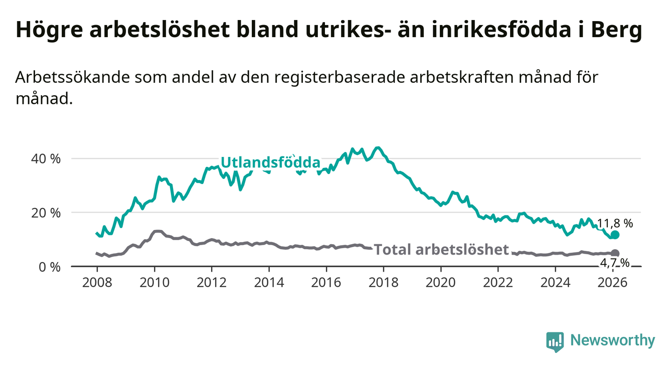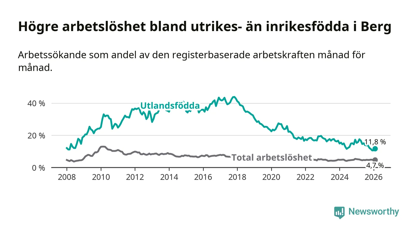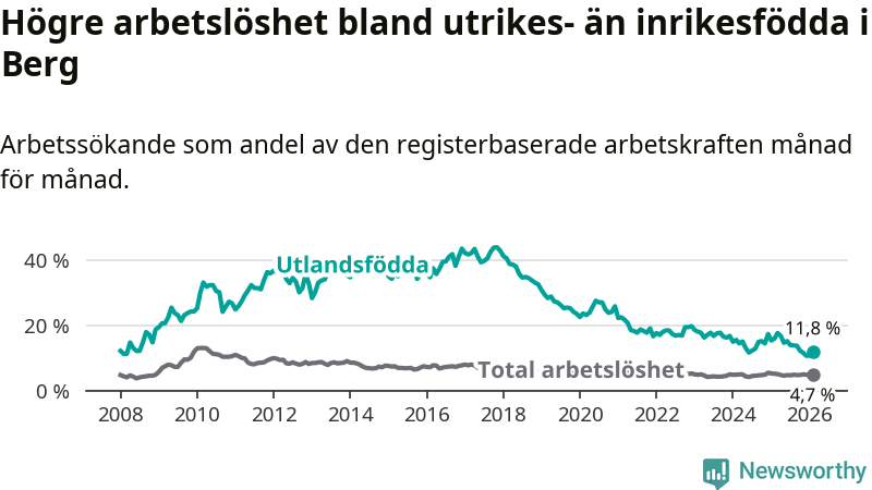 Arbetslösheten bland utlandsfödda var 11,8 procent i Berg under februari månad, motsvarande 43 av 364 personer. Det är 4,1 procentenheter färre än vid samma tidpunkt i fjol (−11 om man räknar personer). Därmed är de utlandsföddas arbetslöshet lägre än vid samma tidpunkt i fjol för sjätte månaden i följd. Sedan augusti 2025 har arbetslösheten bland utlandsfödda minskat från 13,8 till 11,8 procent.