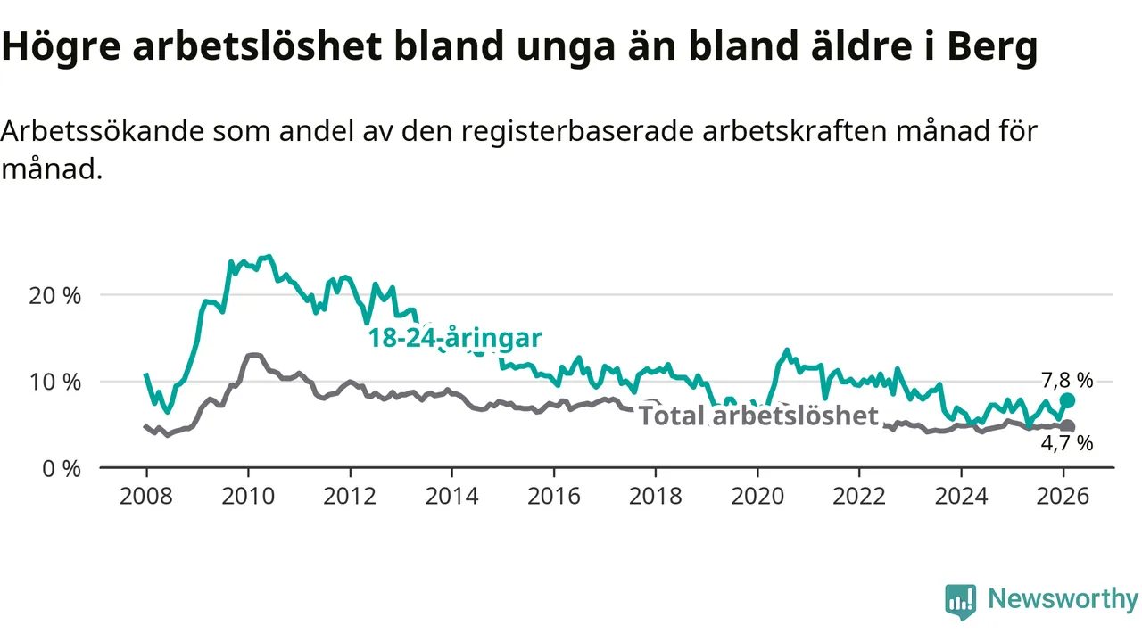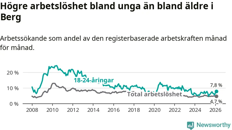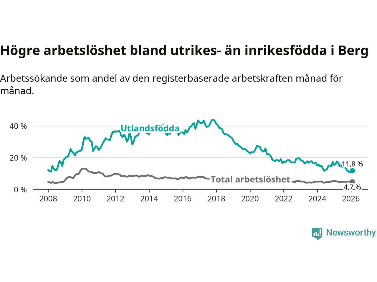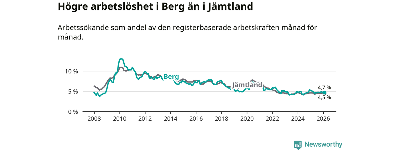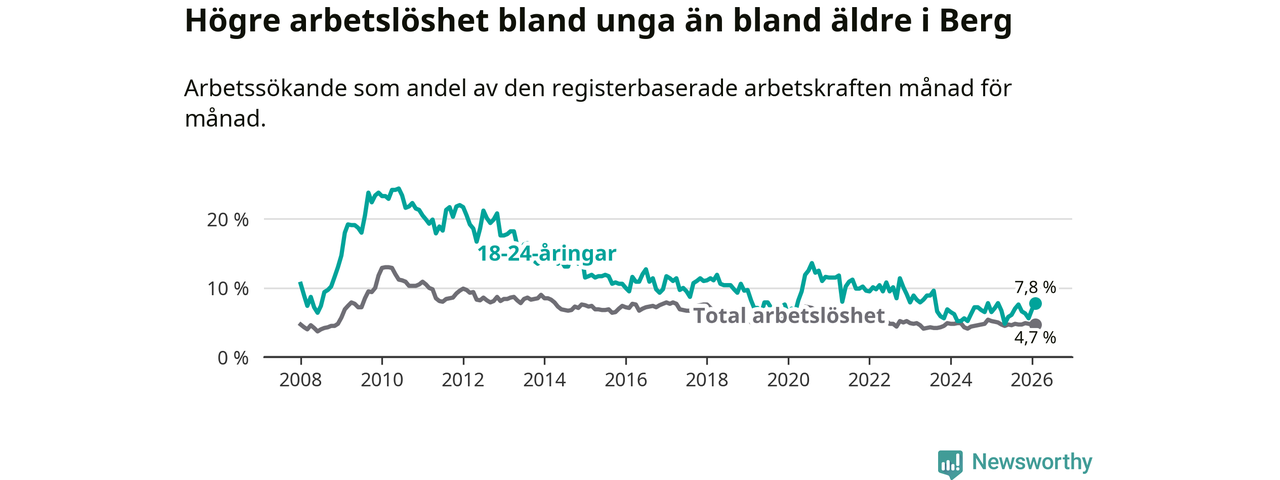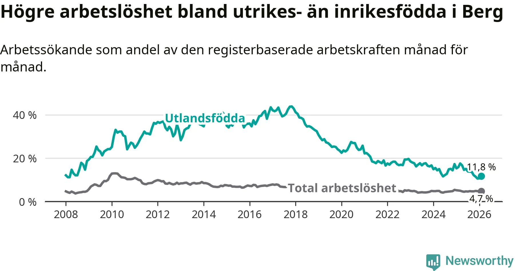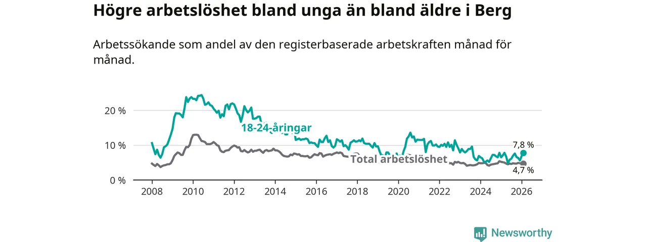 Arbetslösheten bland utlandsfödda var 11,8 procent i Berg under februari månad, motsvarande 43 av 364 personer. Det är 4,1 procentenheter färre än vid samma tidpunkt i fjol (−11 om man räknar personer). Därmed är de utlandsföddas arbetslöshet lägre än vid samma tidpunkt i fjol för sjätte månaden i följd. Sedan augusti 2025 har arbetslösheten bland utlandsfödda minskat från 13,8 till 11,8 procent.