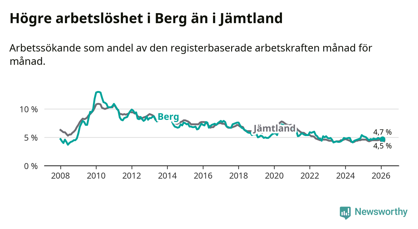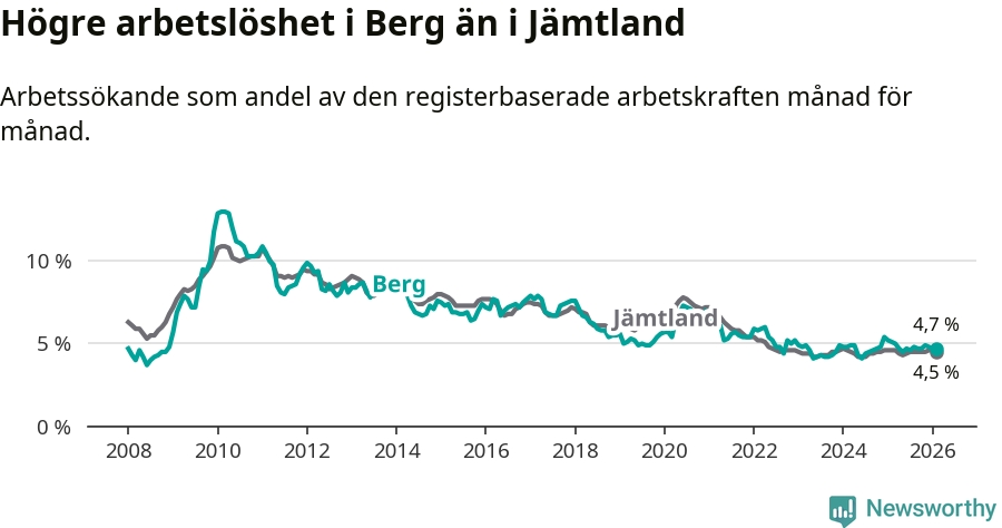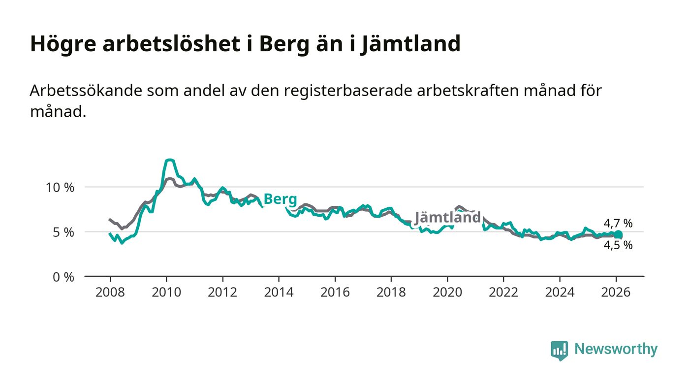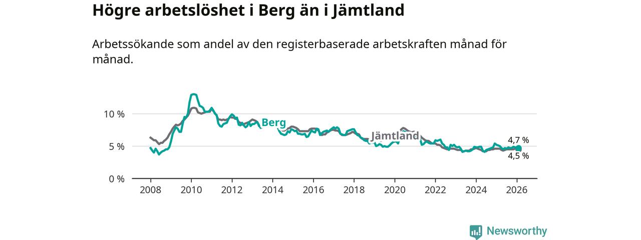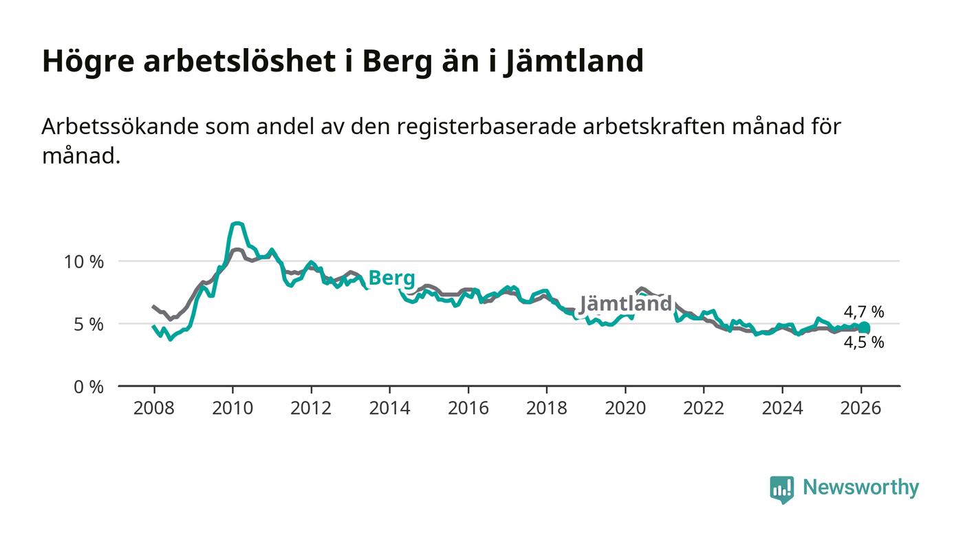 Under februari månad rapporterade Bergs kommun en total arbetslöshet på 4,7 procent. Det är en minskning jämfört med samma tidpunkt i fjol (−0,4 procentenheter). Även i Jämtlands län sjunker arbetslösheten något.