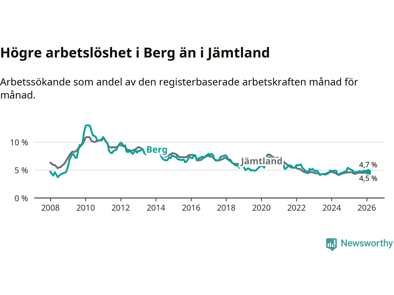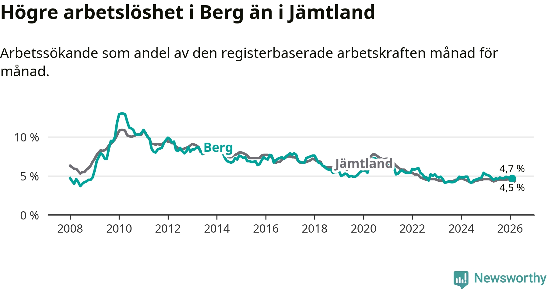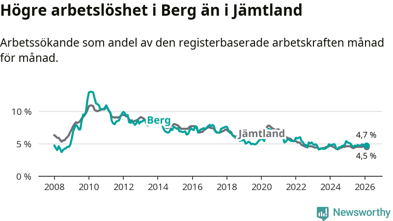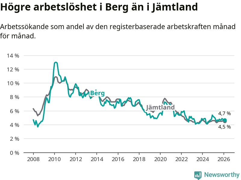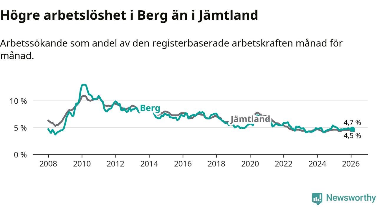 Under februari månad rapporterade Bergs kommun en total arbetslöshet på 4,7 procent. Det är en minskning jämfört med samma tidpunkt i fjol (−0,4 procentenheter). Även i Jämtlands län sjunker arbetslösheten något.