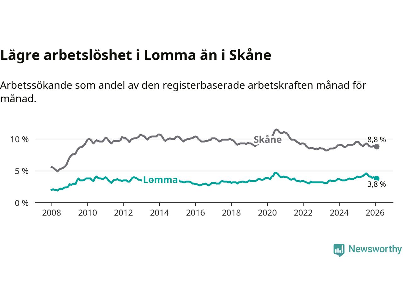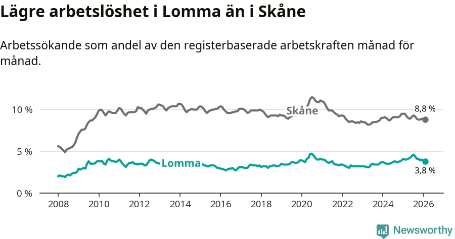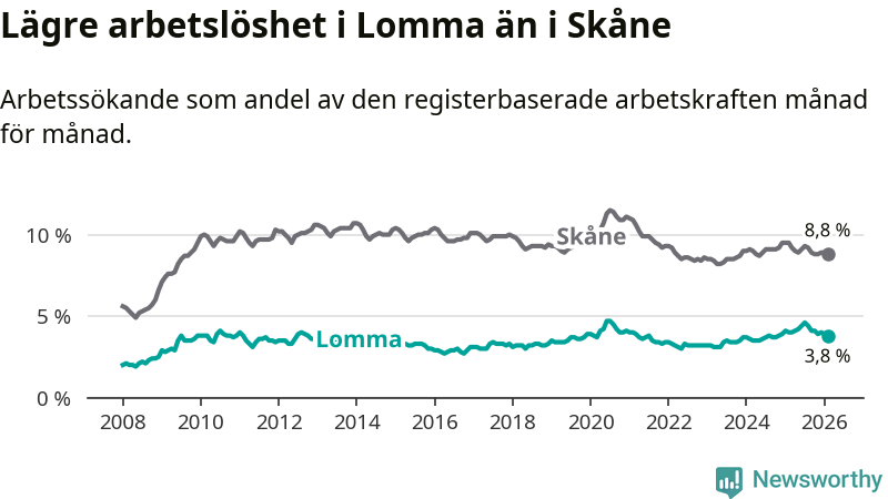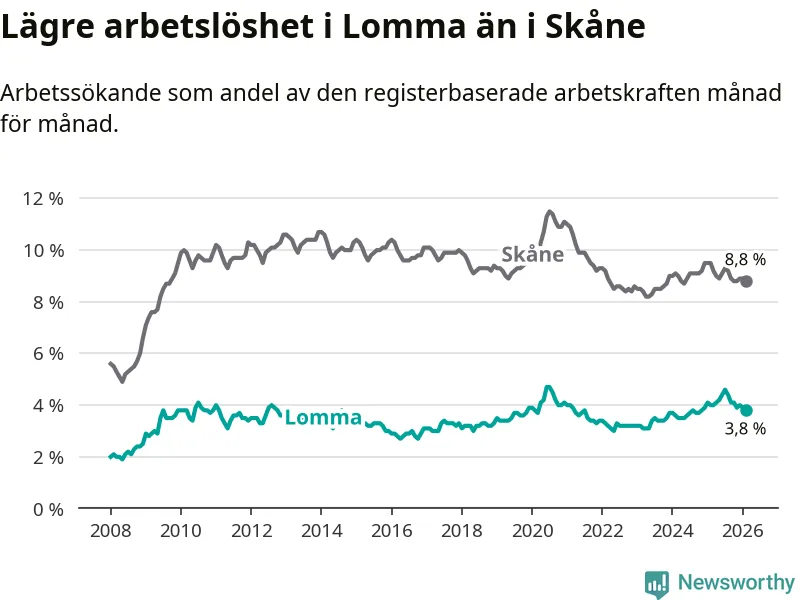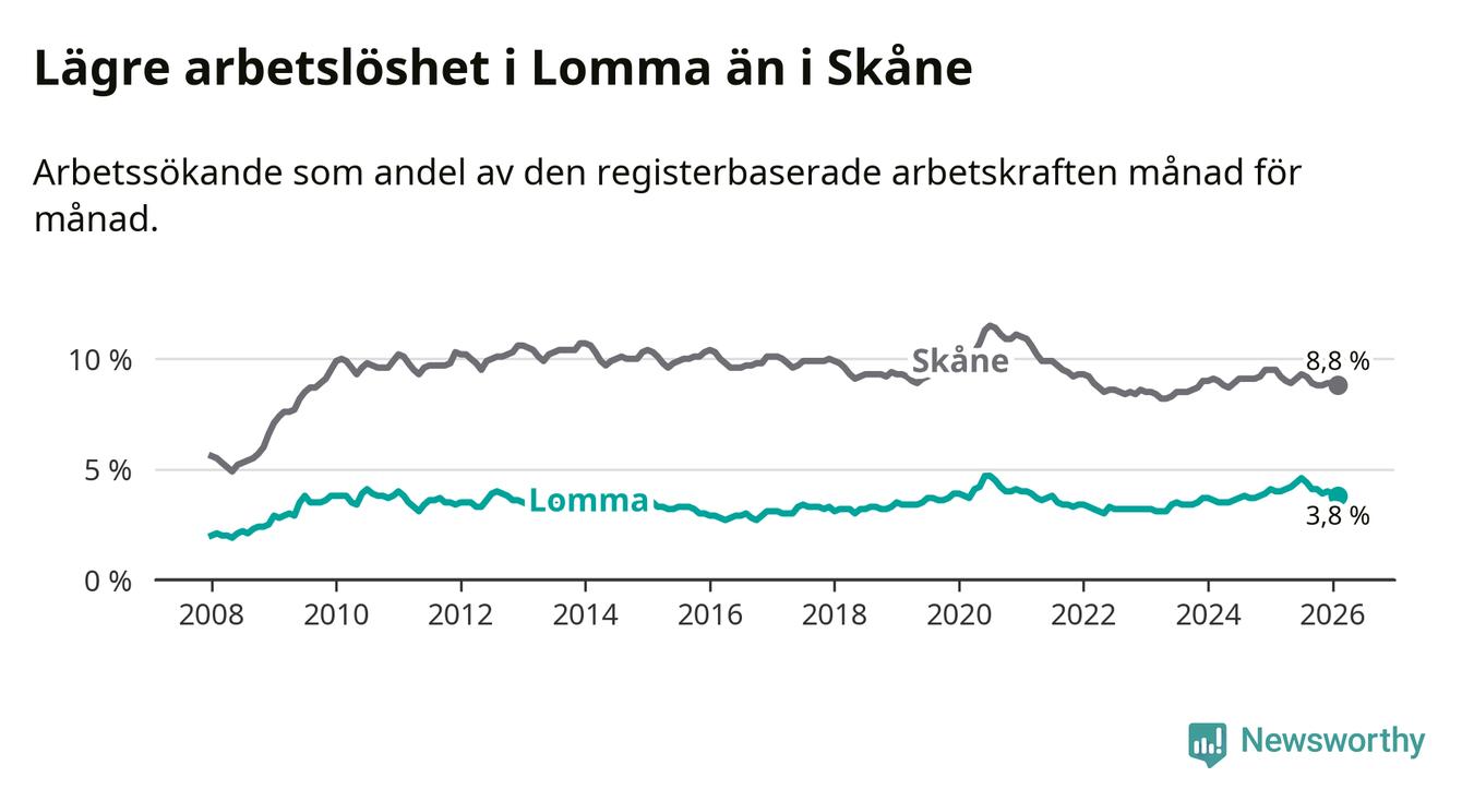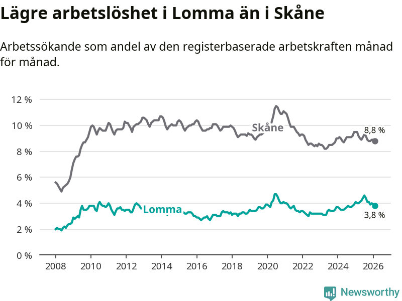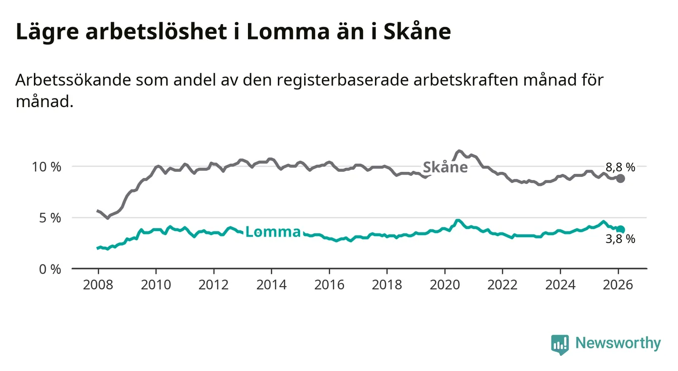 Lomma hade redan tidigare lägre arbetslöshet än snittet i hela Skåne län och nu växer klyftan (3,8 procent i kommunen, jämfört med 8,8 procent i hela länet). Lomma har därmed även den lägsta arbetslöshetsnivån i länet. Perstorp har den högsta (13,2 procent).