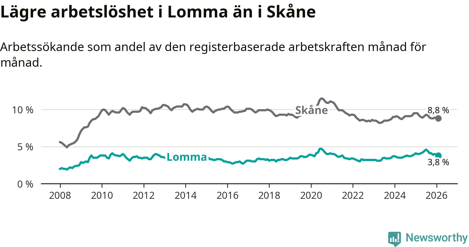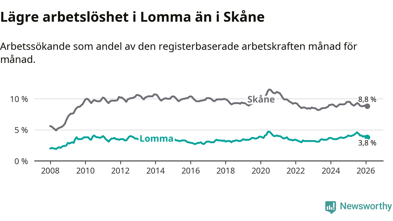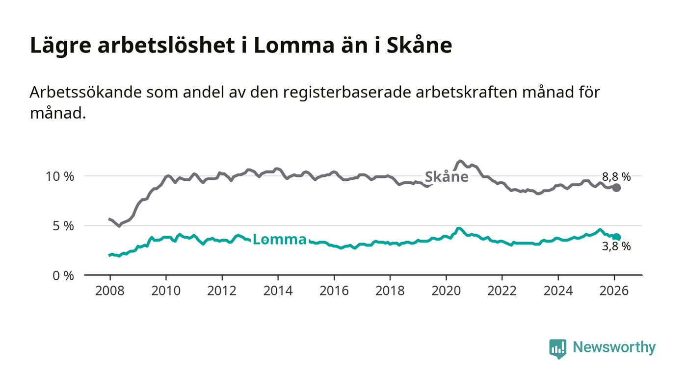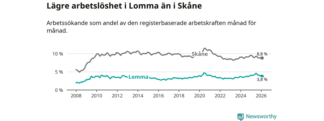 Under februari månad rapporterade Lomma kommun en total arbetslöshet på 3,8 procent. Det är en minskning jämfört med samma tidpunkt i fjol (−0,2 procentenheter). Även i Skåne län sjunker arbetslösheten .