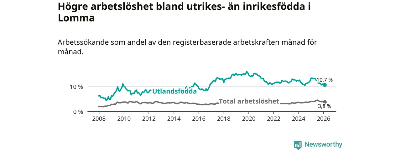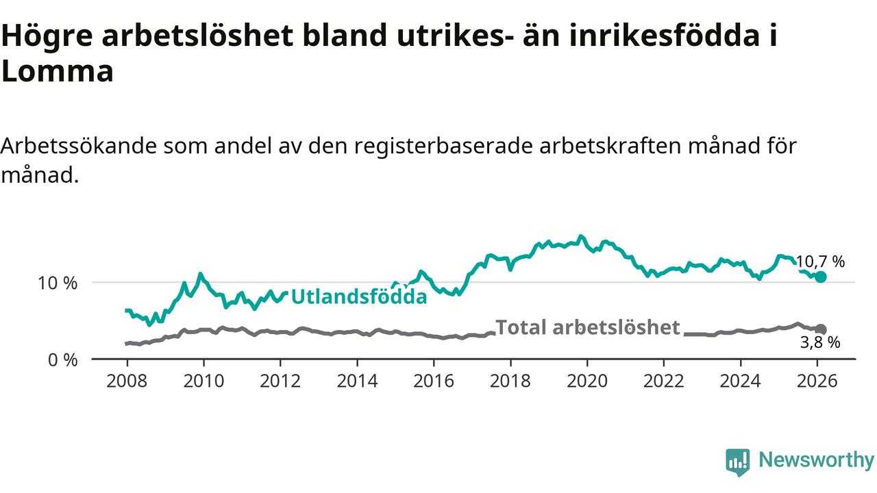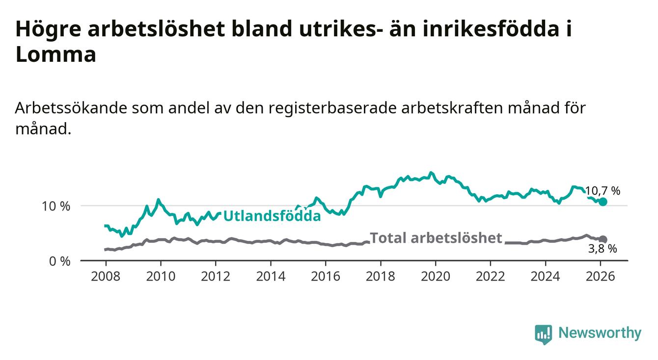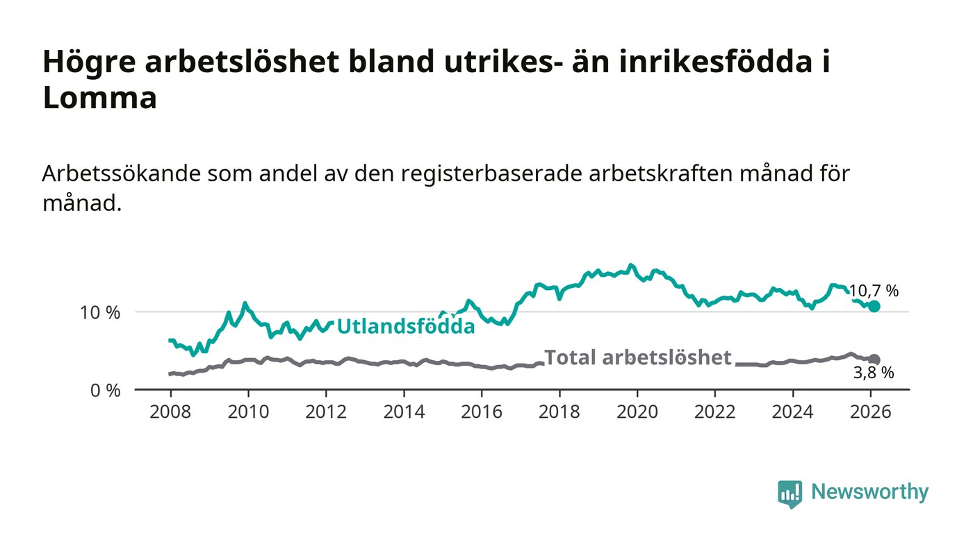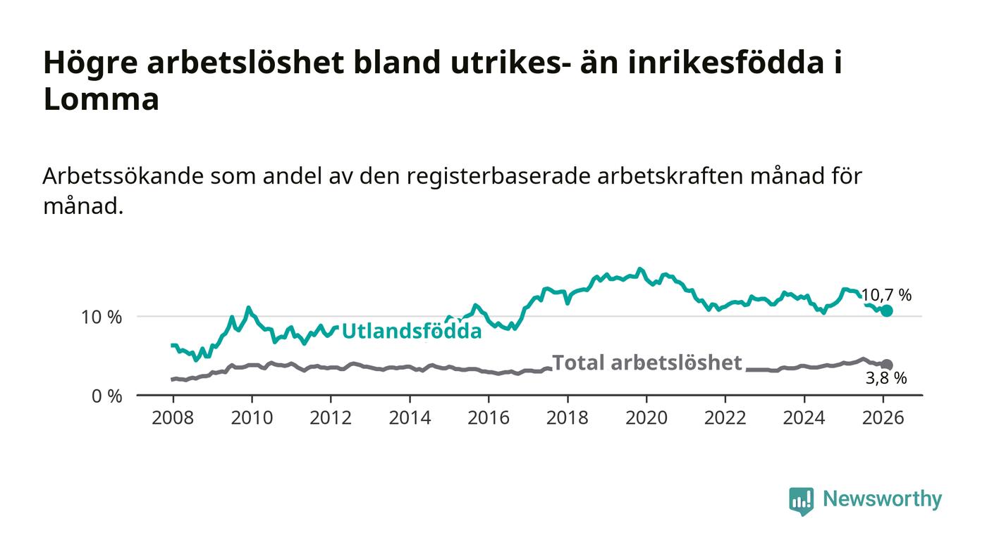 Arbetslösheten bland utlandsfödda var 10,7 procent i Lomma under februari månad, motsvarande 149 av 1 393 personer. Det är 2,7 procentenheter färre än vid samma tidpunkt i fjol (−30 om man räknar personer).
