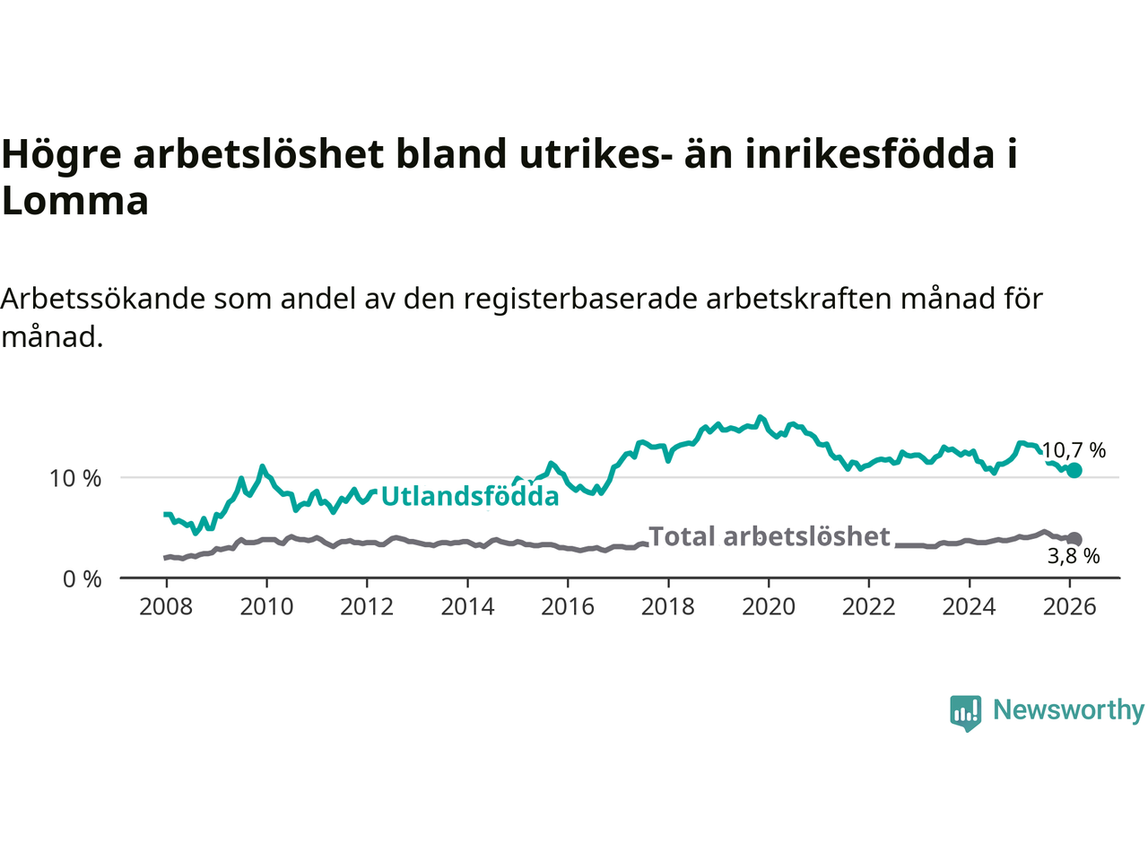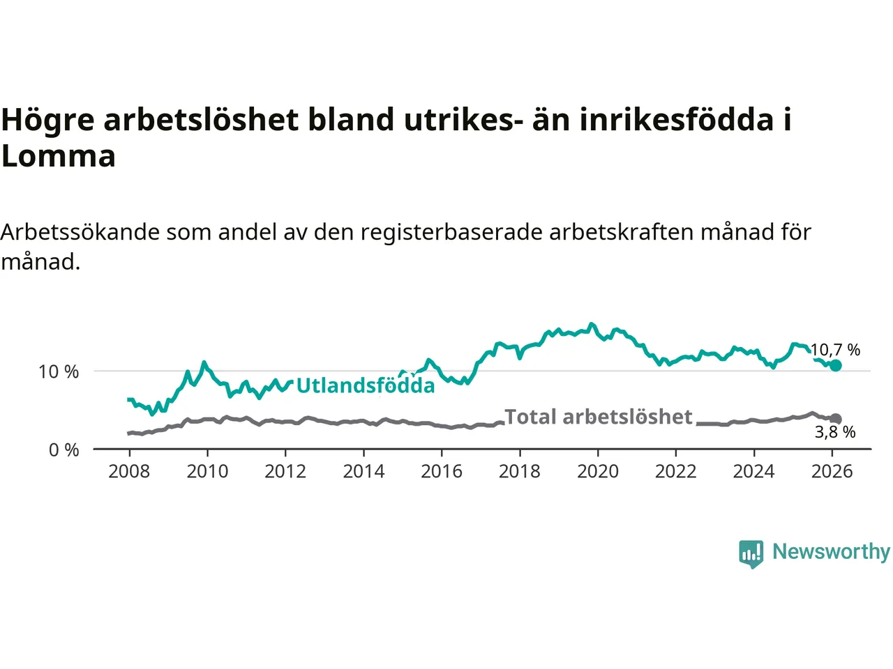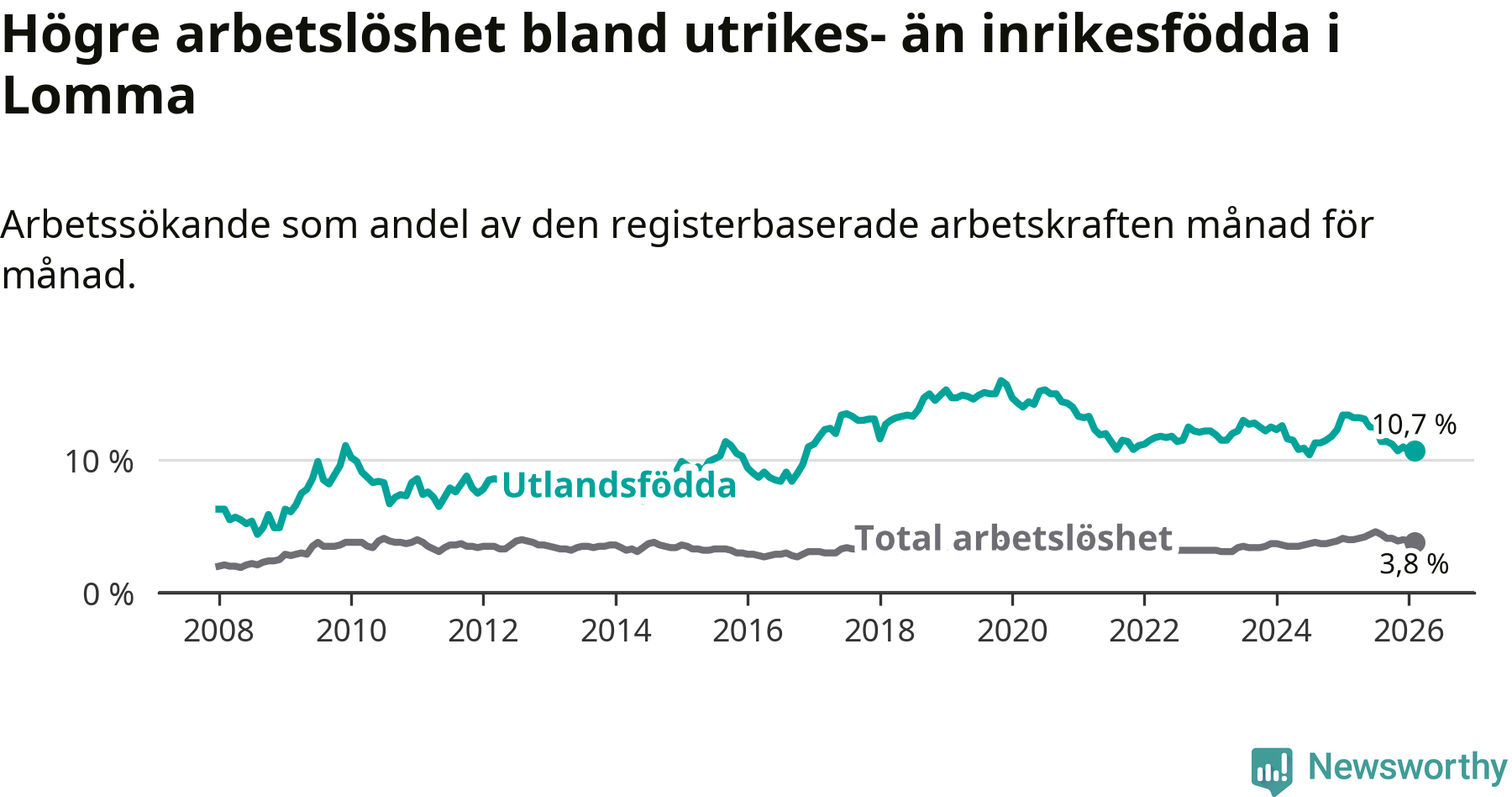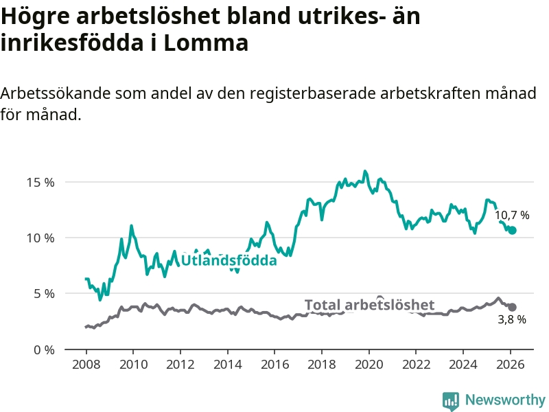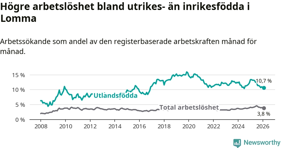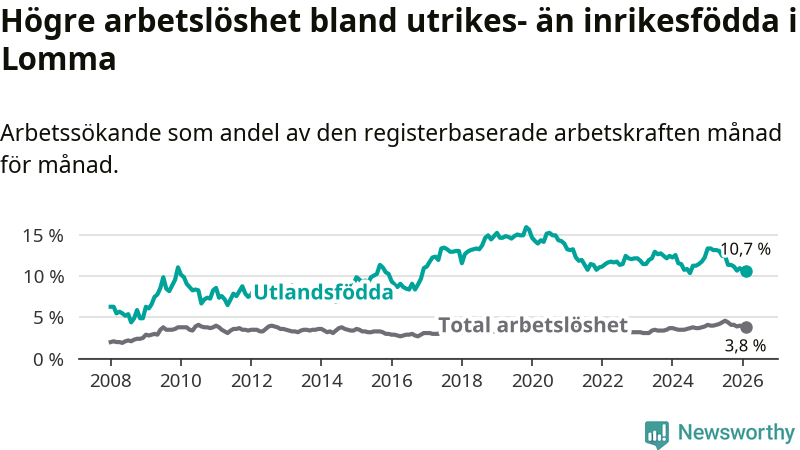 Arbetslösheten bland utlandsfödda var 10,7 procent i Lomma under februari månad, motsvarande 149 av 1 393 personer. Det är 2,7 procentenheter färre än vid samma tidpunkt i fjol (−30 om man räknar personer).