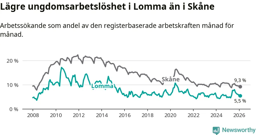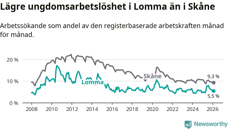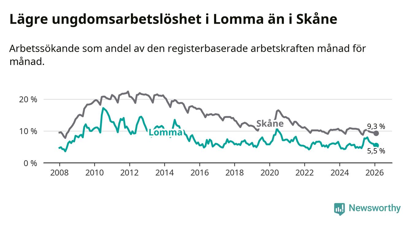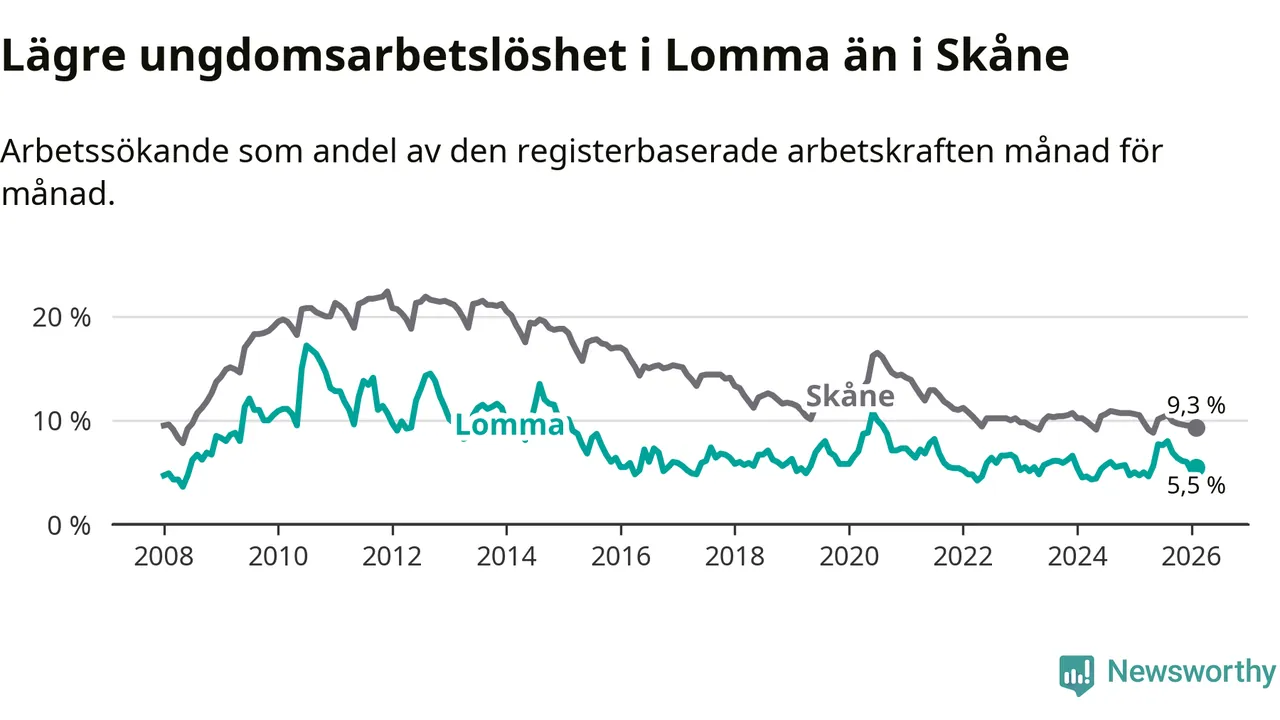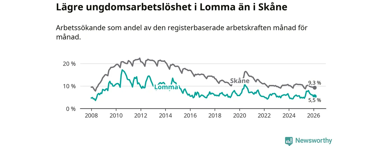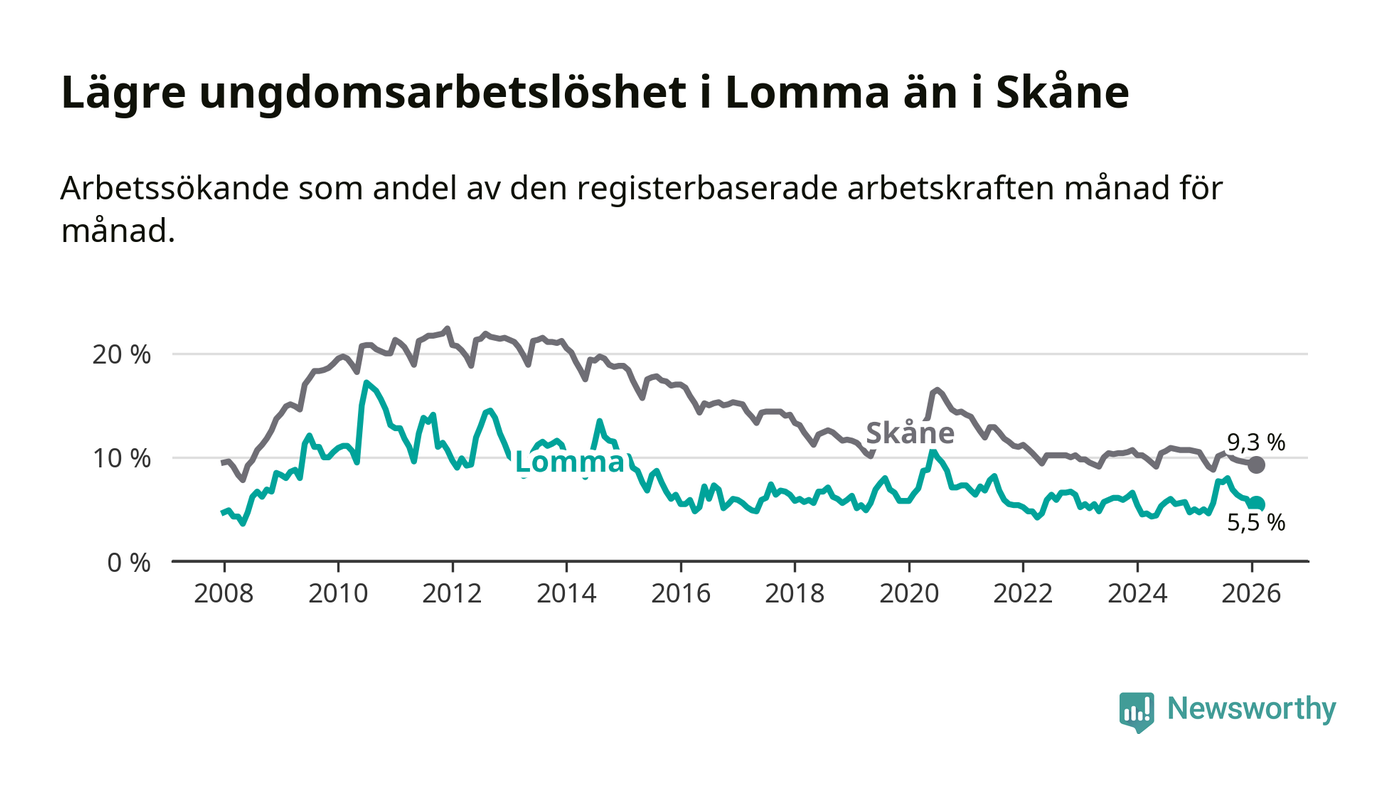 Precis som den totala arbetslösheten ligger ungdomsarbetslösheten i Lomma lägre än i Skåne som helhet. Skillnaden mellan kommunen och länet är 3,8 procentenheter.