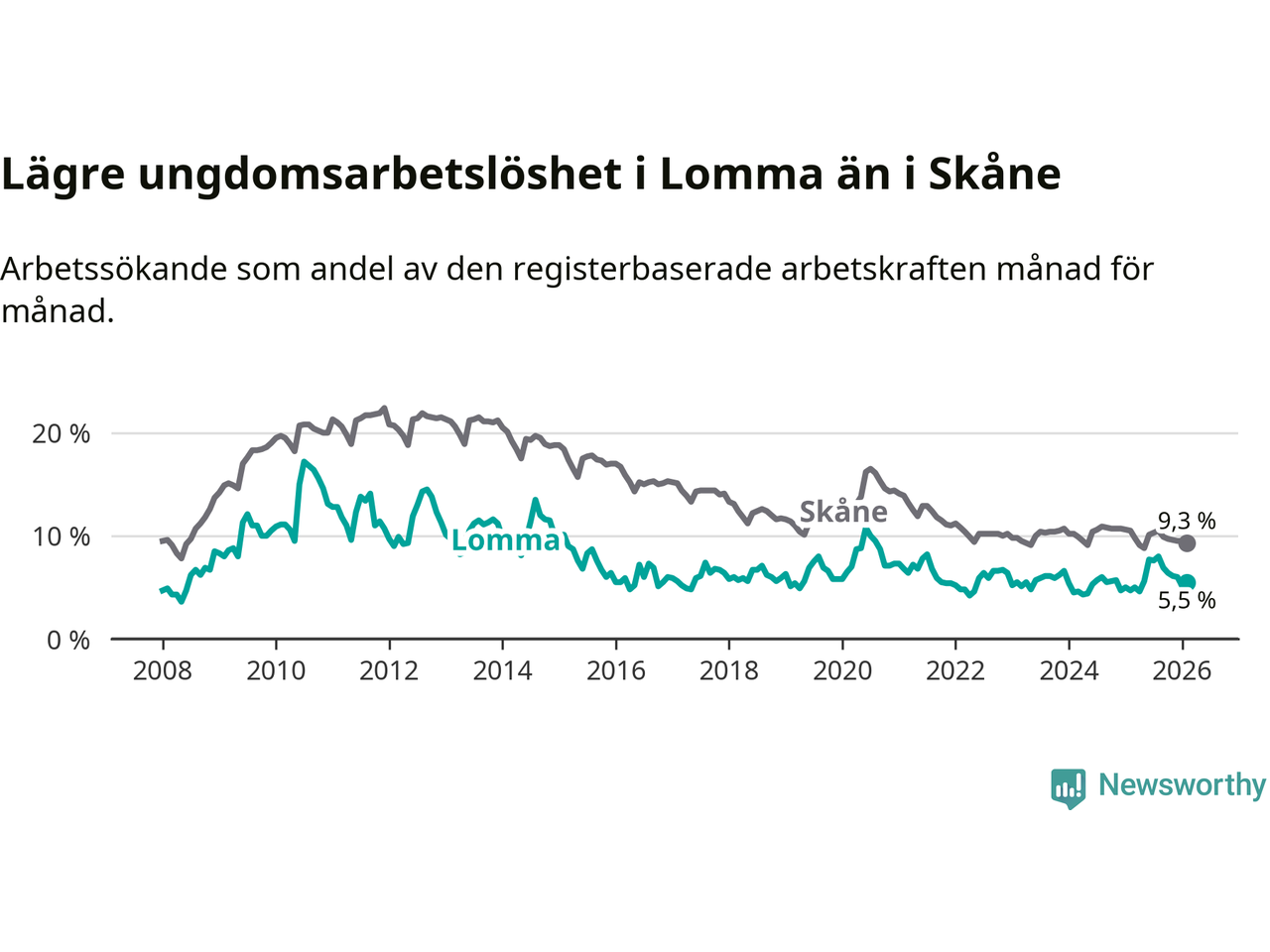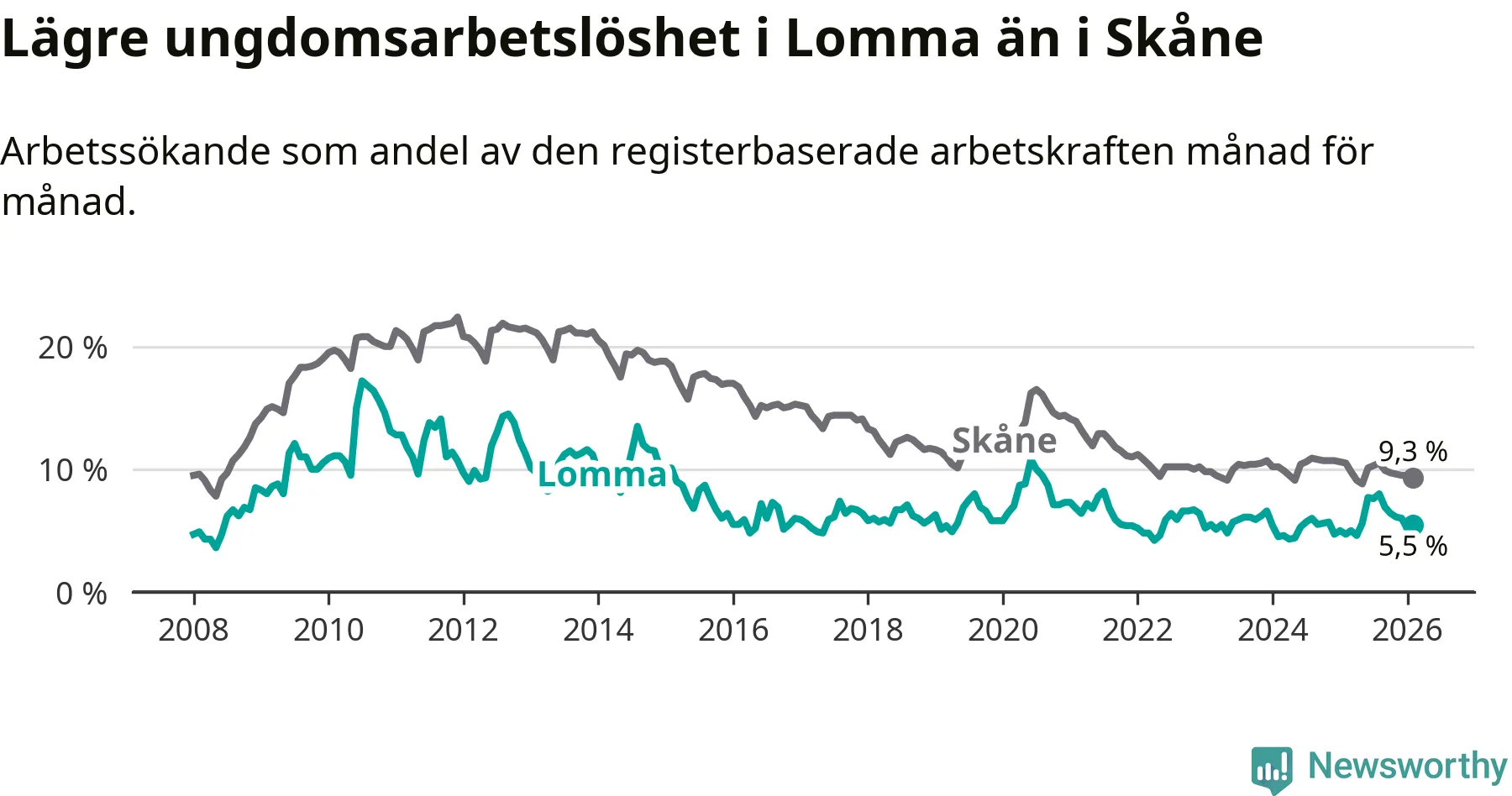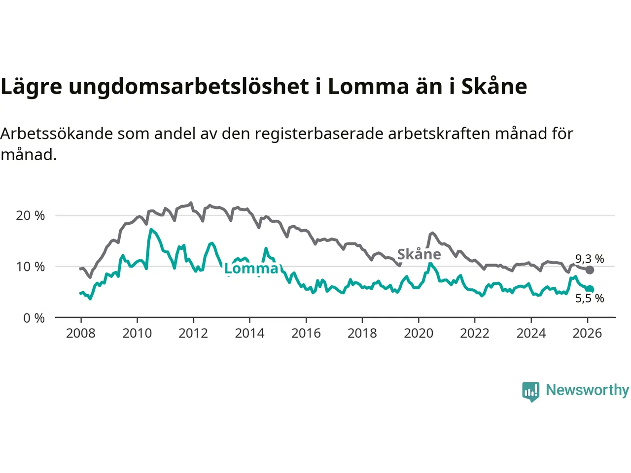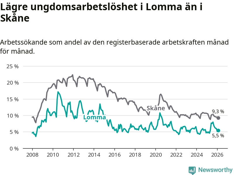 Precis som den totala arbetslösheten ligger ungdomsarbetslösheten i Lomma lägre än i Skåne som helhet. Skillnaden mellan kommunen och länet är 3,8 procentenheter.