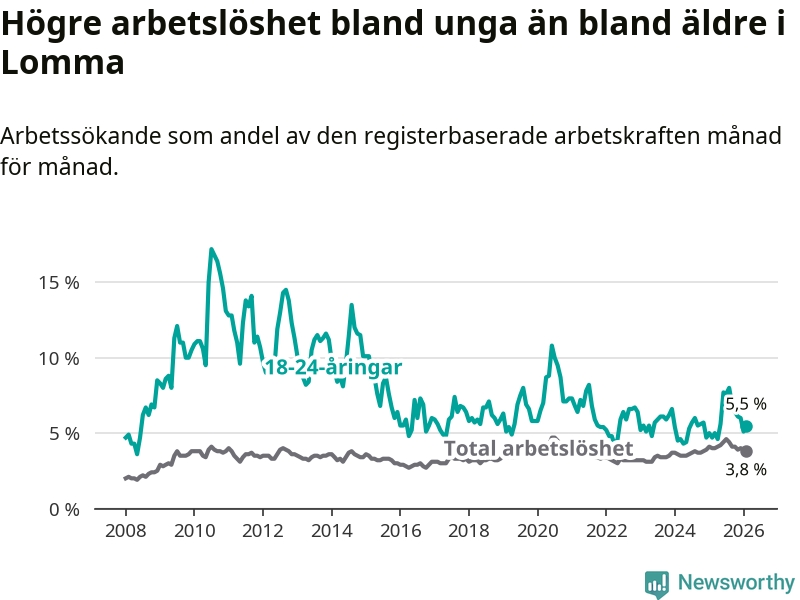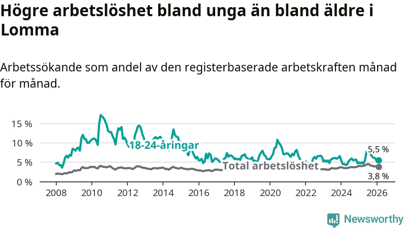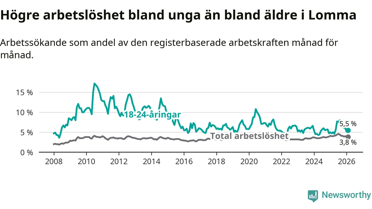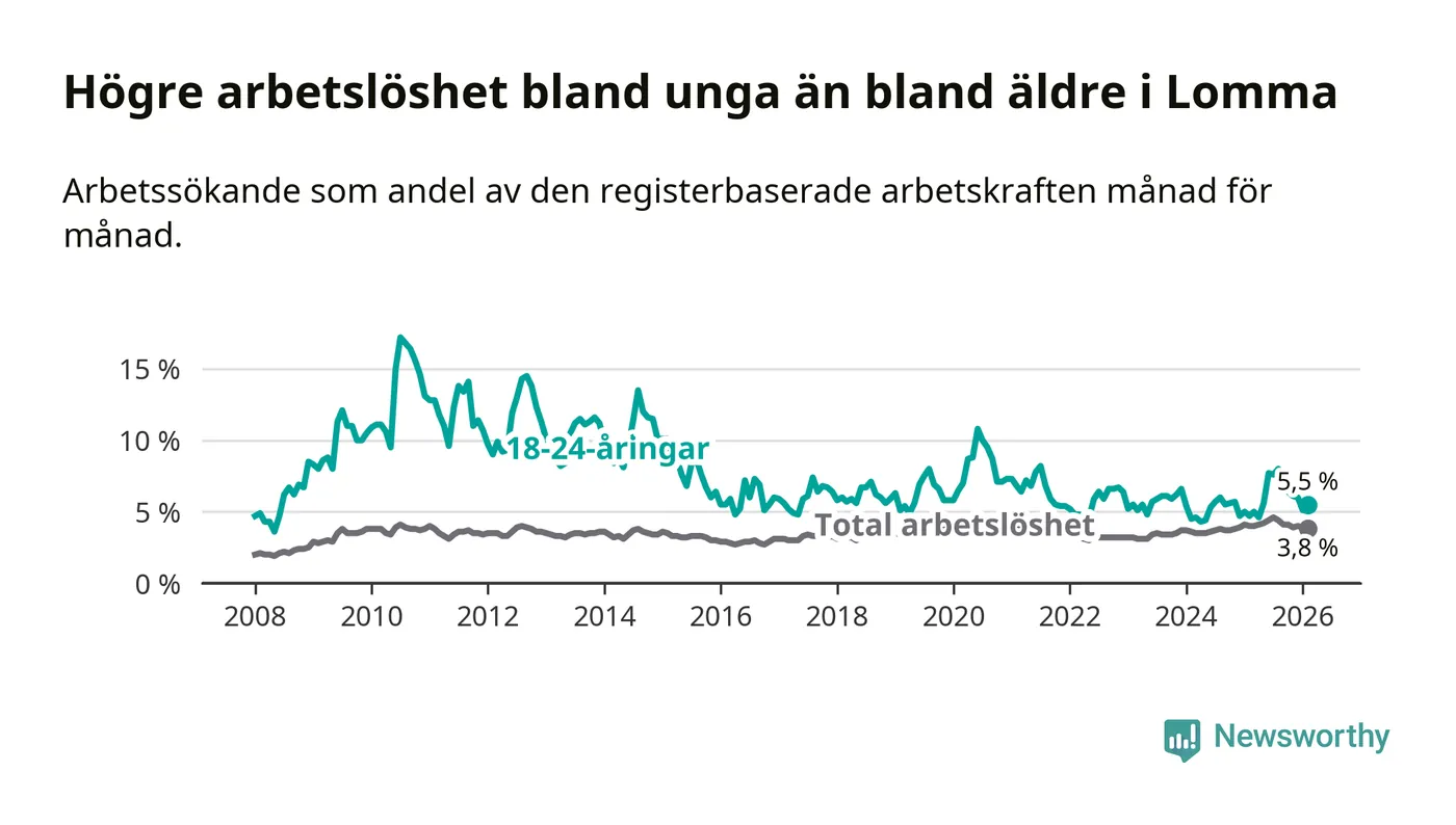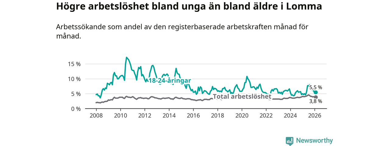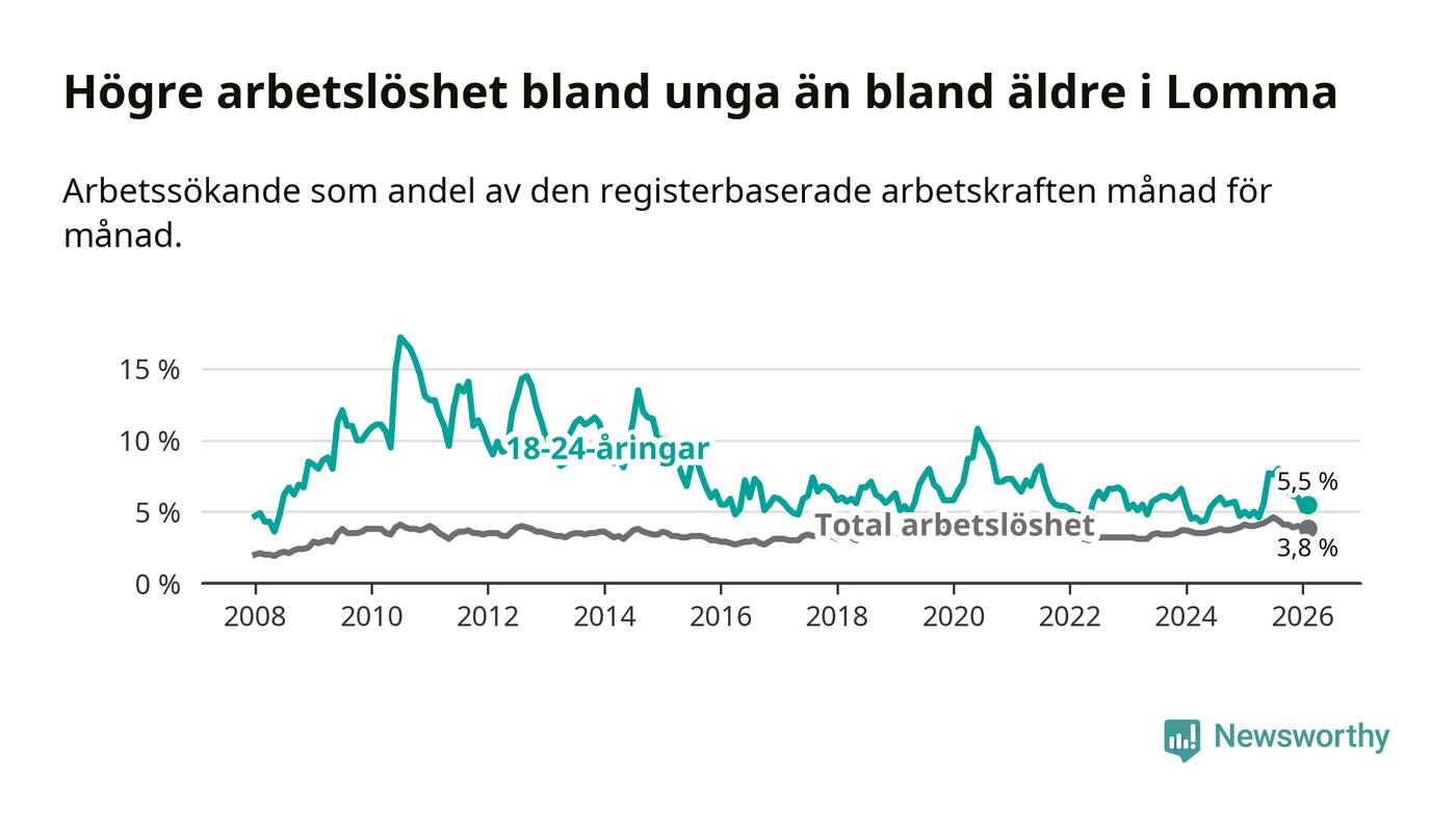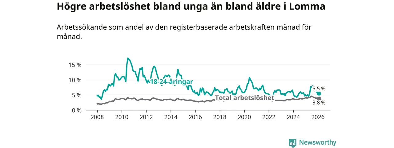 I och med den senaste månadens uppgång har de ungas arbetslöshet i Lomma stigit 13 månader i följd (upp från 5,0 procent i januari 2025 till 5,5 procent nu).