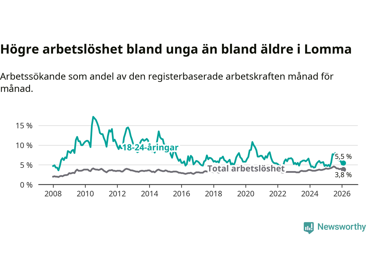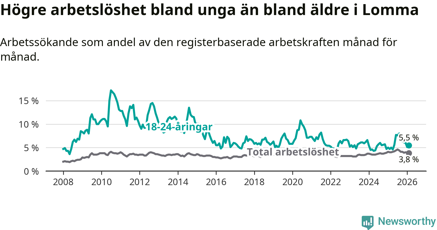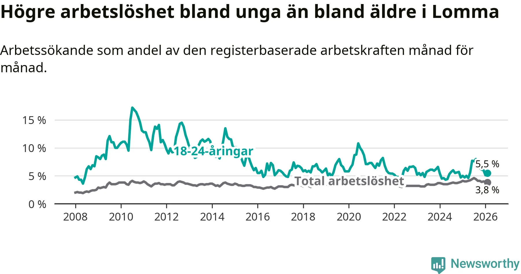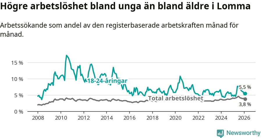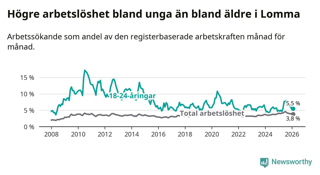 Till skillnad från den totala arbetslösheten stiger arbetslösheten bland unga (+0,8 procentenheter). I februari var 5,5 procent av 18–24-åringarna inskrivna som arbetssökande (motsvarande 55 personer). Mäter vi antalet inskrivna ser vi en ökning med elva personer på ett års sikt.