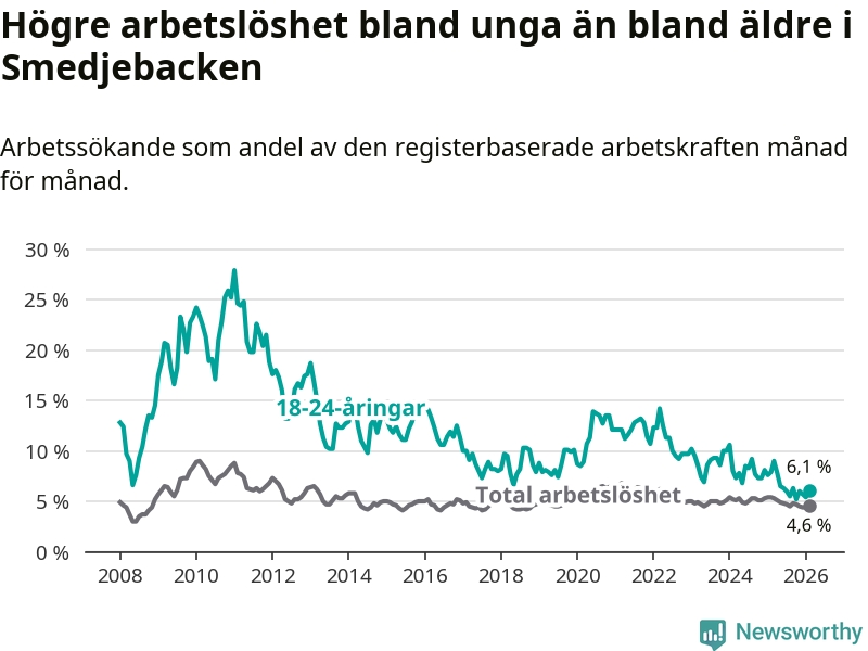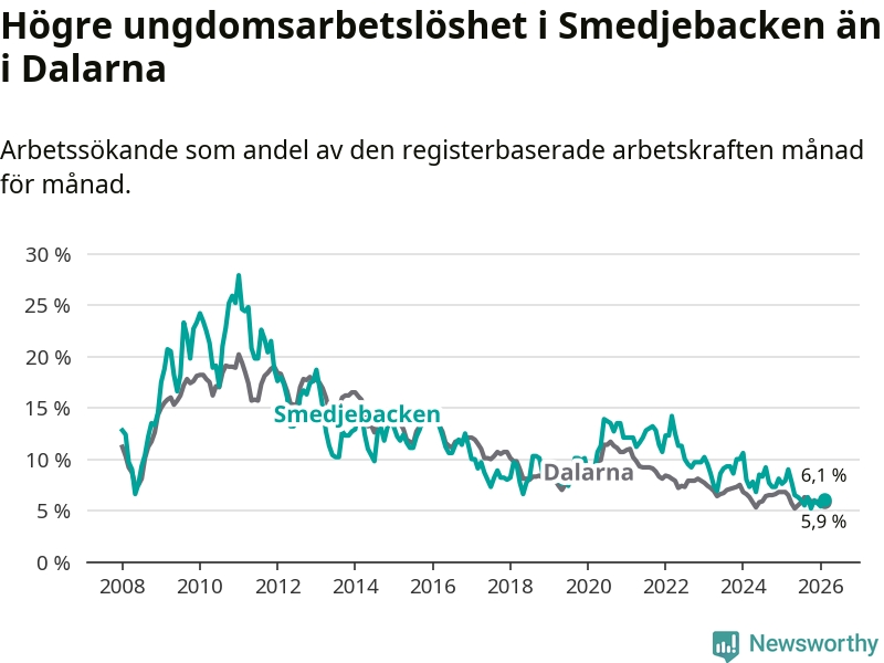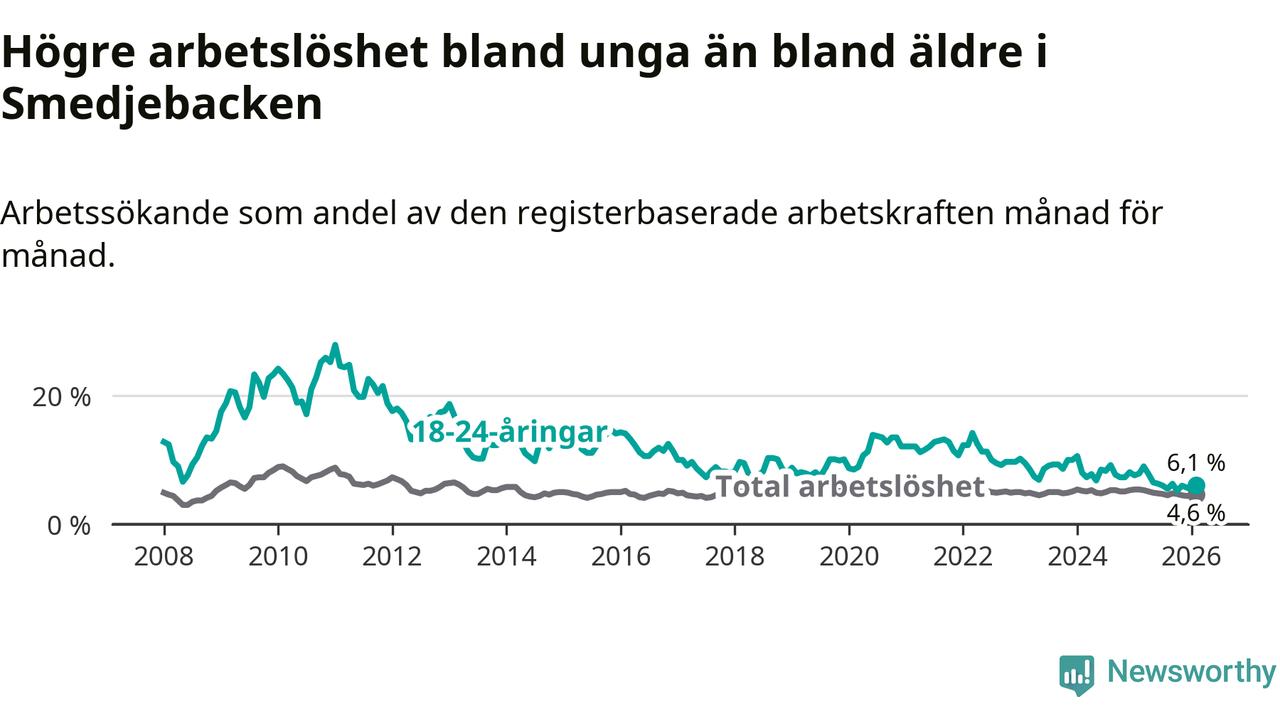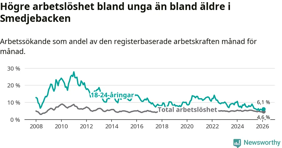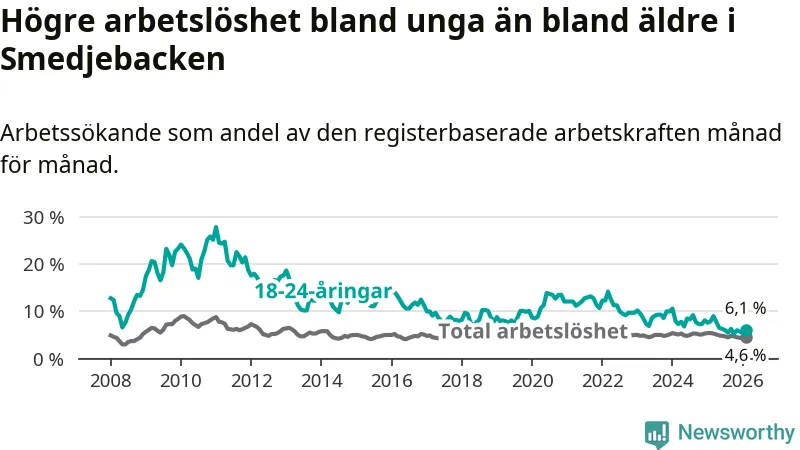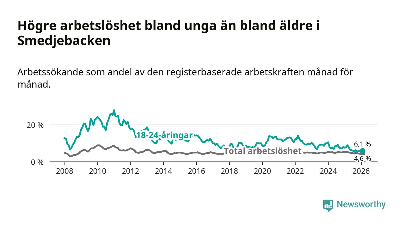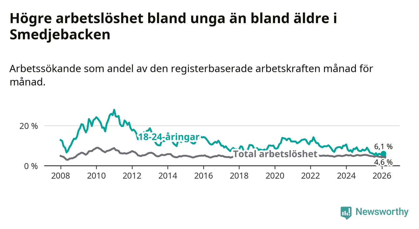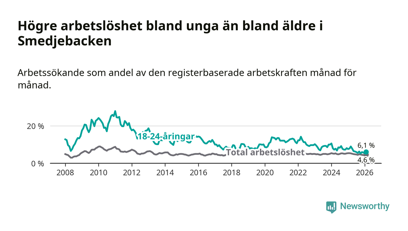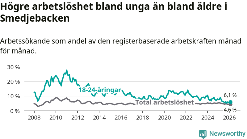 I och med den senaste månadens nedgång har de ungas arbetslöshet i Smedjebacken sjunkit tio månader i följd (ner från 7,8 procent i april 2025 till 6,1 procent nu).