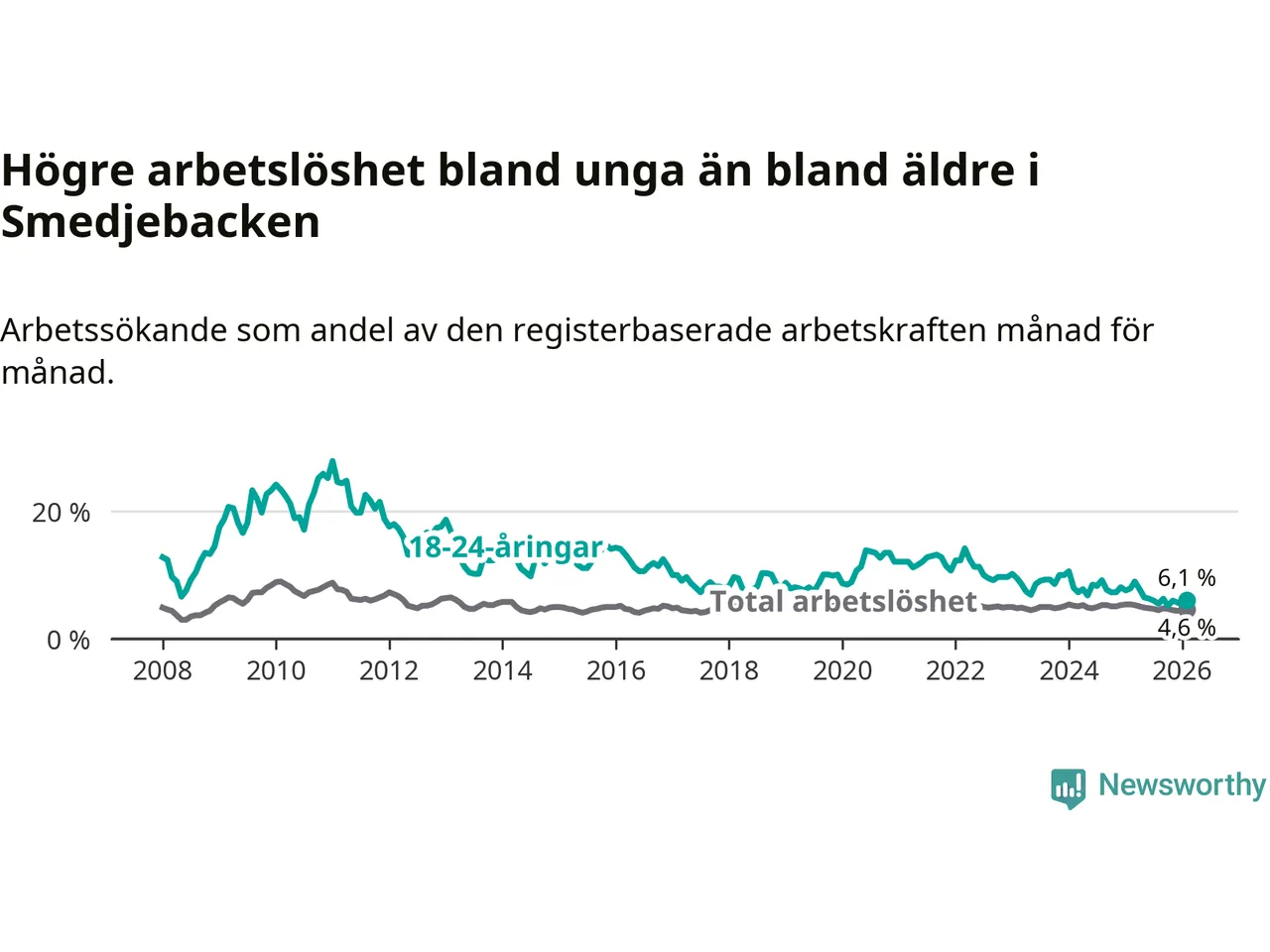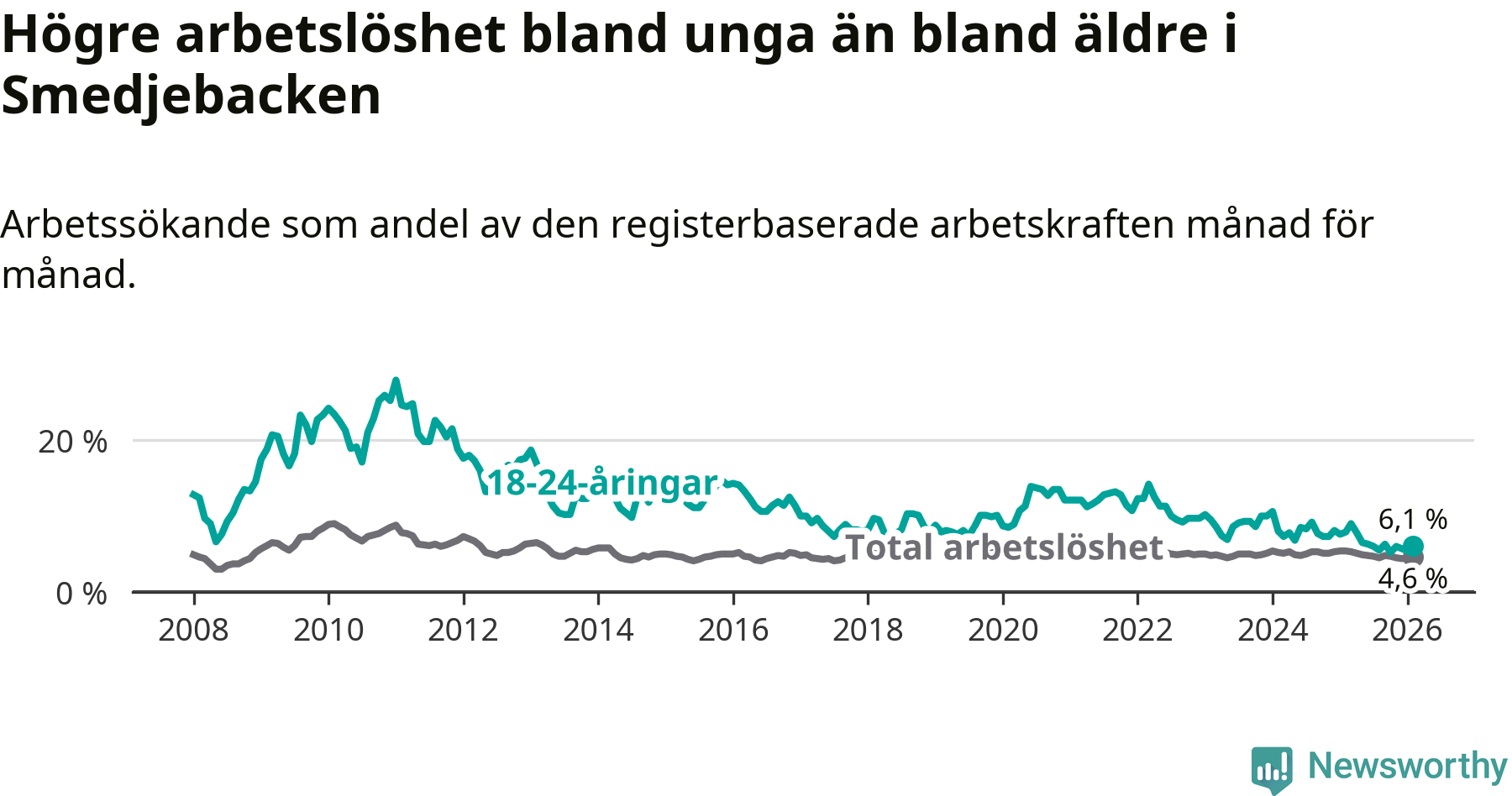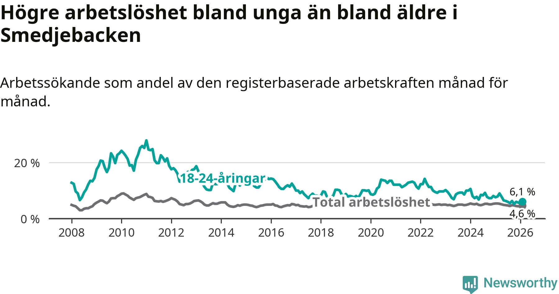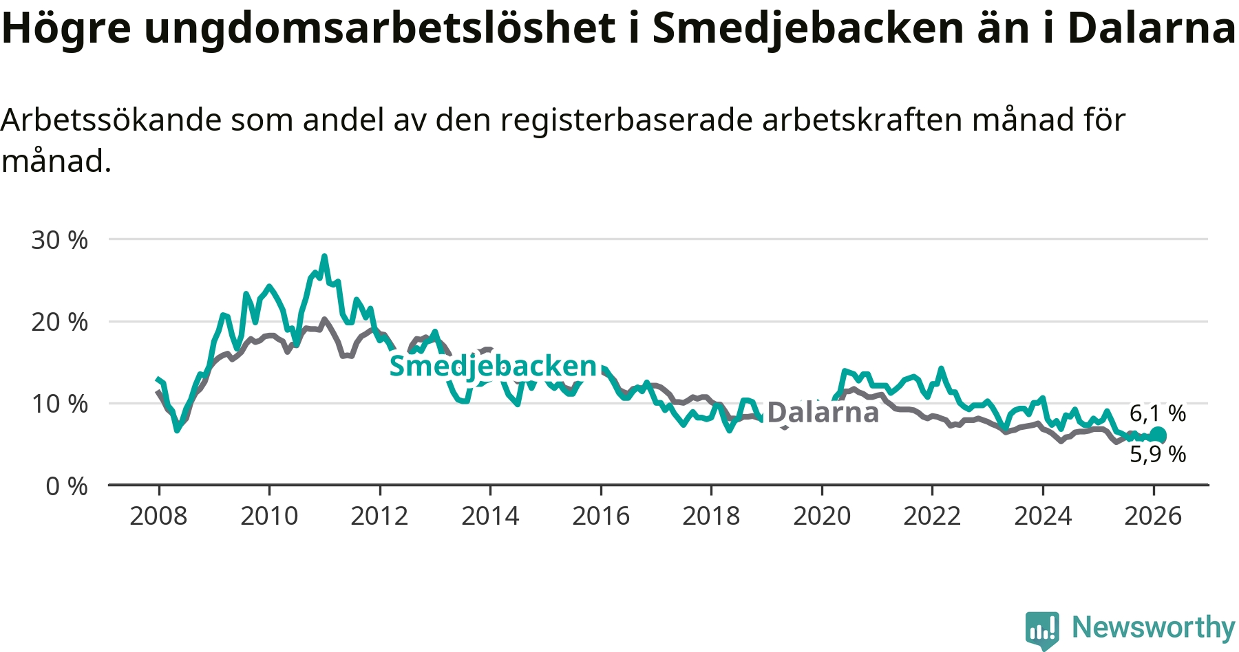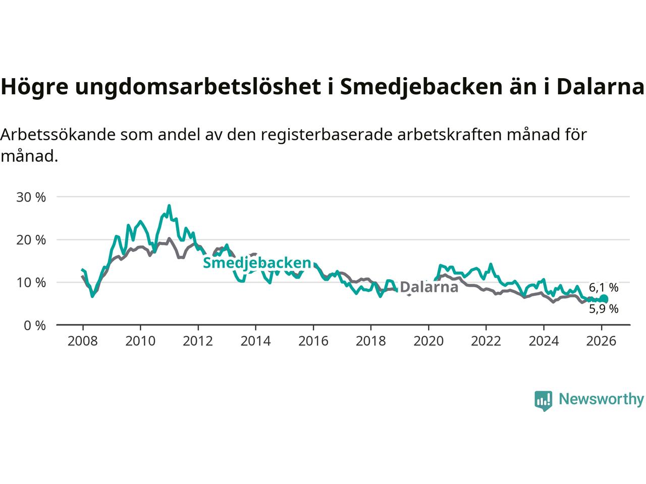I och med den senaste månadens nedgång har de ungas arbetslöshet i Smedjebacken sjunkit tio månader i följd (ner från 7,8 procent i april 2025 till 6,1 procent nu).