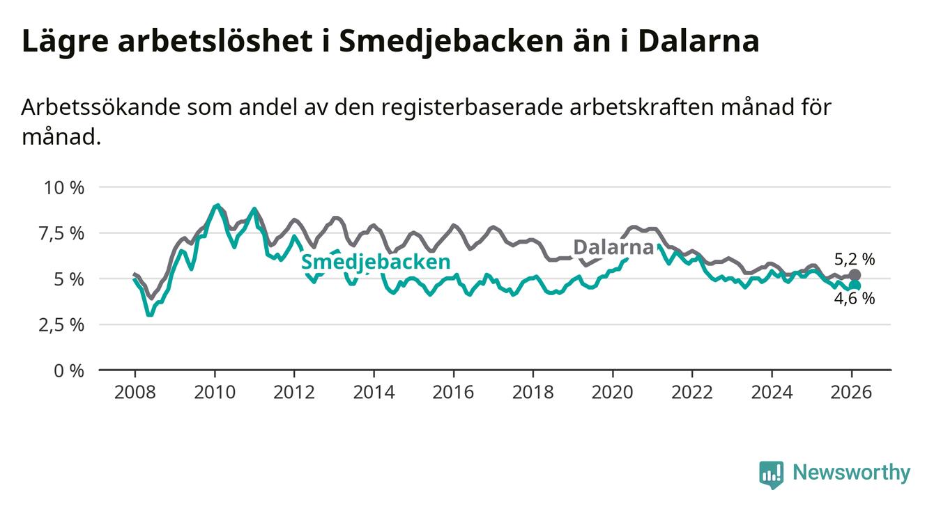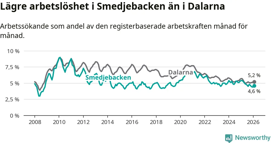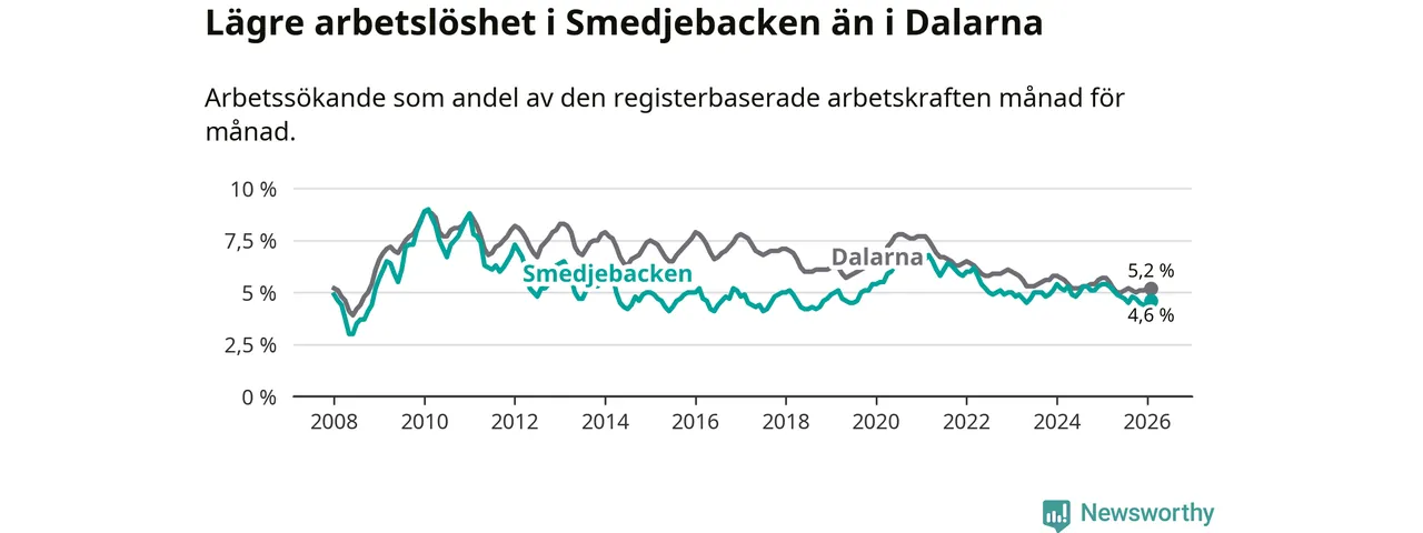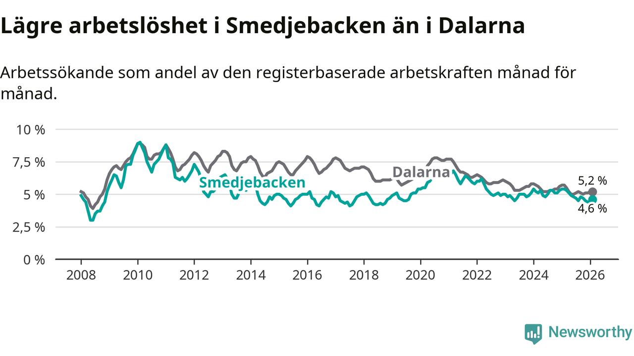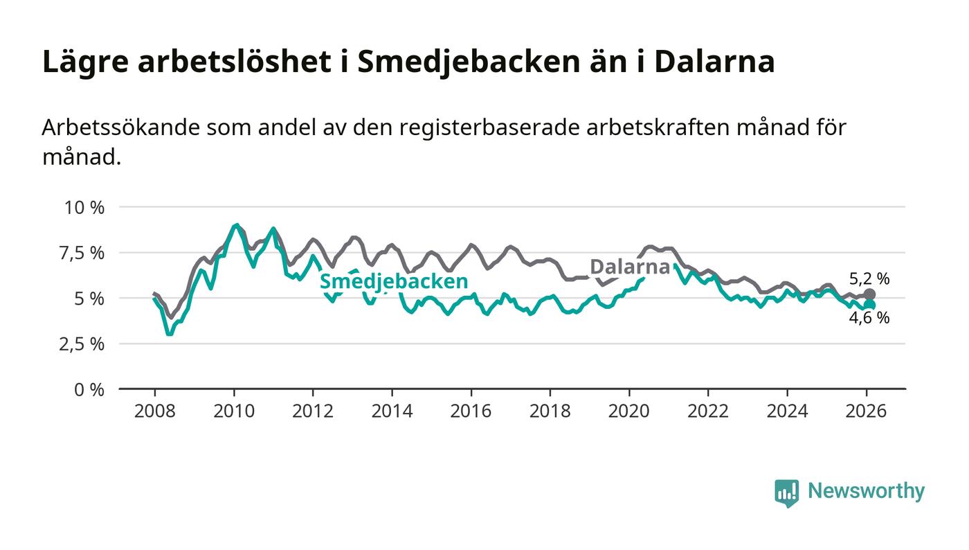 Under februari månad rapporterade Smedjebackens kommun en total arbetslöshet på 4,6 procent. Det är en minskning jämfört med samma tidpunkt i fjol (−0,8 procentenheter). Även i Dalarnas län sjunker arbetslösheten .