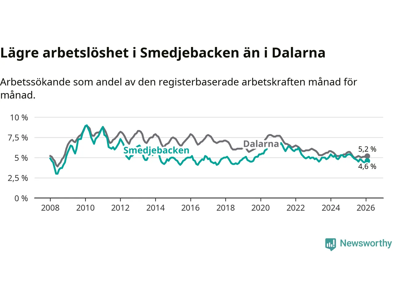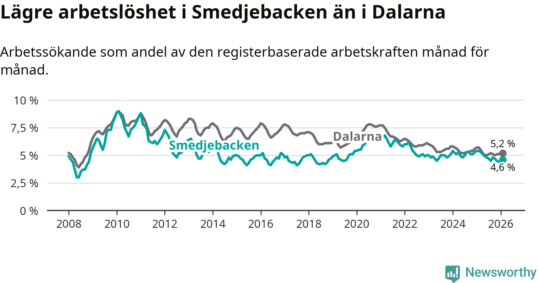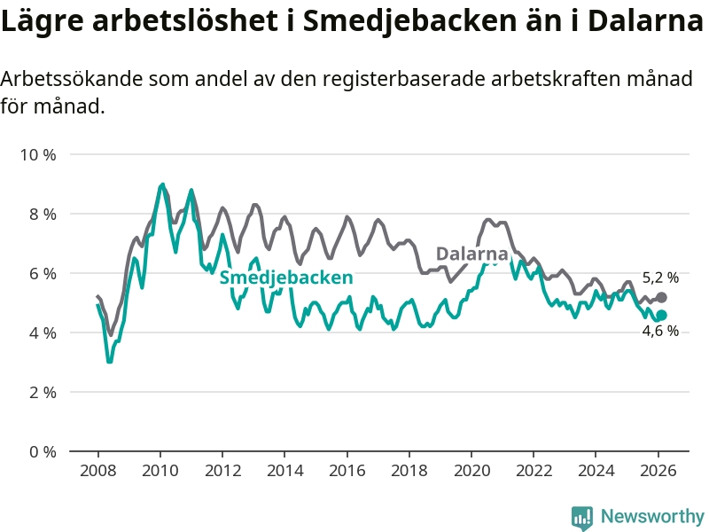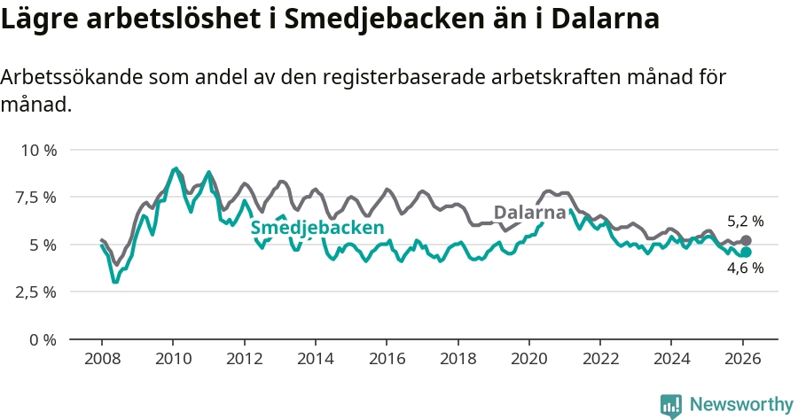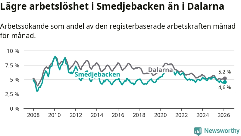 Under februari månad rapporterade Smedjebackens kommun en total arbetslöshet på 4,6 procent. Det är en minskning jämfört med samma tidpunkt i fjol (−0,8 procentenheter). Även i Dalarnas län sjunker arbetslösheten .