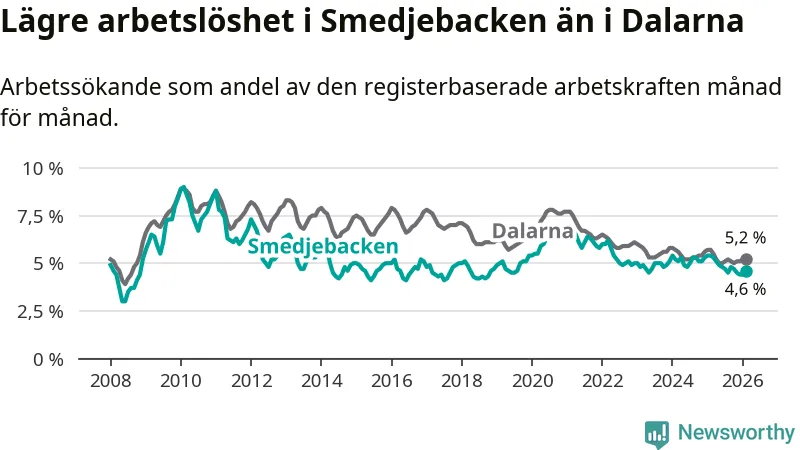 Smedjebacken hade redan tidigare lägre arbetslöshet än snittet i hela Dalarnas län och nu växer klyftan (4,6 procent i kommunen, jämfört med 5,2 procent i hela länet). Mora har den lägsta arbetslösheten i länet (3,5 procent), medan Avesta har den högsta (7,5 procent). För att Smedjebacken skulle komma ner i samma arbetslöshetsnivå som Mora skulle 53 personer behöva sysselsättas.