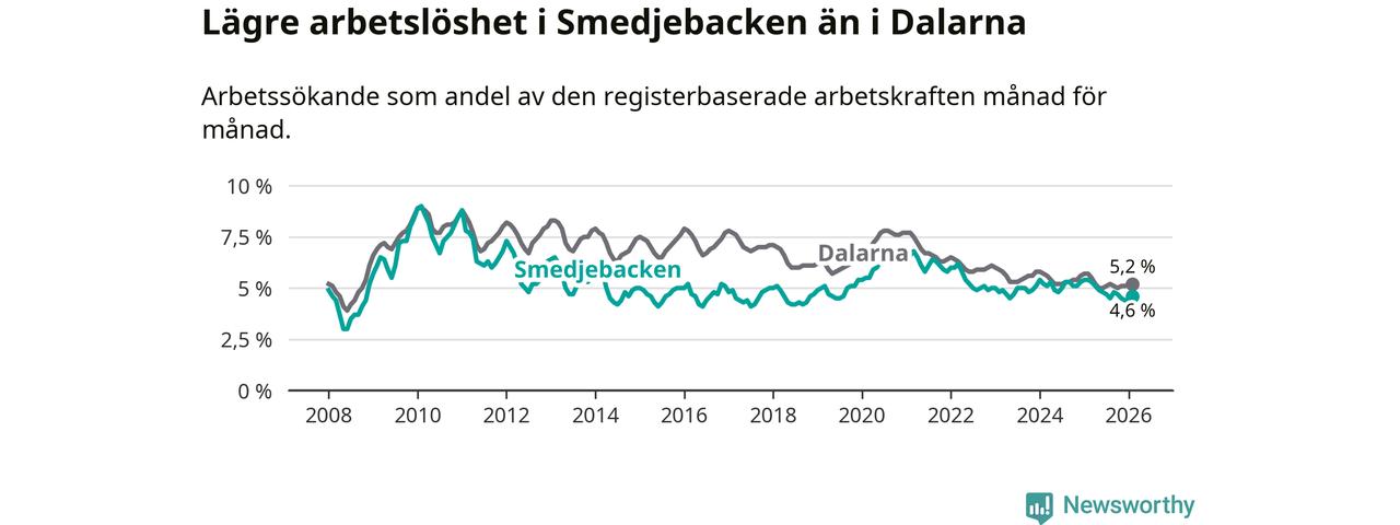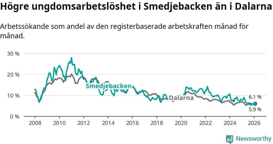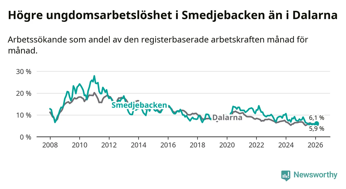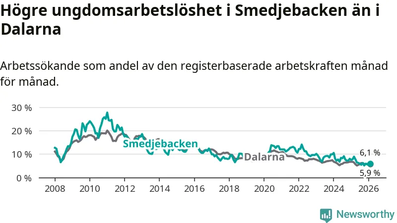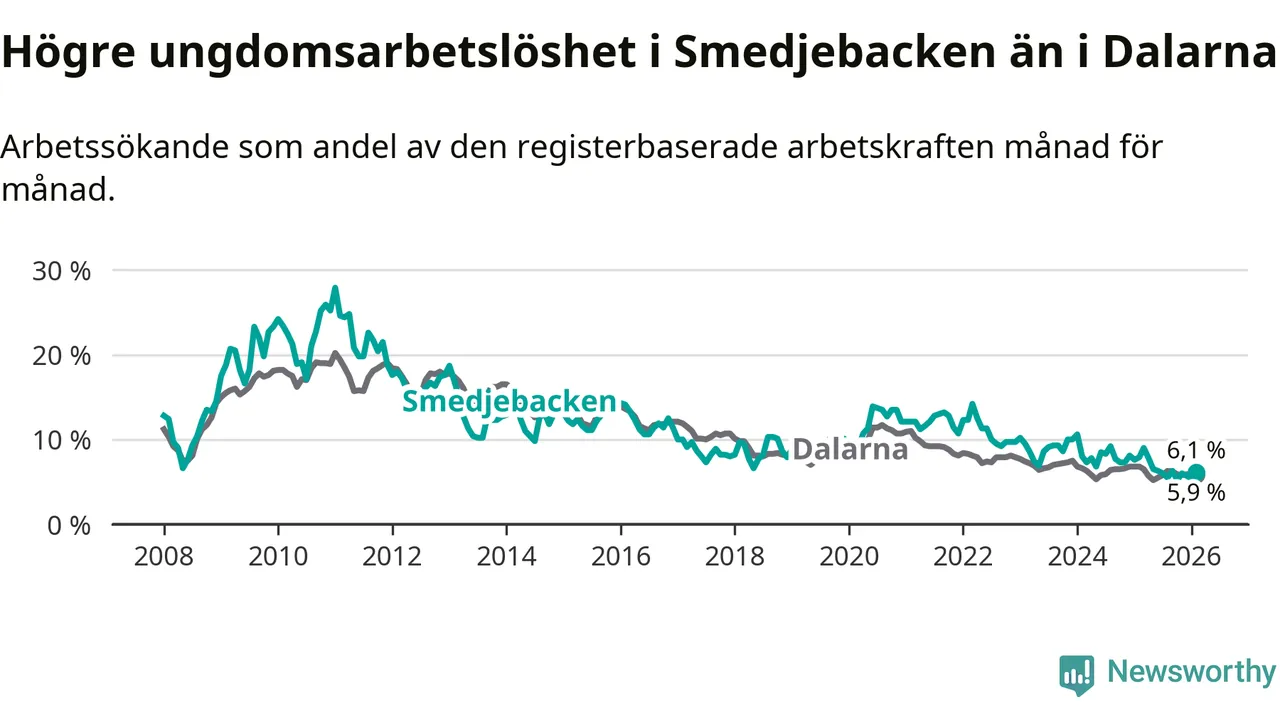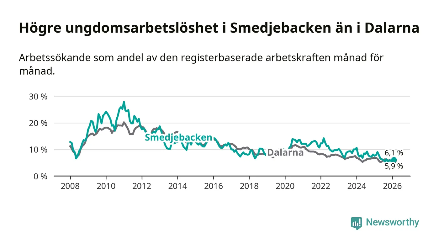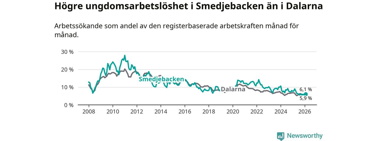 Medan Smedjebacken har lägre total arbetslöshet än Dalarna, ligger ungdomsarbetslösheten 0,2 procentenheter högre i Smedjebacken.