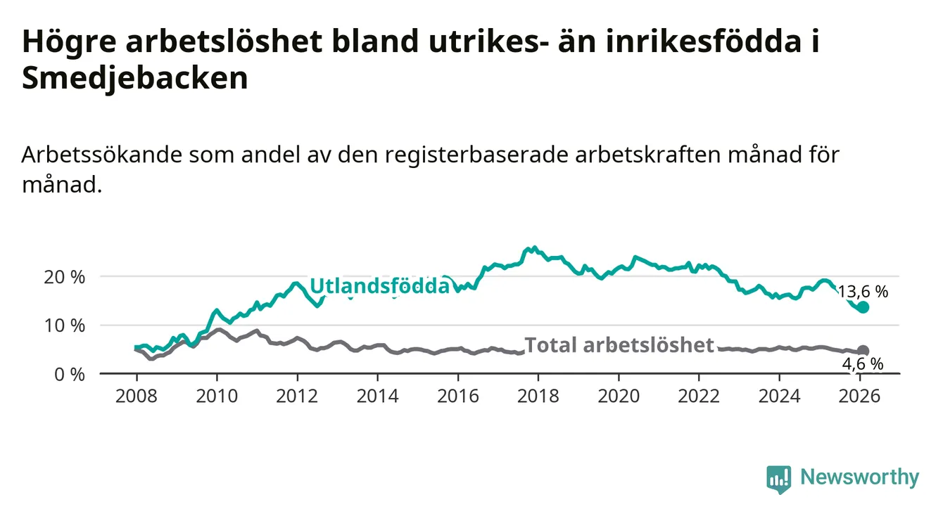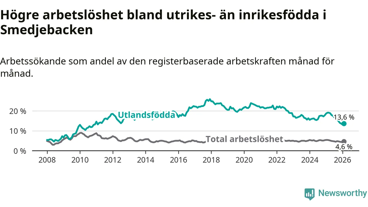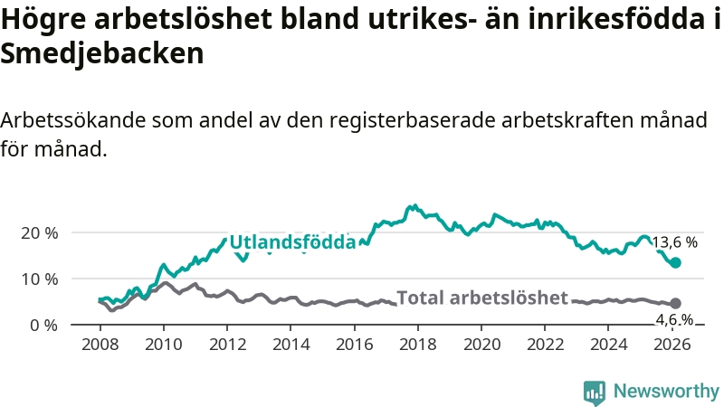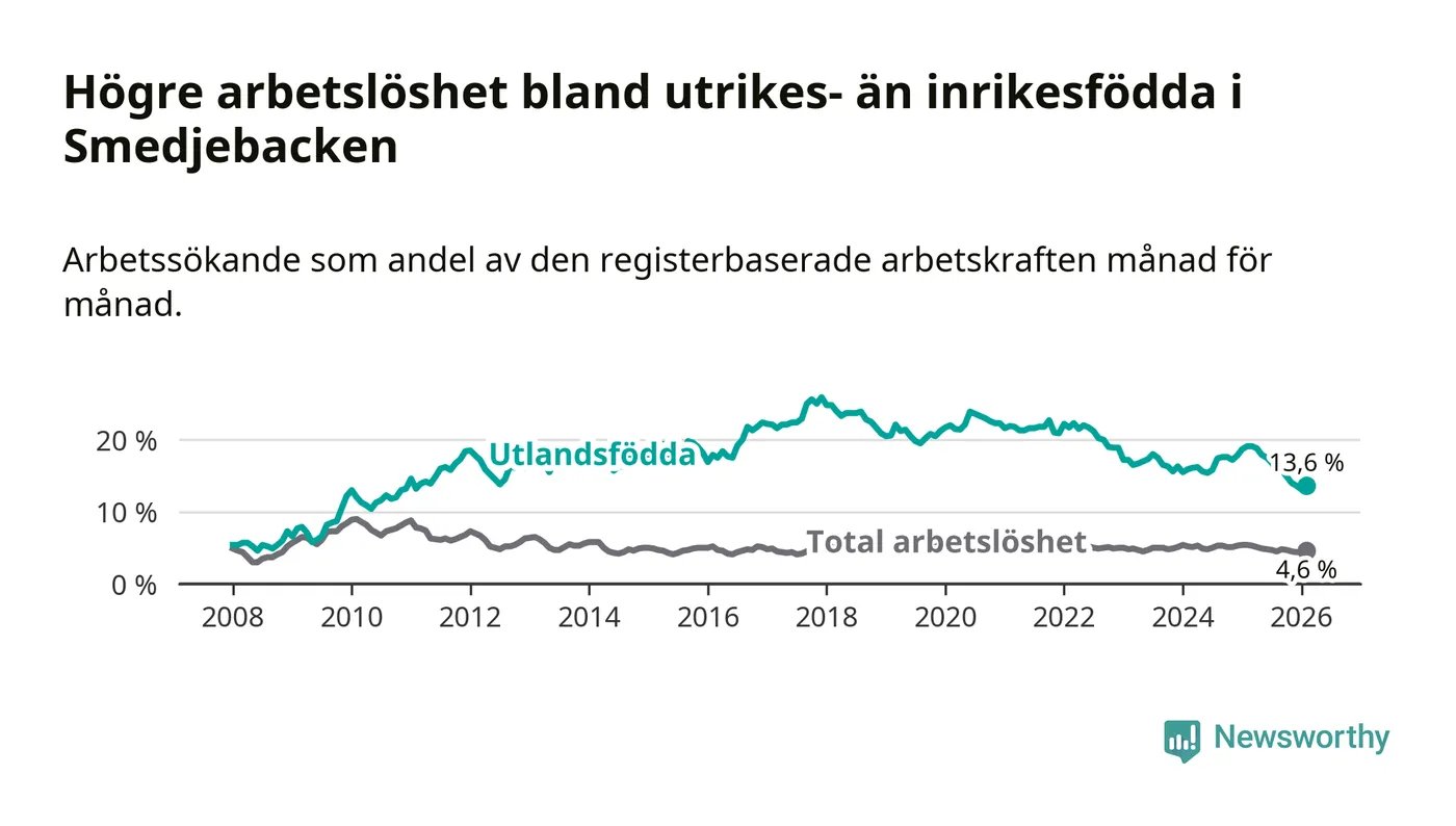 Arbetslösheten bland utlandsfödda var 13,6 procent i Smedjebacken under februari månad, motsvarande 70 av 515 personer. Det är 5,5 procentenheter färre än vid samma tidpunkt i fjol (−25 om man räknar personer). Därmed är de utlandsföddas arbetslöshet lägre än vid samma tidpunkt i fjol för sjunde månaden i följd. Sedan juli 2025 har arbetslösheten bland utlandsfödda minskat från 16,8 till 13,6 procent.