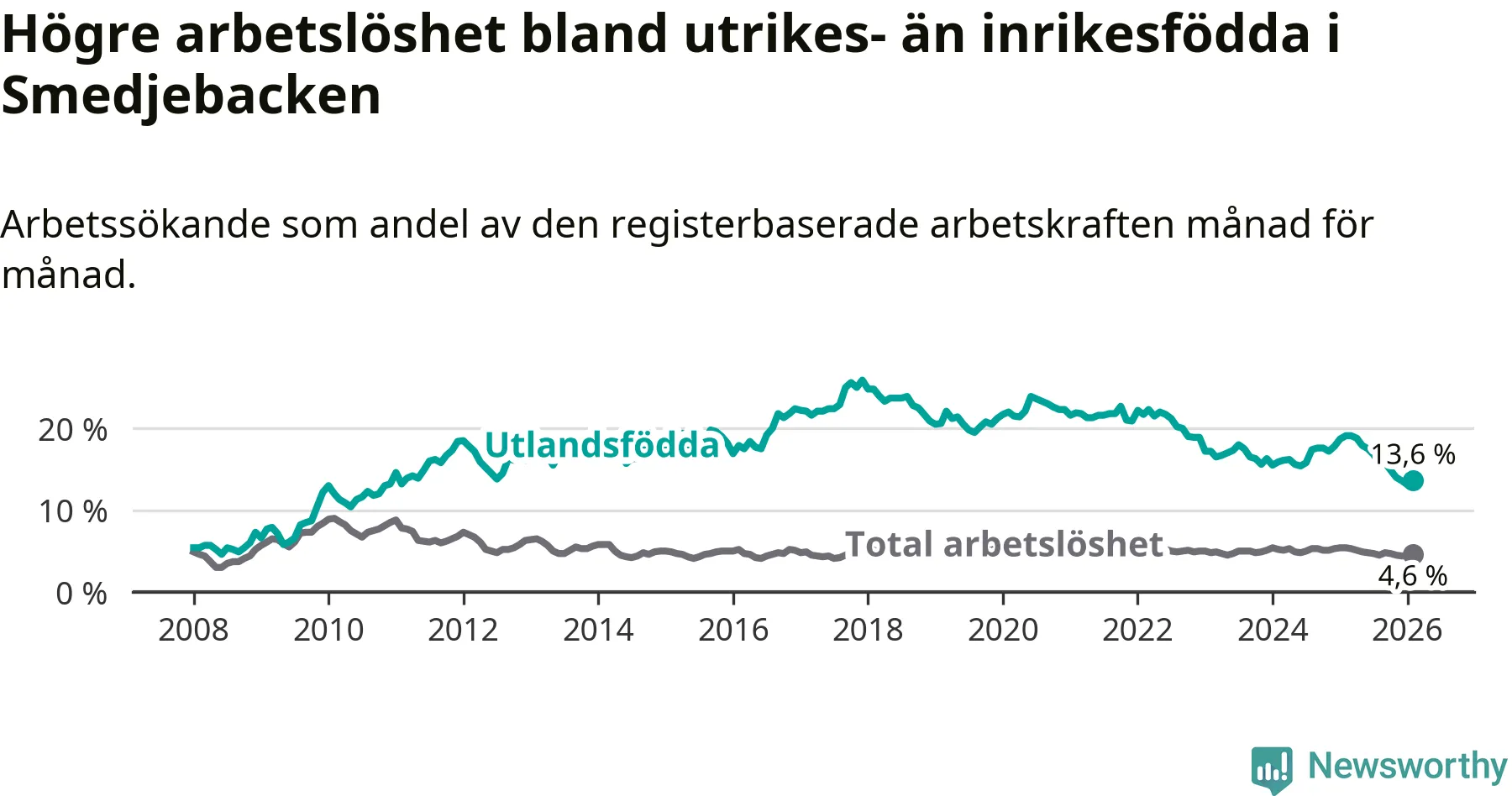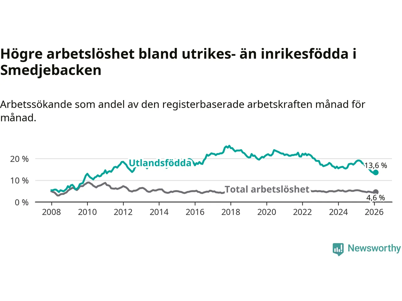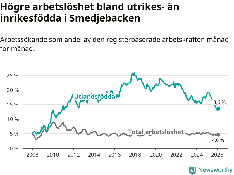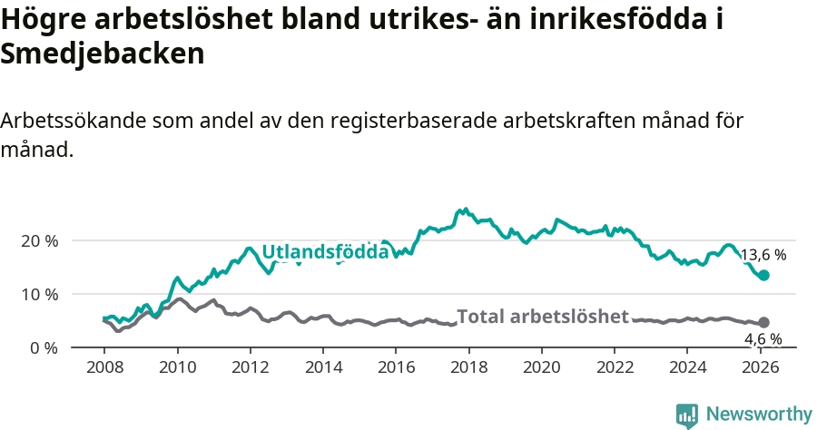 Arbetslösheten bland utlandsfödda var 13,6 procent i Smedjebacken under februari månad, motsvarande 70 av 515 personer. Det är 5,5 procentenheter färre än vid samma tidpunkt i fjol (−25 om man räknar personer). Därmed är de utlandsföddas arbetslöshet lägre än vid samma tidpunkt i fjol för sjunde månaden i följd. Sedan juli 2025 har arbetslösheten bland utlandsfödda minskat från 16,8 till 13,6 procent.