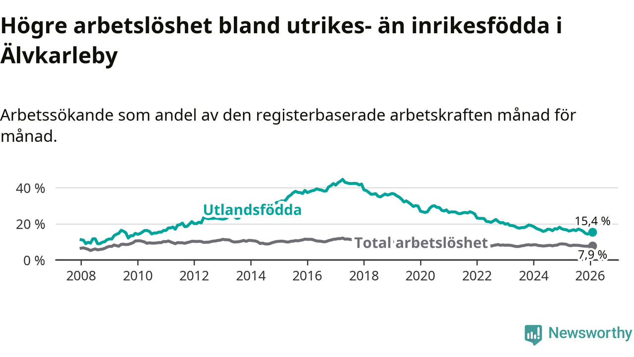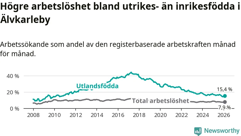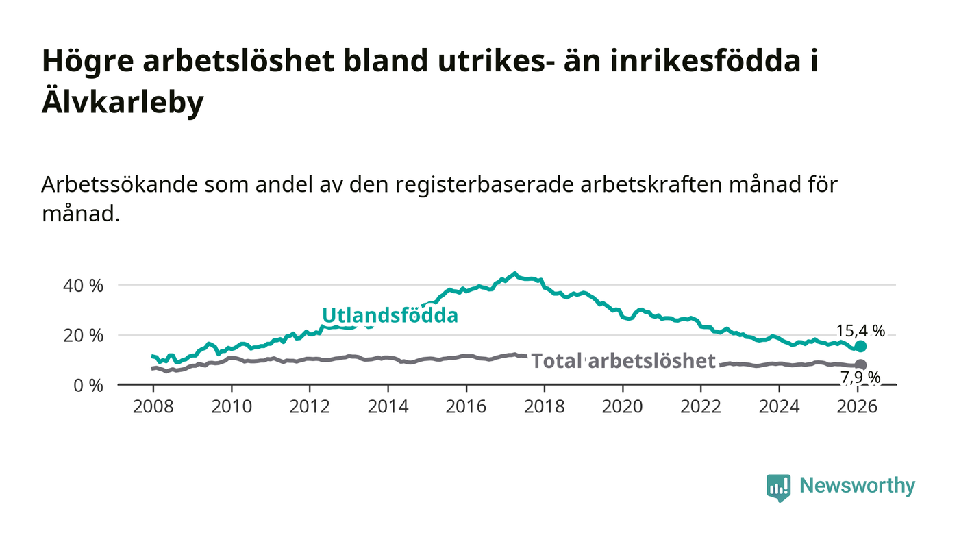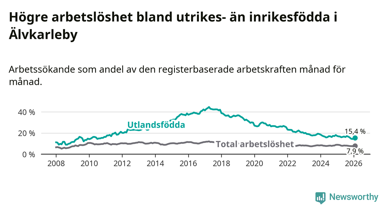 Arbetslösheten bland utlandsfödda var 15,4 procent i Älvkarleby under februari månad, motsvarande 118 av 766 personer. Det är 1,4 procentenheter färre än vid samma tidpunkt i fjol (−8 om man räknar personer).