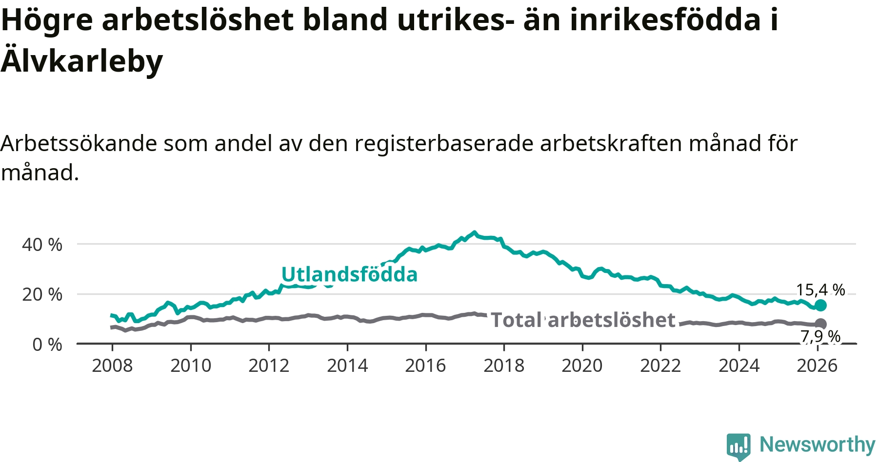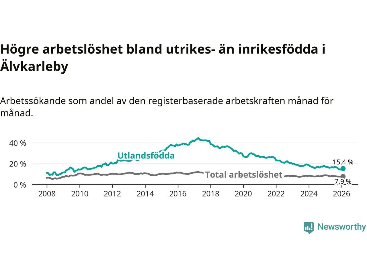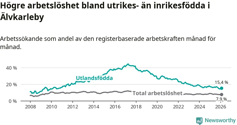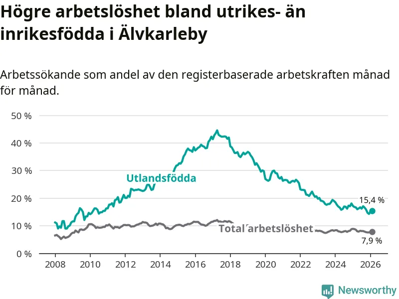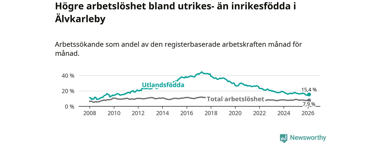 Arbetslösheten bland utlandsfödda var 15,4 procent i Älvkarleby under februari månad, motsvarande 118 av 766 personer. Det är 1,4 procentenheter färre än vid samma tidpunkt i fjol (−8 om man räknar personer).