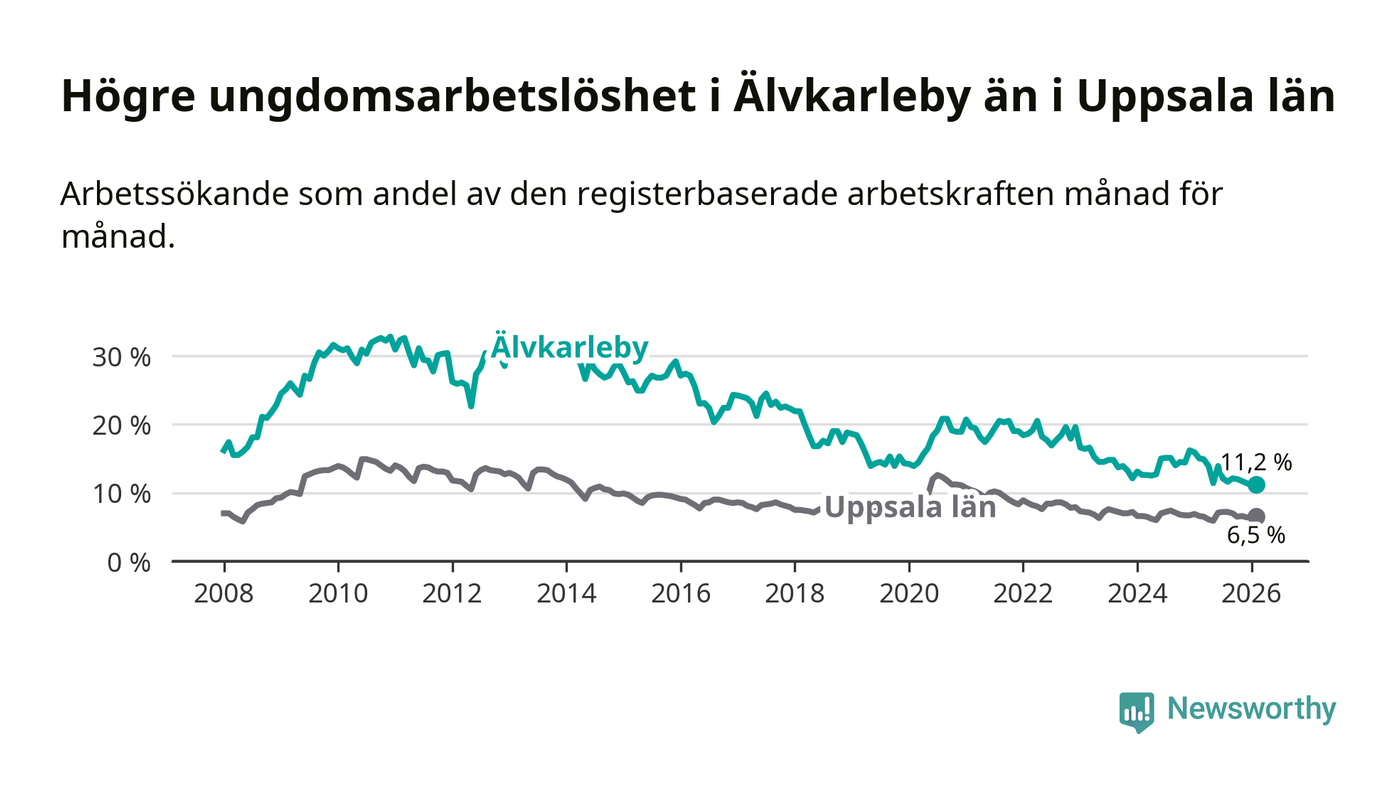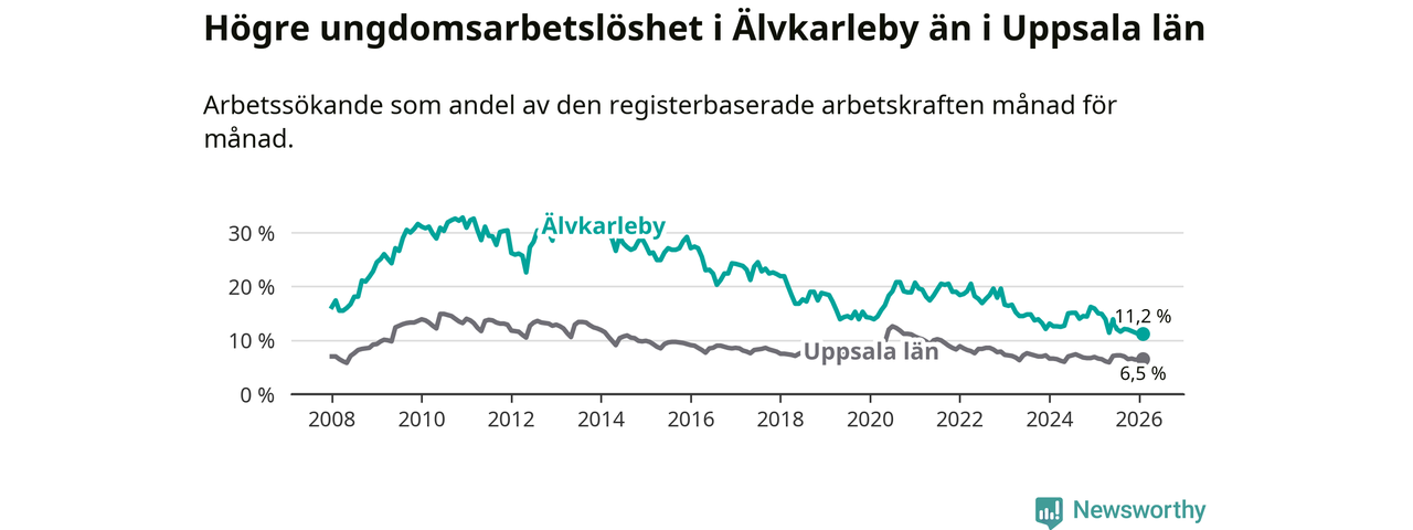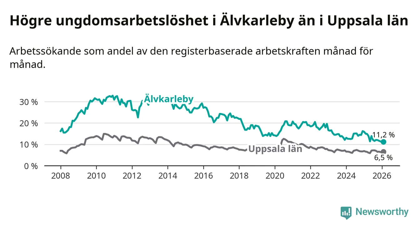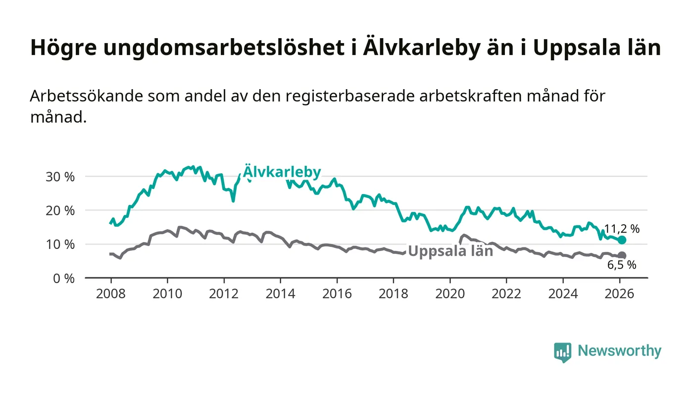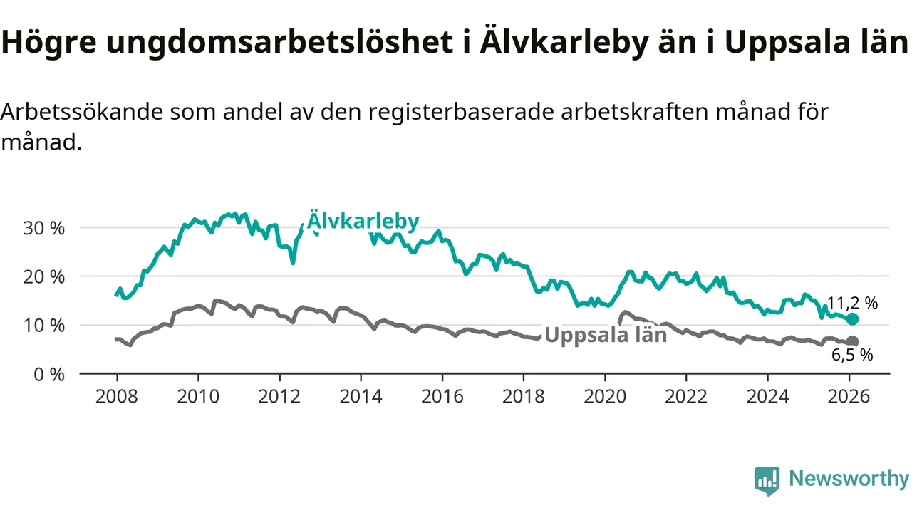I och med den senaste månadens nedgång har de ungas arbetslöshet i Älvkarleby sjunkit tio månader i följd (ner från 13,9 procent i april 2025 till 11,2 procent nu).