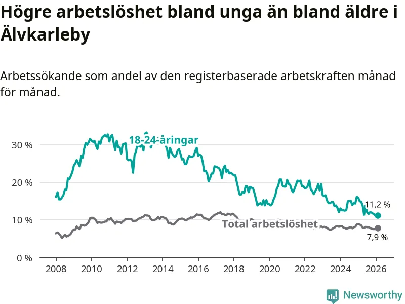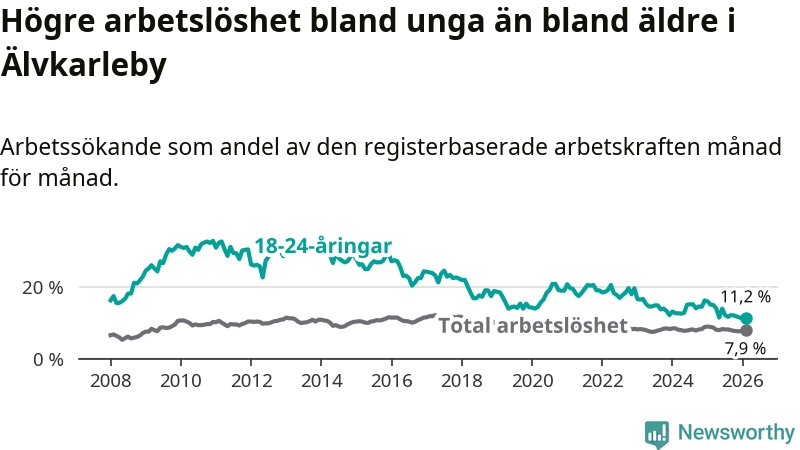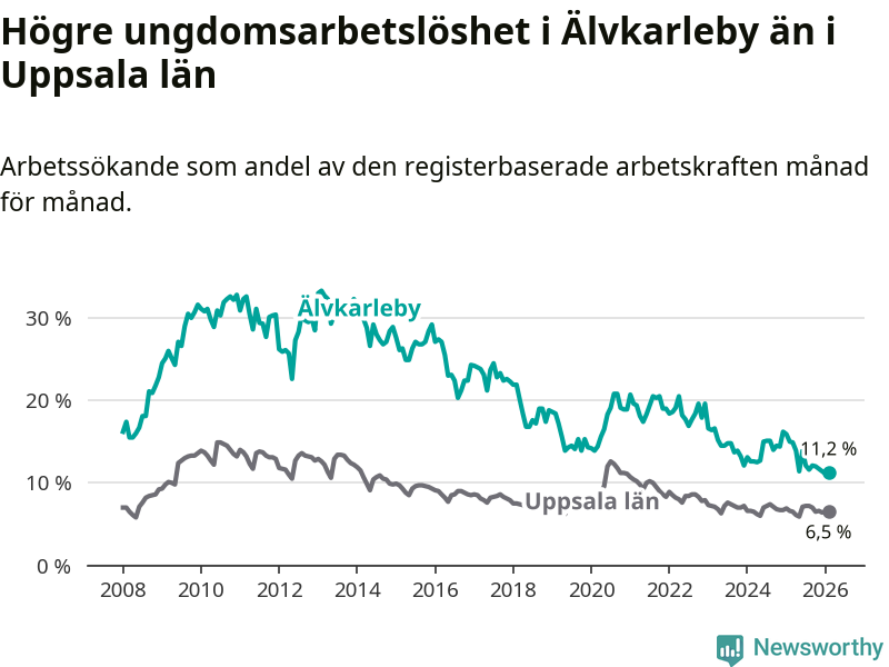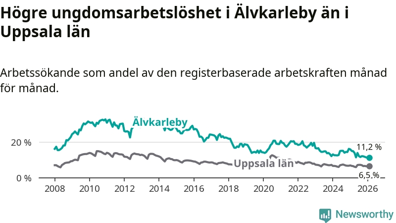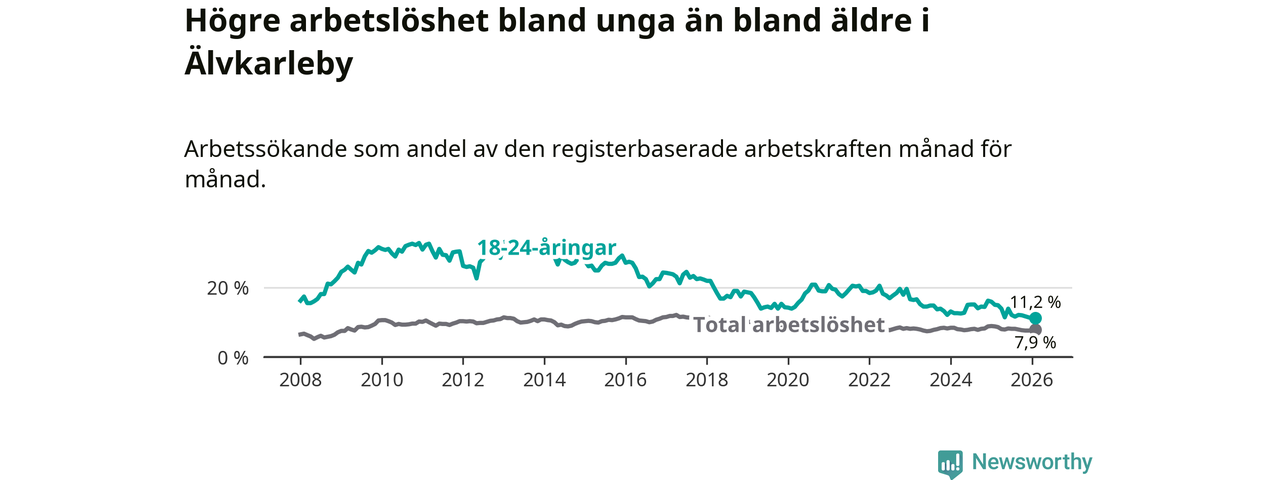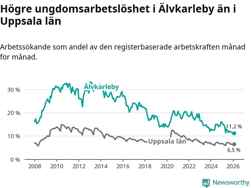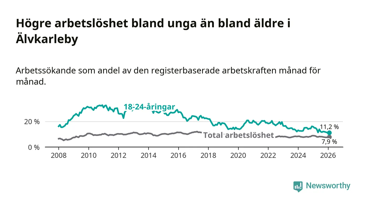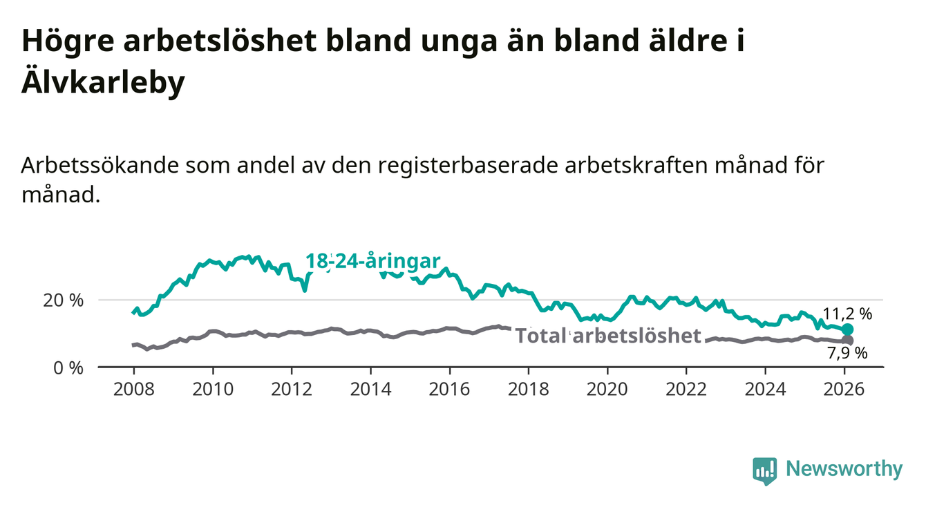 I och med den senaste månadens nedgång har de ungas arbetslöshet i Älvkarleby sjunkit tio månader i följd (ner från 13,9 procent i april 2025 till 11,2 procent nu).
