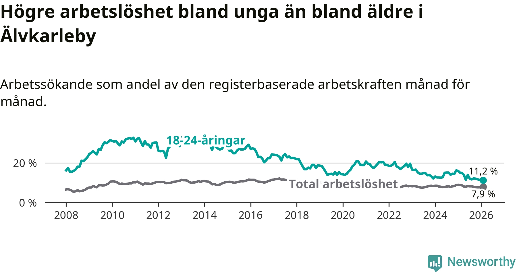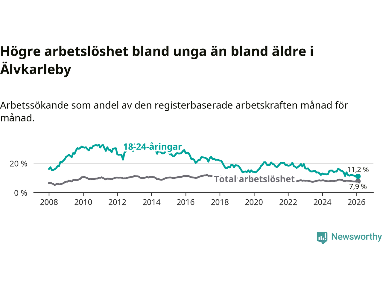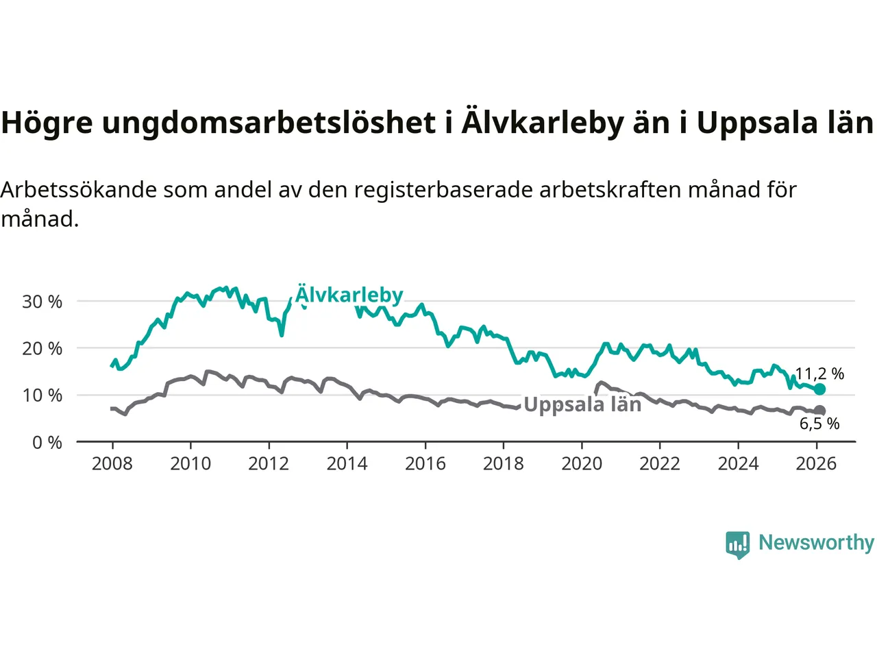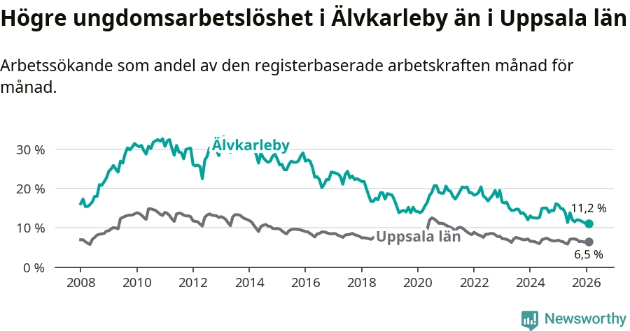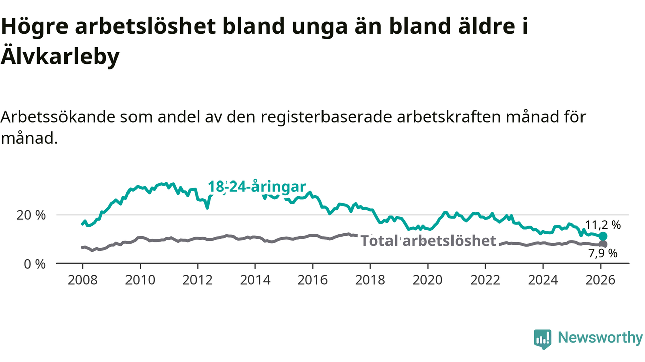 I och med den senaste månadens nedgång har de ungas arbetslöshet i Älvkarleby sjunkit tio månader i följd (ner från 13,9 procent i april 2025 till 11,2 procent nu).