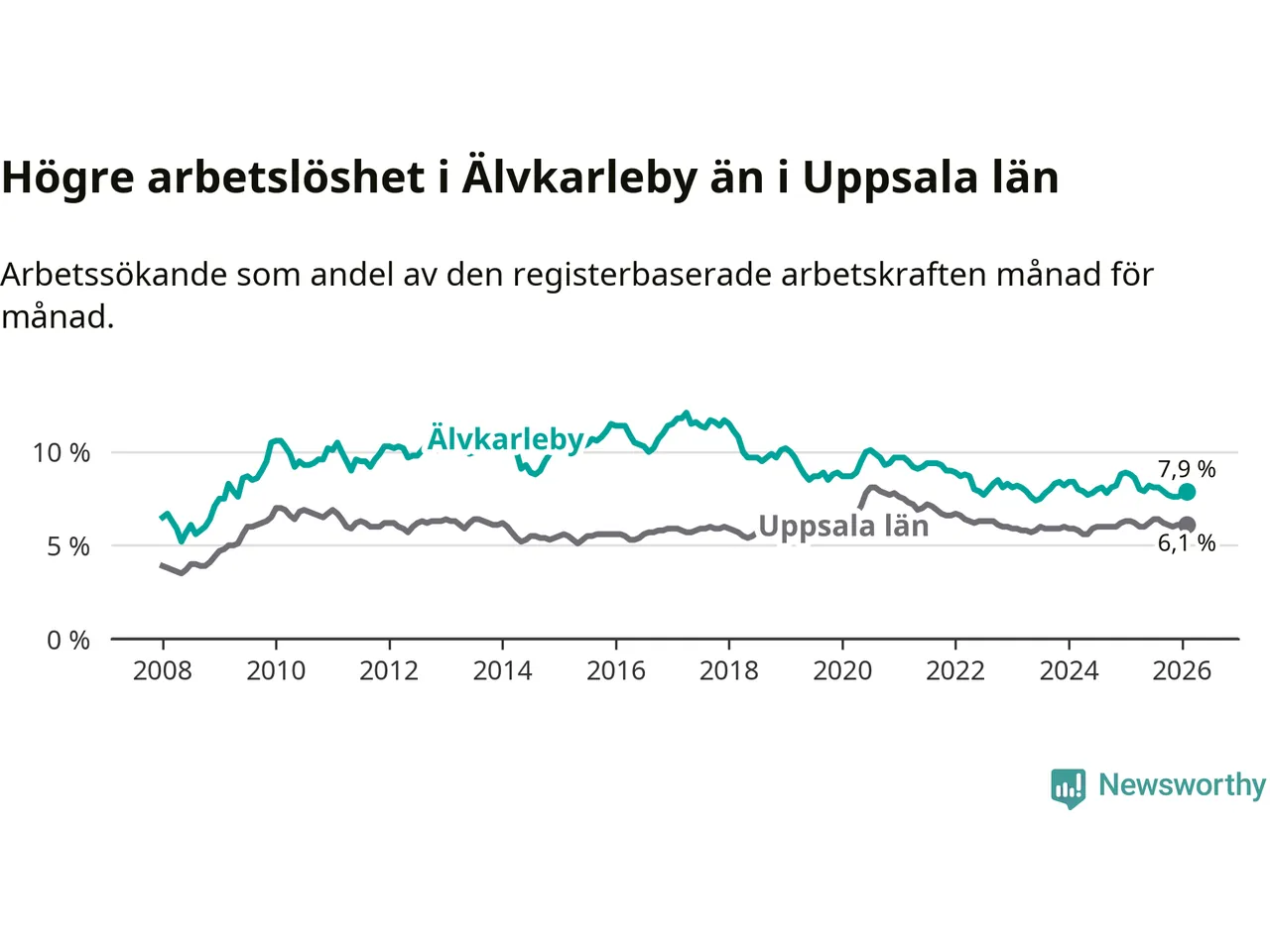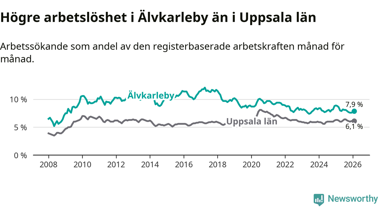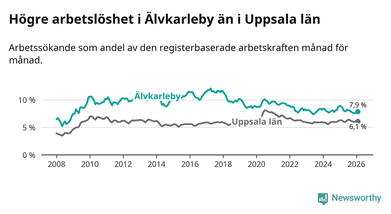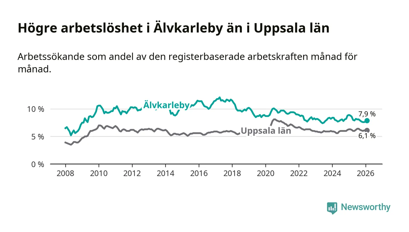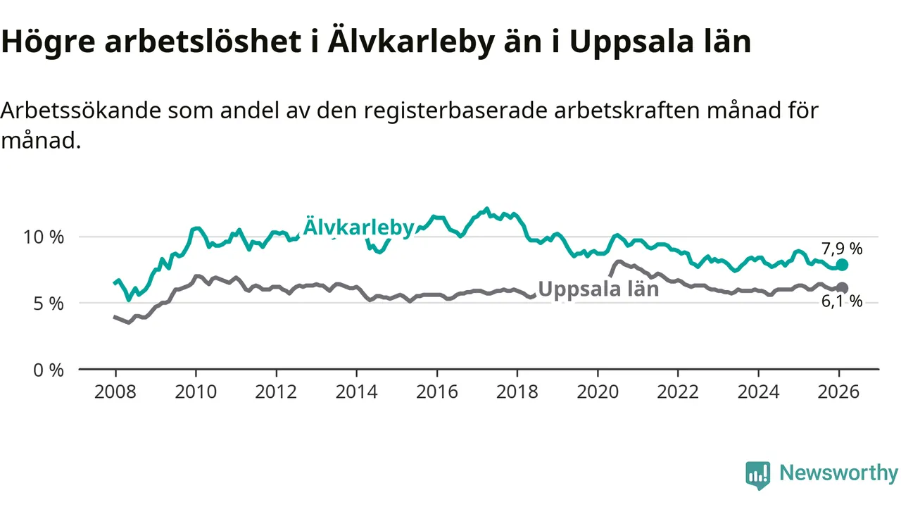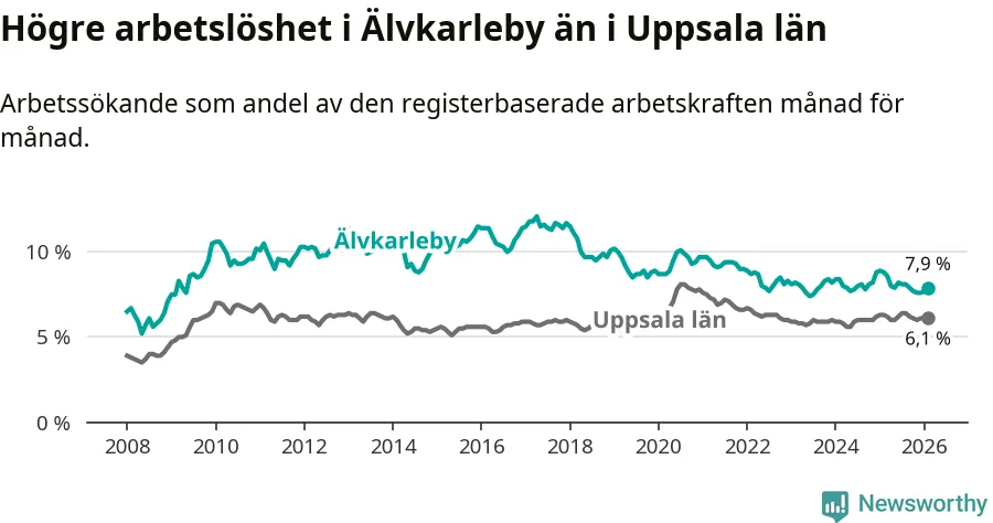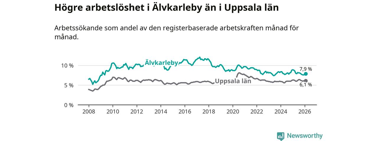 Under februari månad rapporterade Älvkarleby kommun en total arbetslöshet på 7,9 procent. Det är en minskning jämfört med samma tidpunkt i fjol (−0,9 procentenheter). Även i Uppsala län sjunker arbetslösheten .