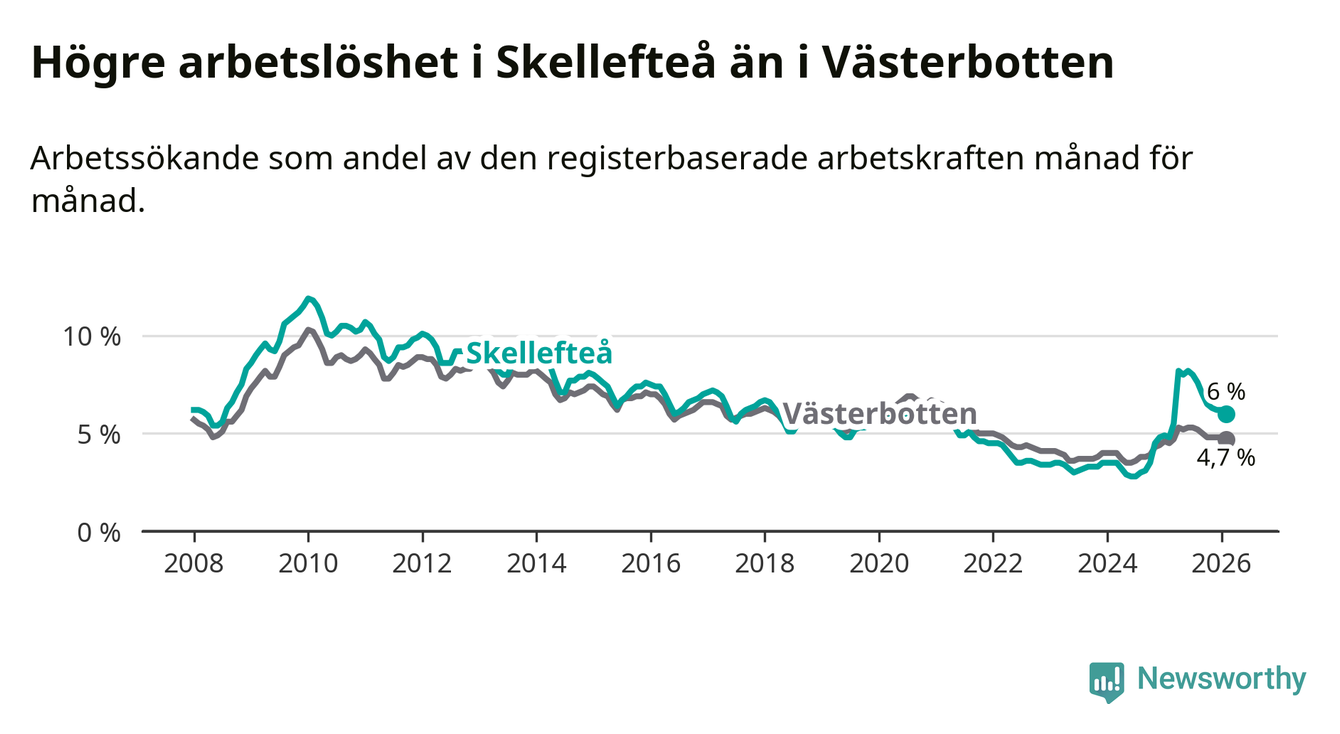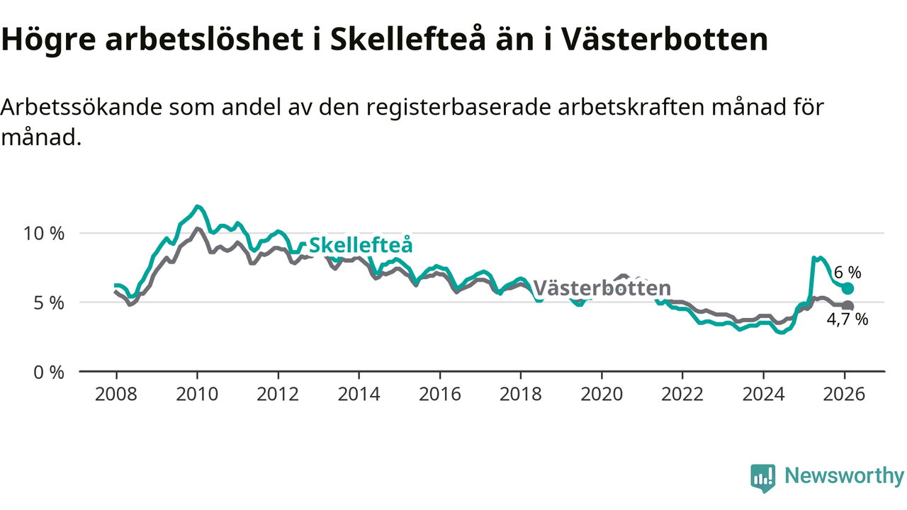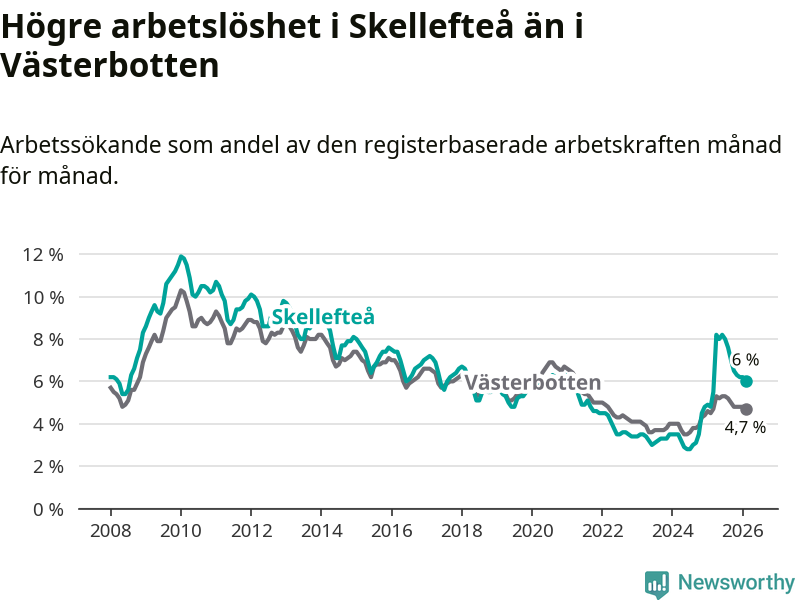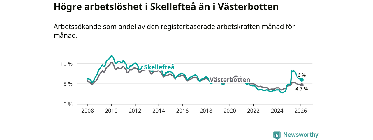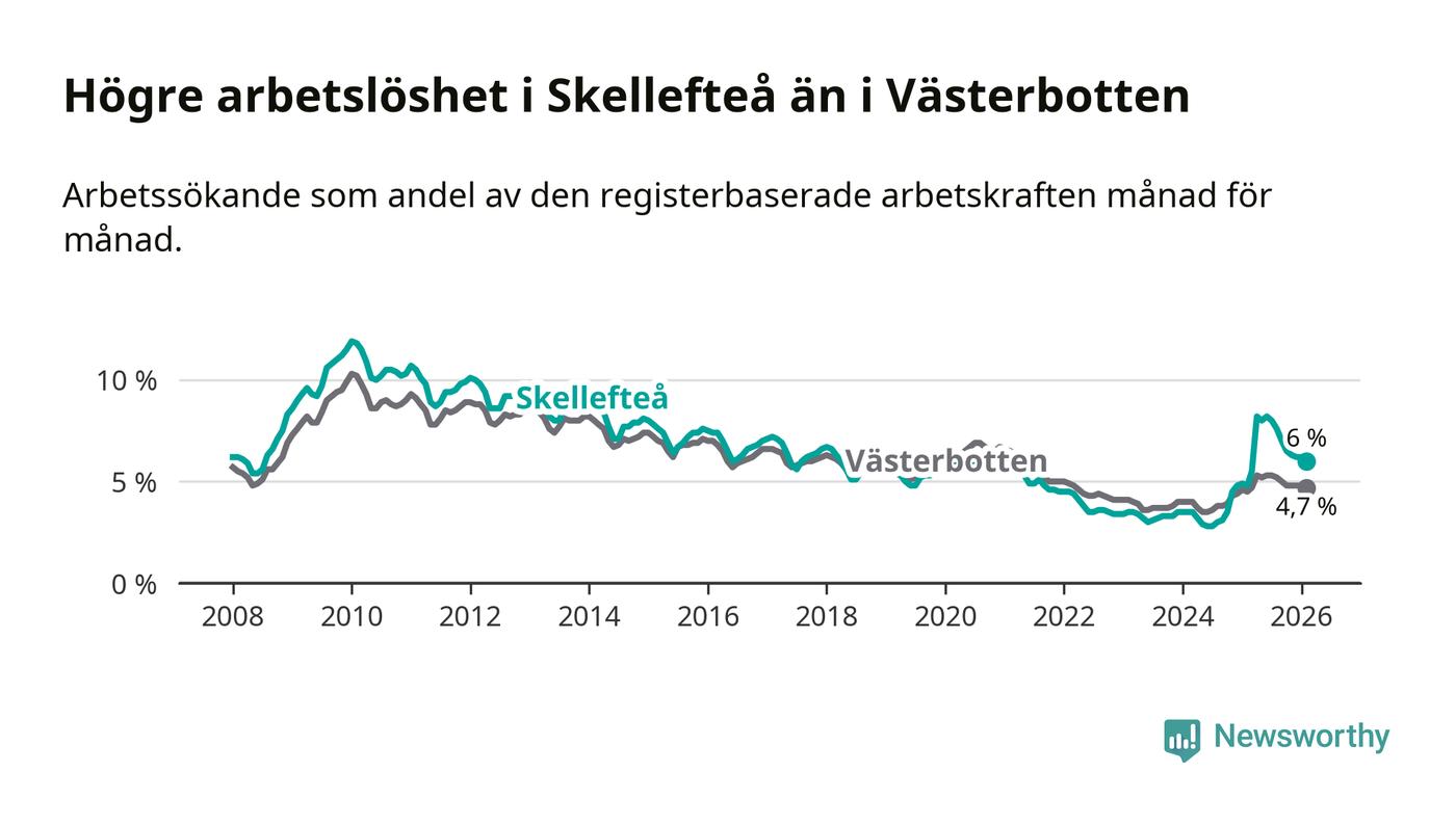 Under februari månad rapporterade Skellefteå kommun en total arbetslöshet på 6,0 procent. Det är en ökning jämfört med samma tidpunkt i fjol (+1,2 procentenheter). Även i Västerbottens län stiger arbetslösheten .
