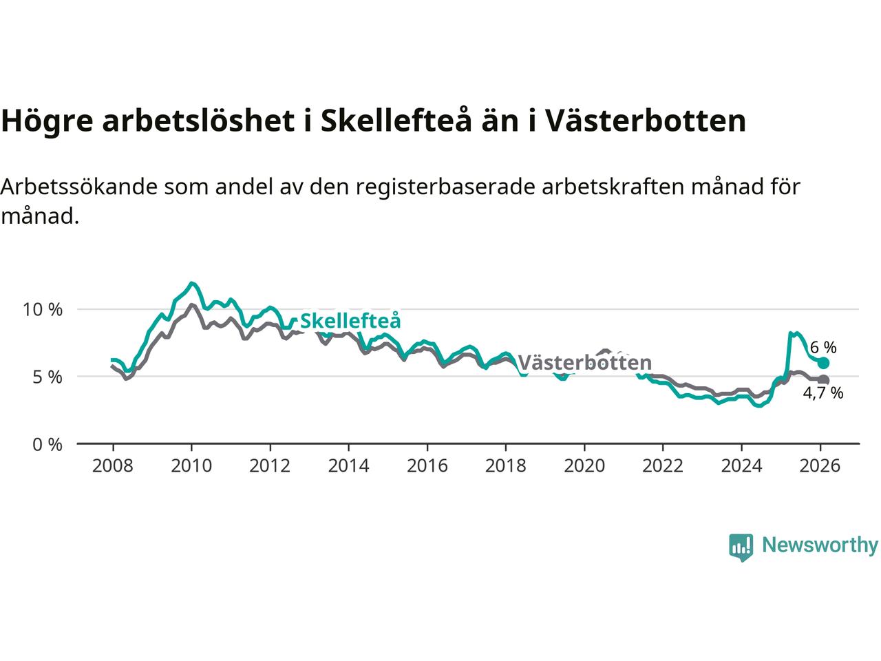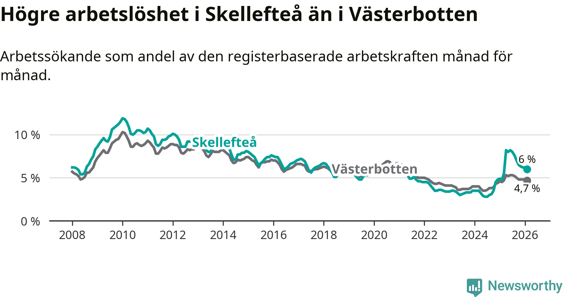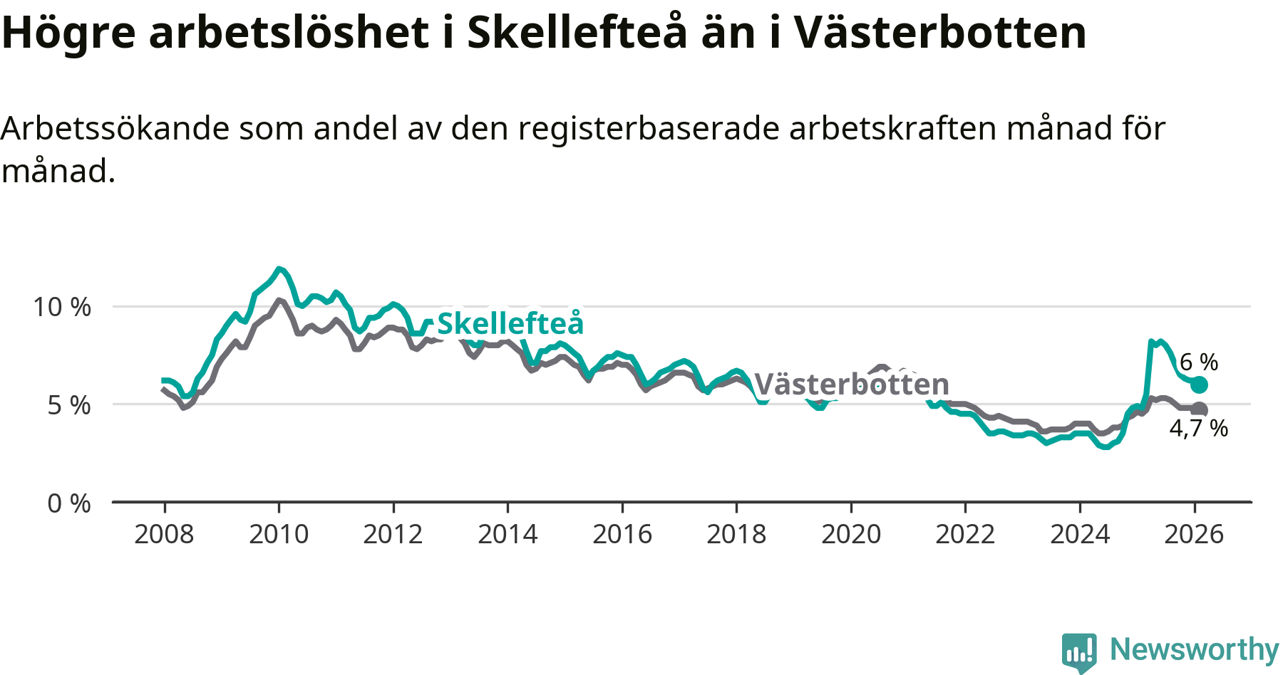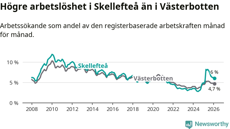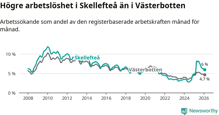 Under februari månad rapporterade Skellefteå kommun en total arbetslöshet på 6,0 procent. Det är en ökning jämfört med samma tidpunkt i fjol (+1,2 procentenheter). Även i Västerbottens län stiger arbetslösheten .