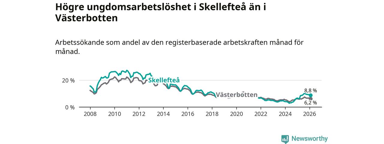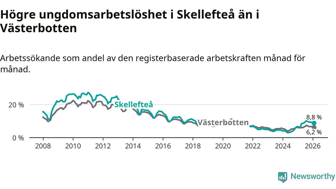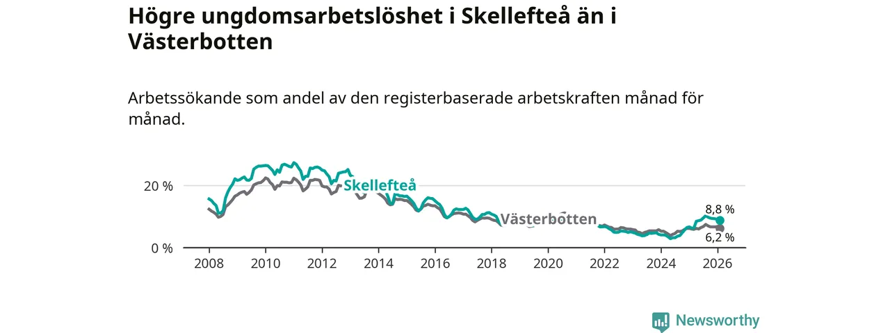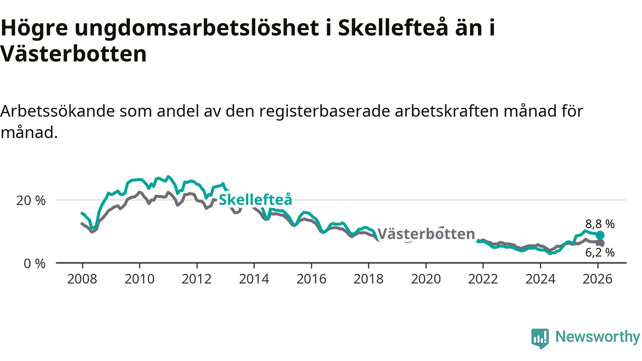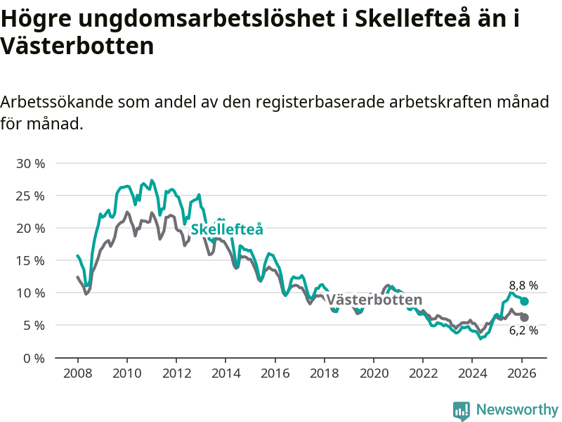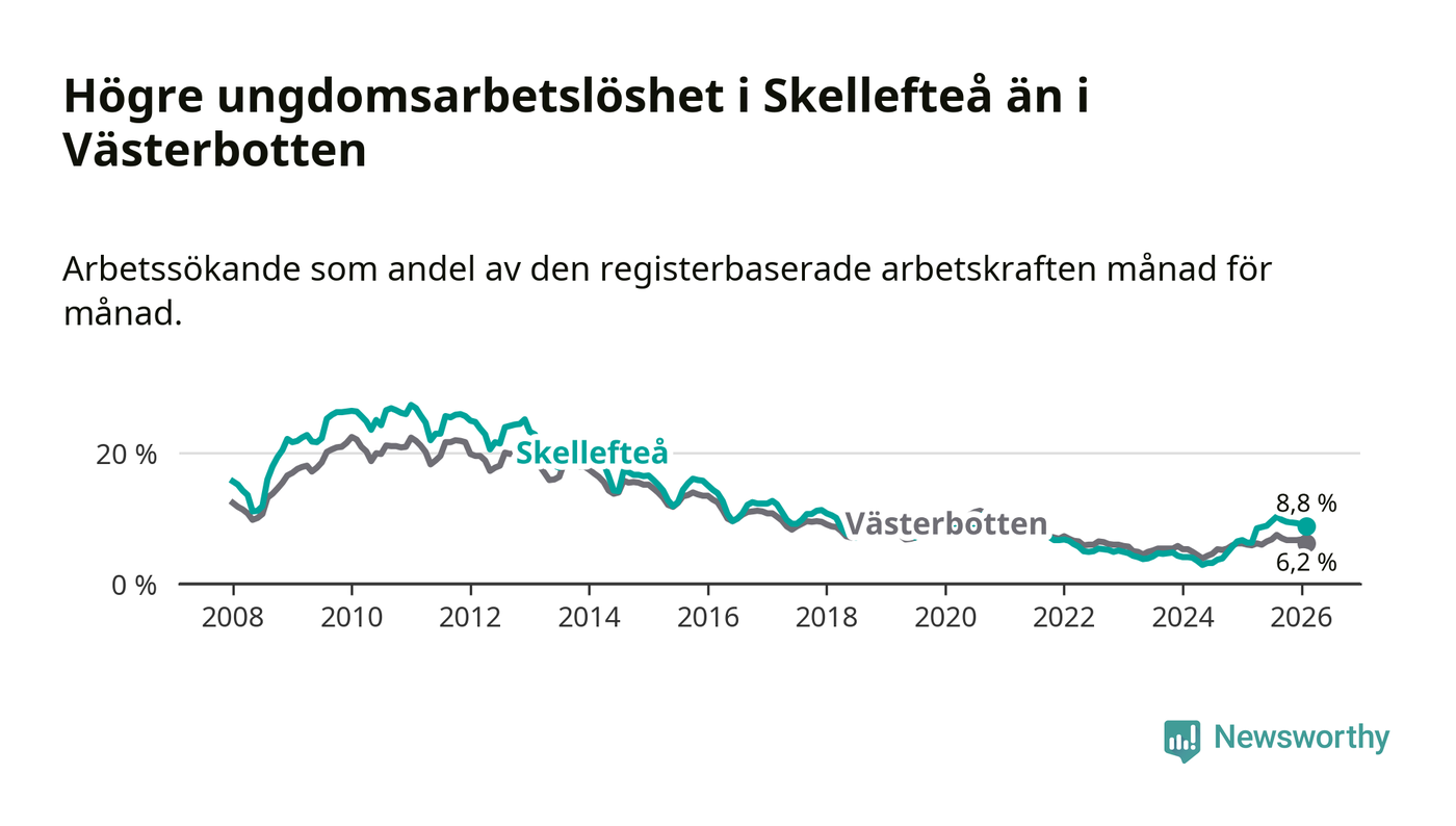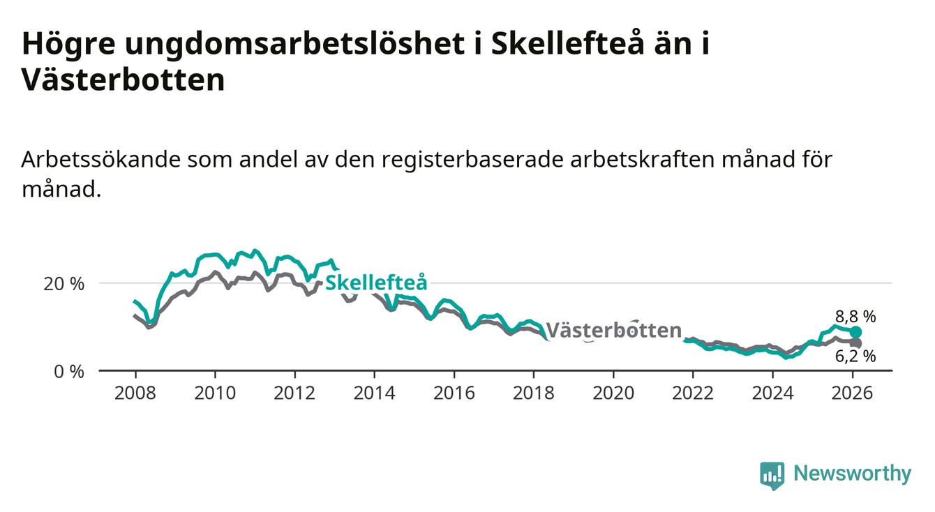 Precis som den totala arbetslösheten ligger ungdomsarbetslösheten i Skellefteå högre än i Västerbotten som helhet. Skillnaden mellan kommunen och länet är 2,6 procentenheter.