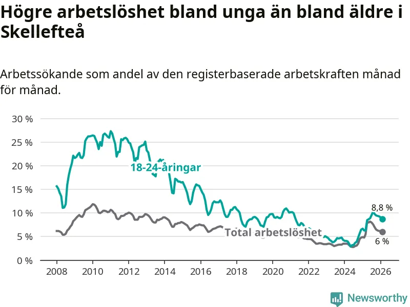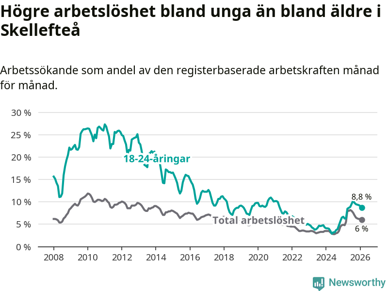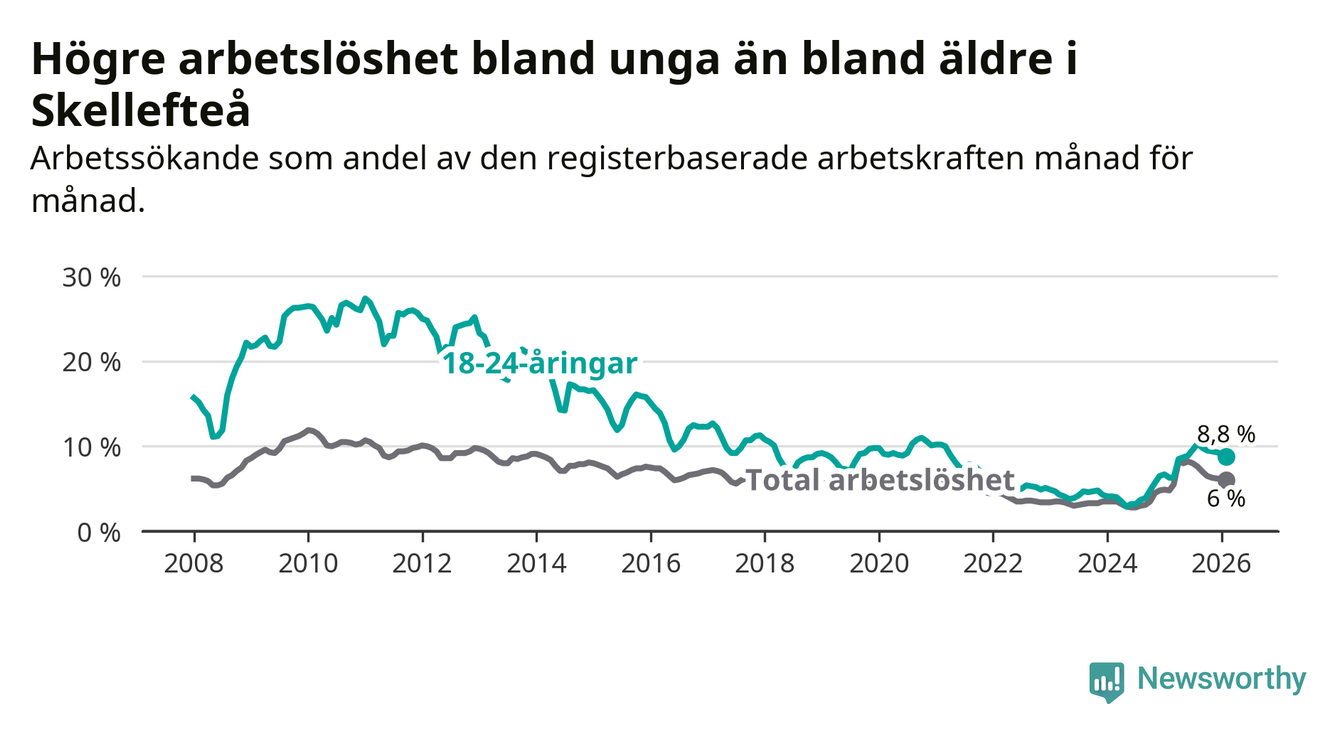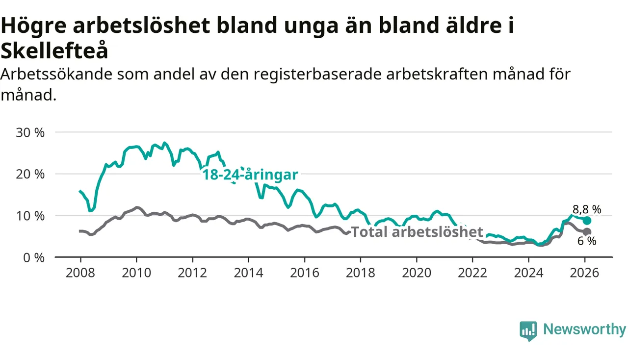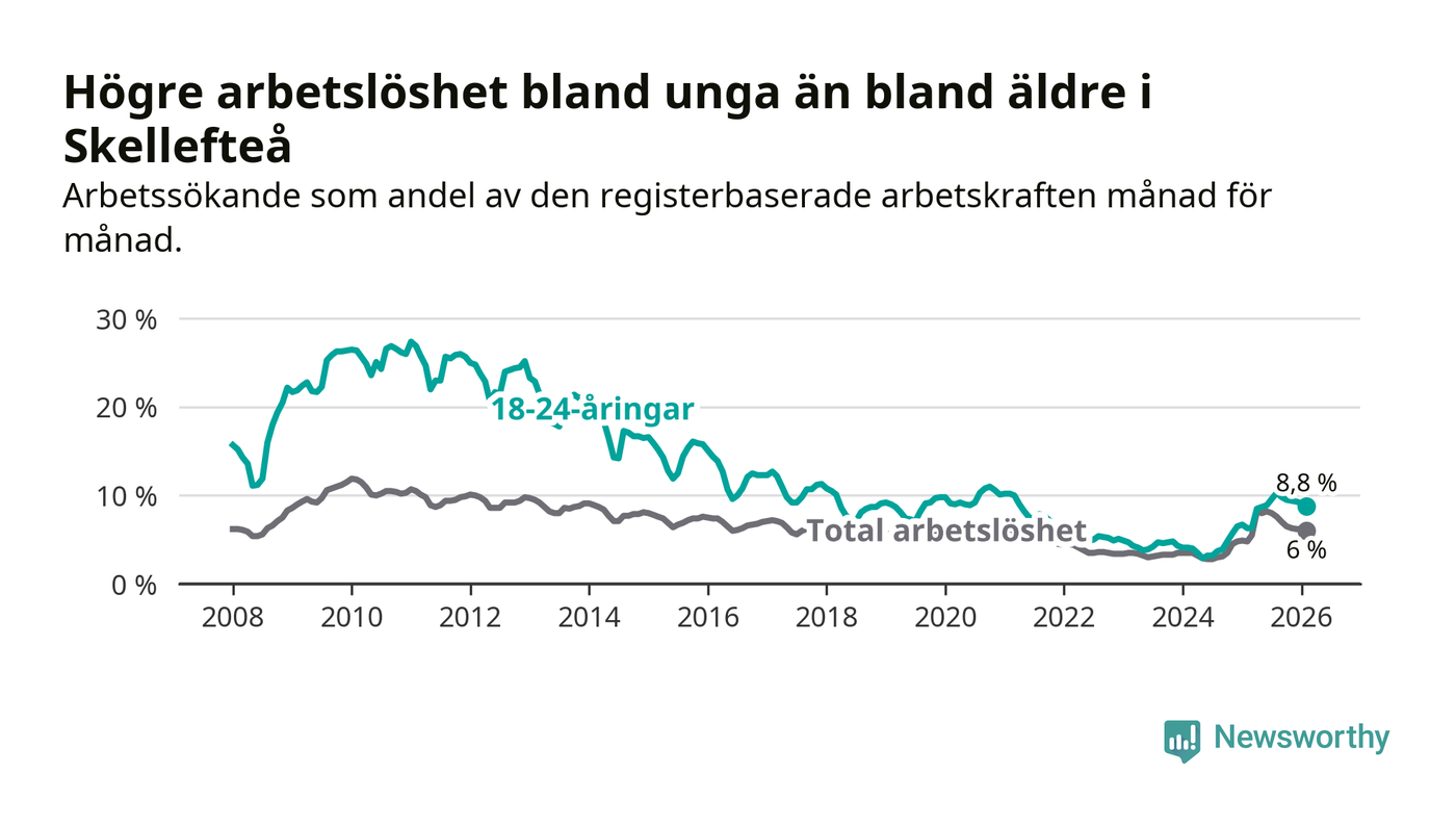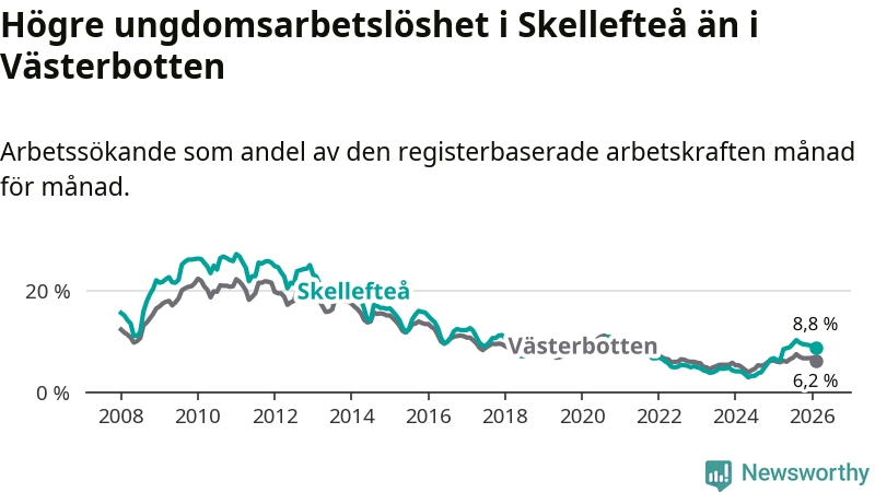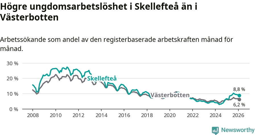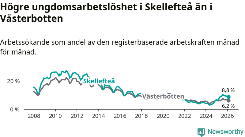 Precis som den totala arbetslösheten ligger ungdomsarbetslösheten i Skellefteå högre än i Västerbotten som helhet. Skillnaden mellan kommunen och länet är 2,6 procentenheter.