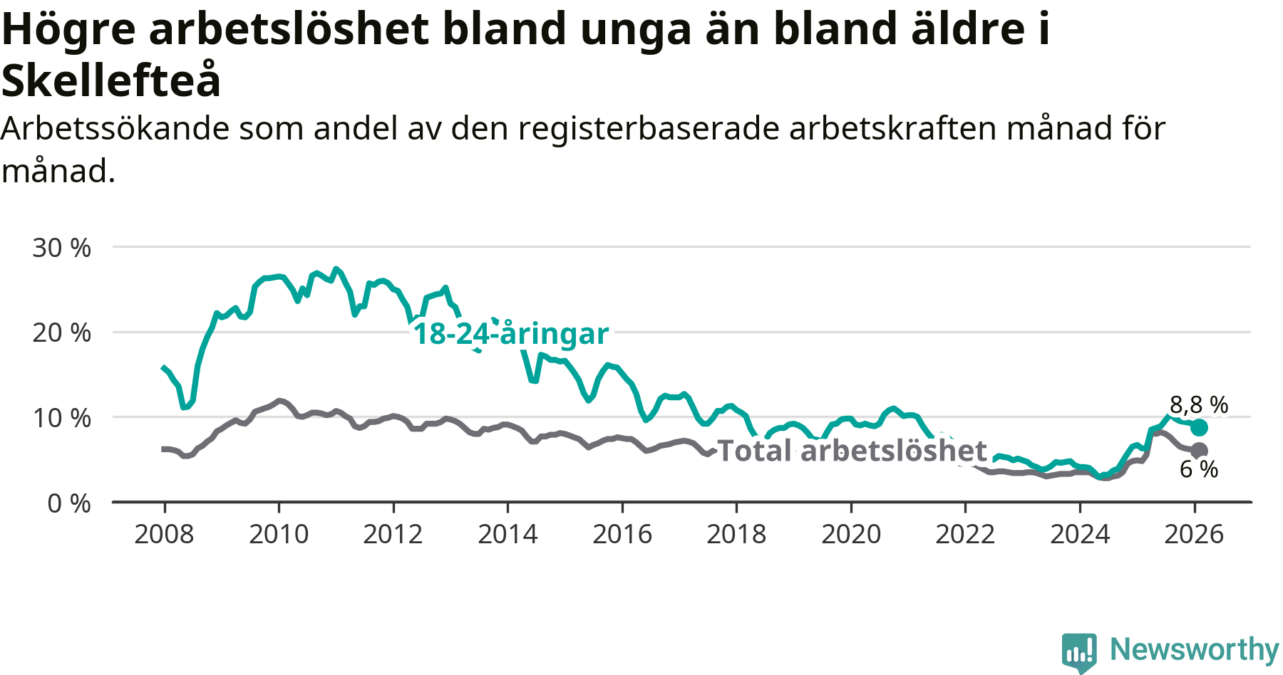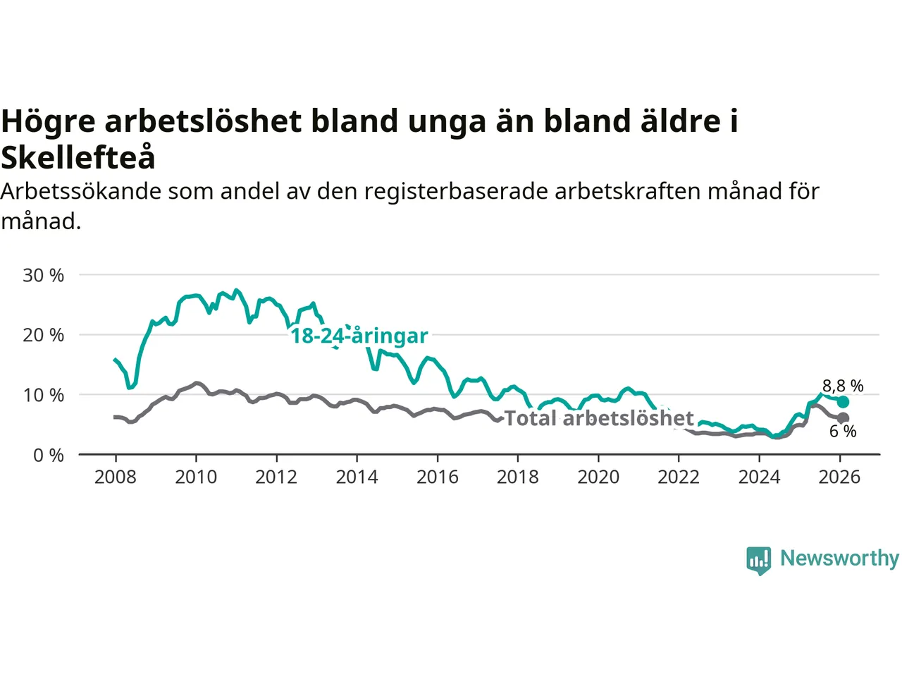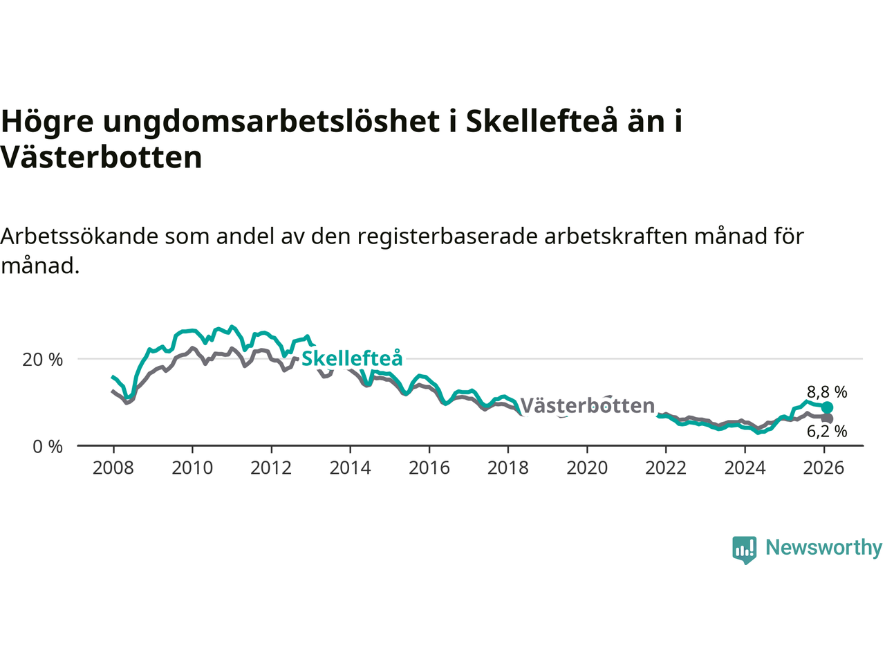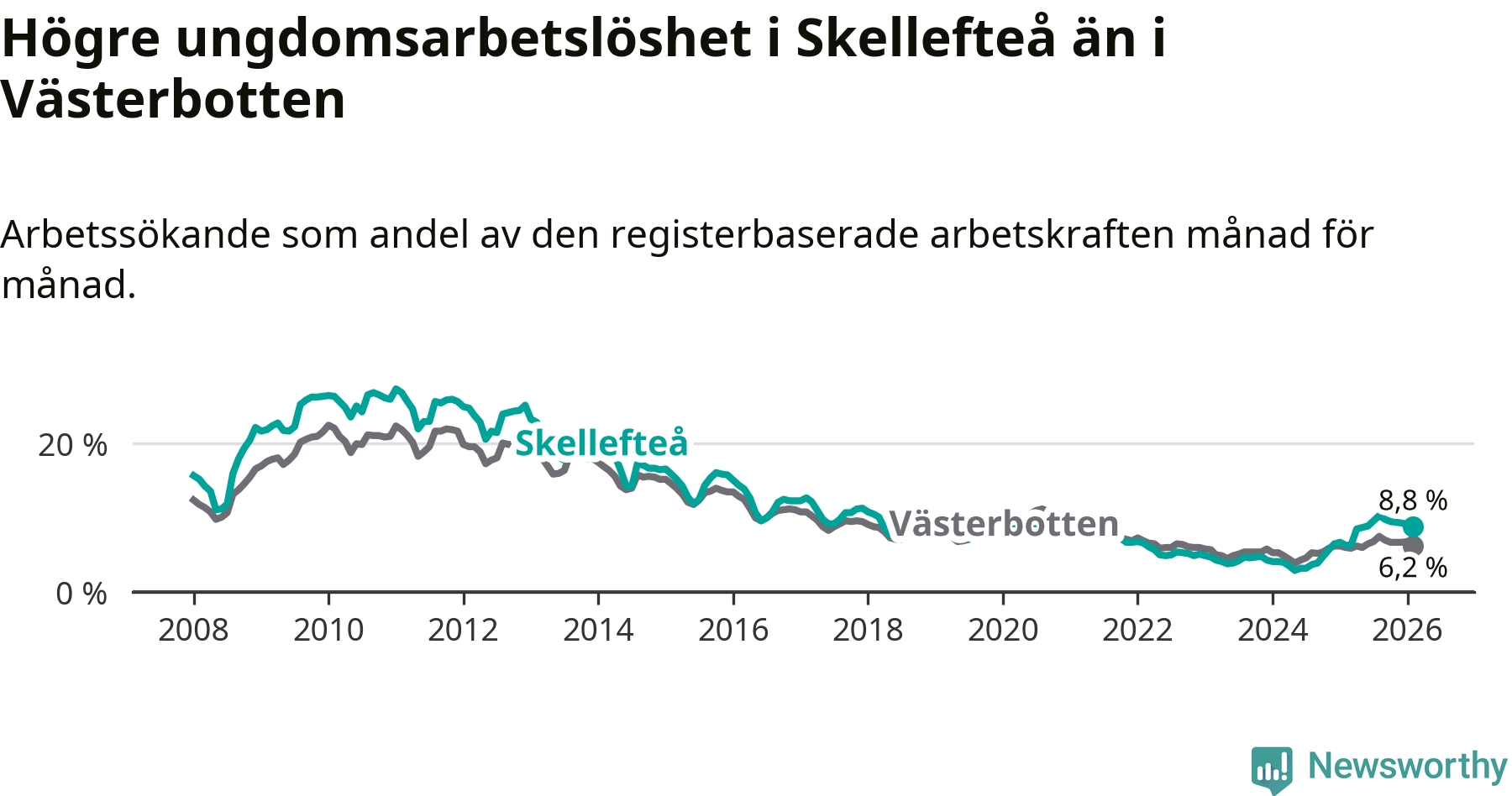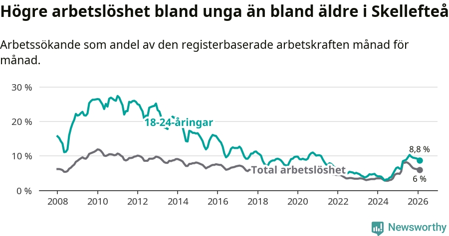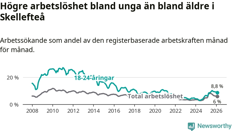 Precis som den totala arbetslösheten ligger ungdomsarbetslösheten i Skellefteå högre än i Västerbotten som helhet. Skillnaden mellan kommunen och länet är 2,6 procentenheter.