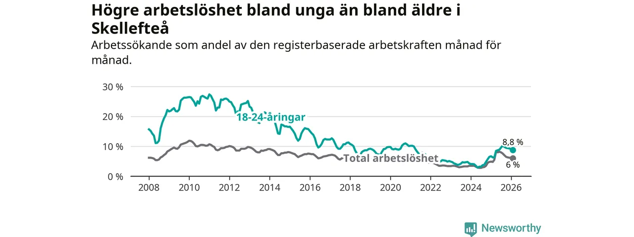 I och med den senaste månadens uppgång har de ungas arbetslöshet i Skellefteå stigit 17 månader i följd (upp från 3,9 procent i september 2024 till 8,8 procent nu).