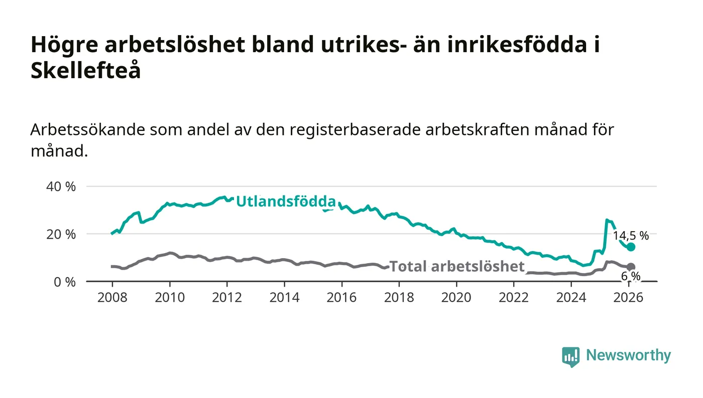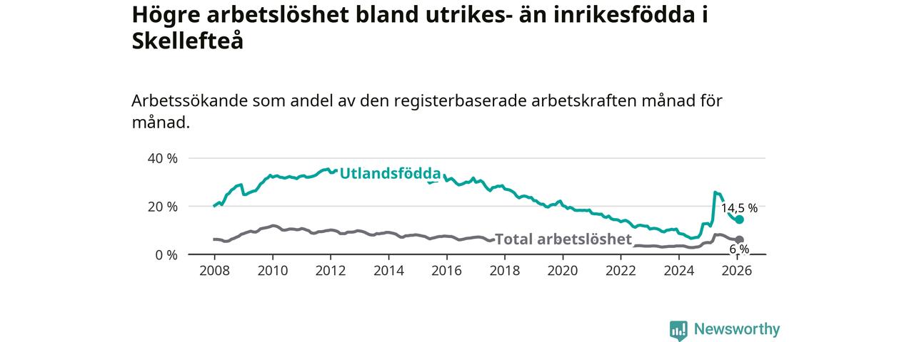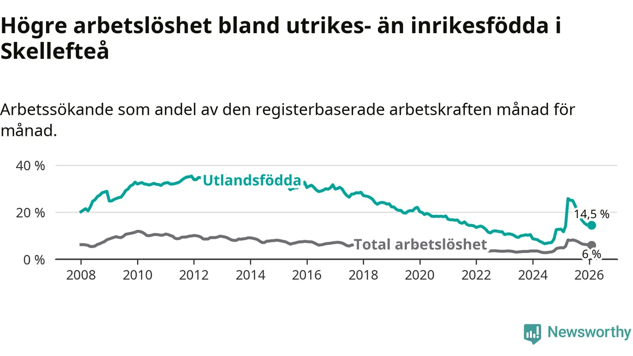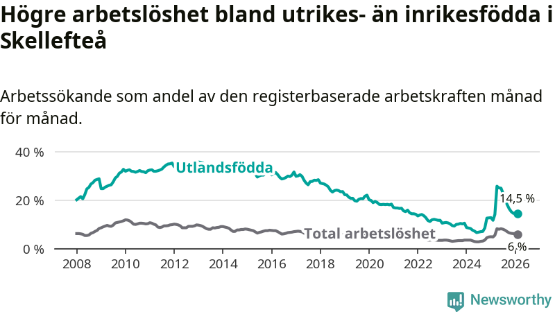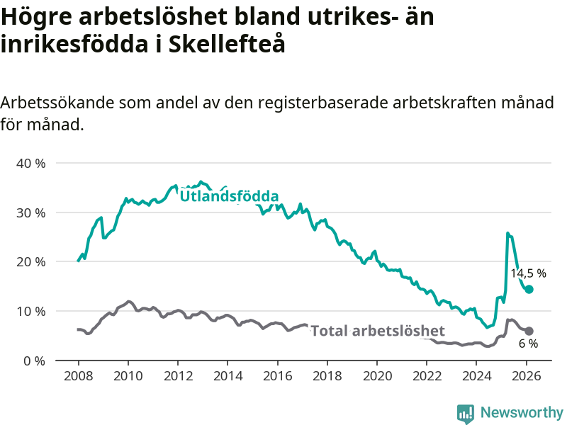 Arbetslösheten bland utlandsfödda var 14,5 procent i Skellefteå under februari månad, motsvarande 997 av 6 876 personer. Det är 2,8 procentenheter fler än vid samma tidpunkt i fjol (+138 om man räknar personer). Därmed är de utlandsföddas arbetslöshet högre än vid samma tidpunkt i fjol för 16:e månaden i följd. Sedan oktober 2024 har arbetslösheten bland utlandsfödda ökat från 8,5 till 14,5 procent.