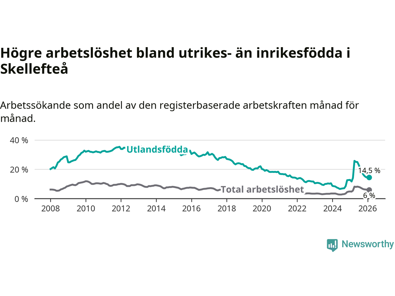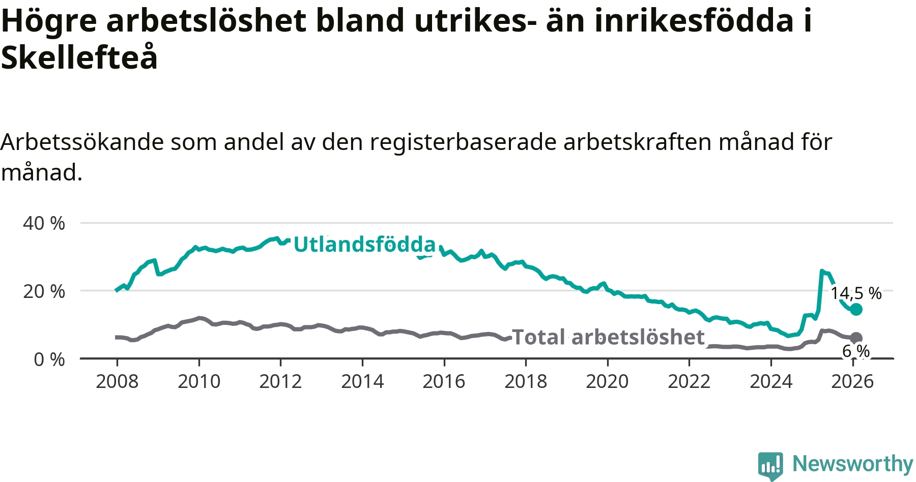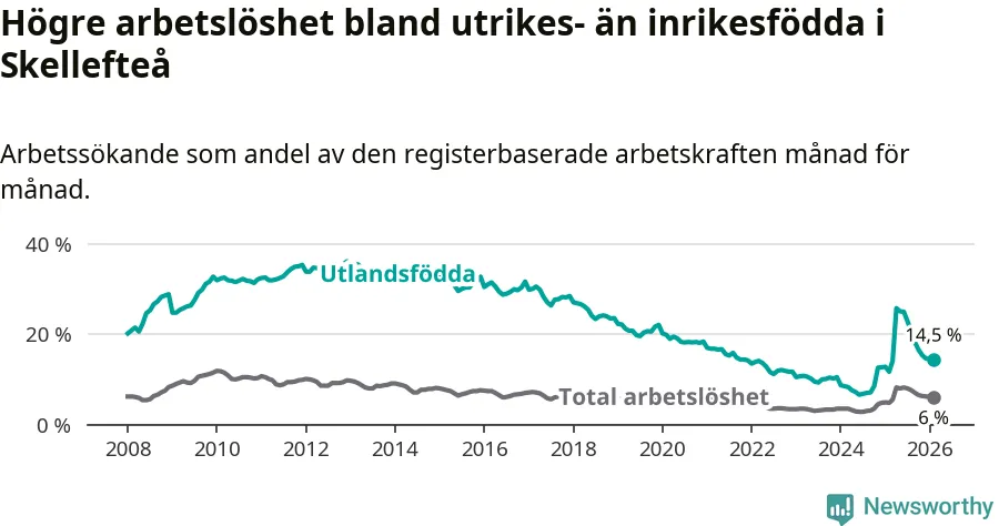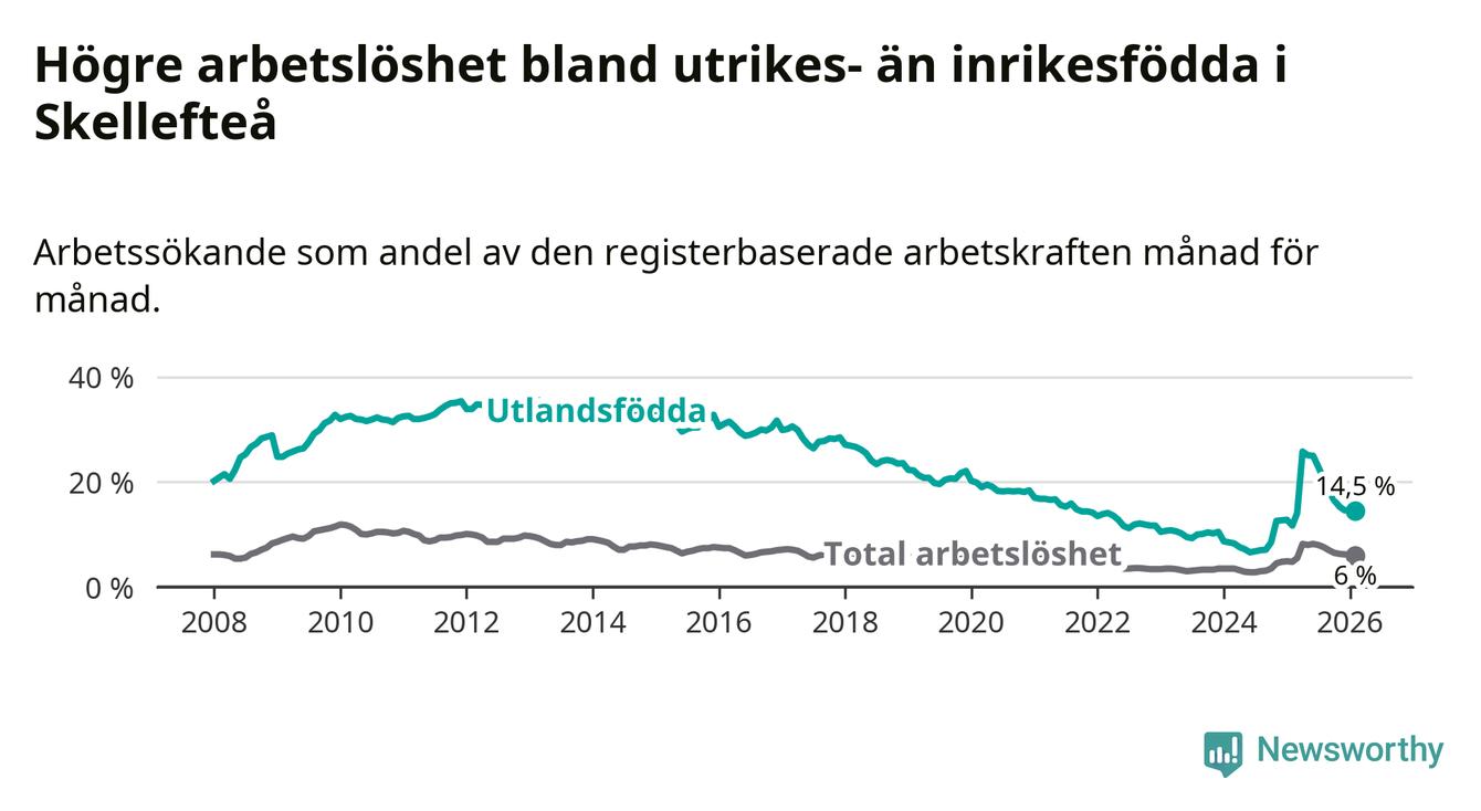 Arbetslösheten bland utlandsfödda var 14,5 procent i Skellefteå under februari månad, motsvarande 997 av 6 876 personer. Det är 2,8 procentenheter fler än vid samma tidpunkt i fjol (+138 om man räknar personer). Därmed är de utlandsföddas arbetslöshet högre än vid samma tidpunkt i fjol för 16:e månaden i följd. Sedan oktober 2024 har arbetslösheten bland utlandsfödda ökat från 8,5 till 14,5 procent.