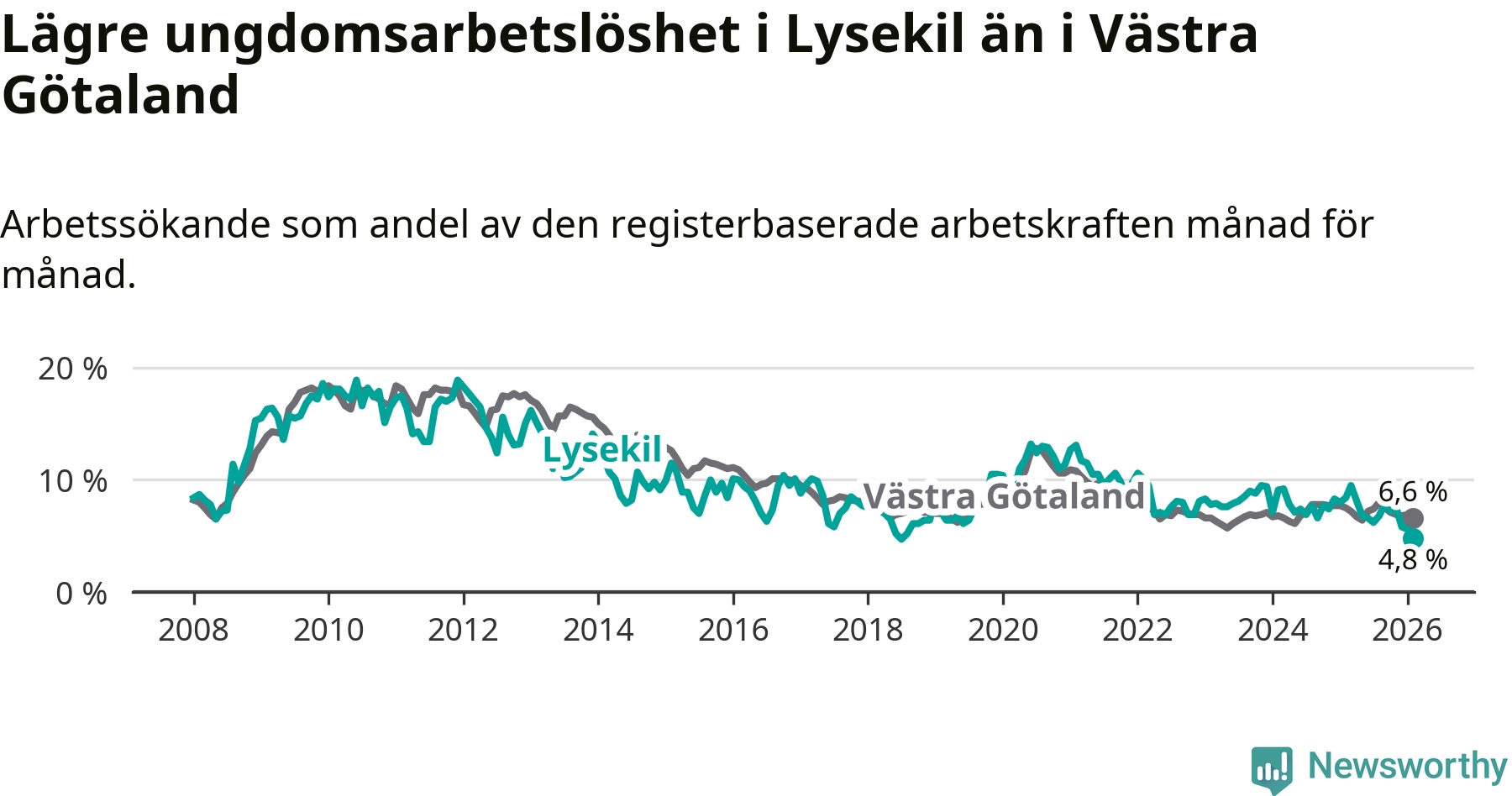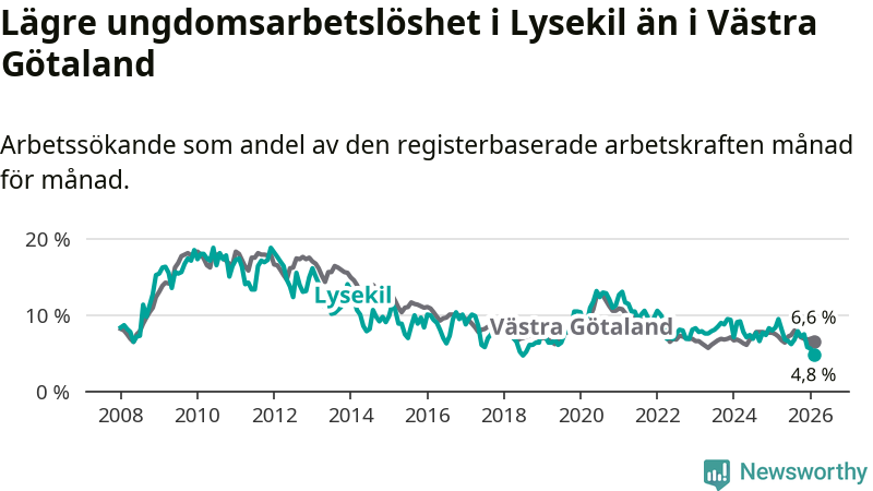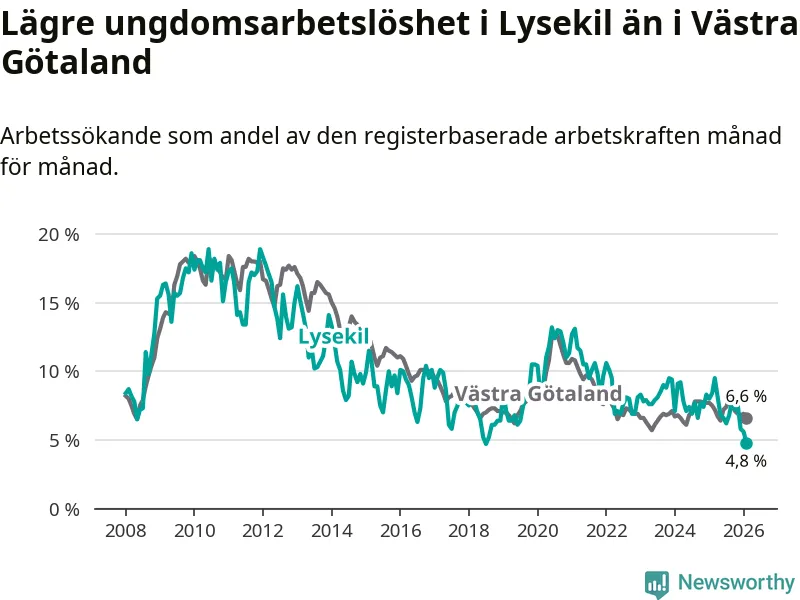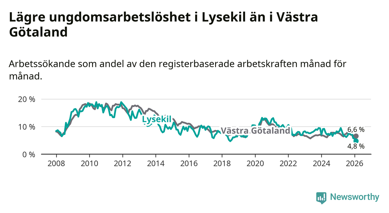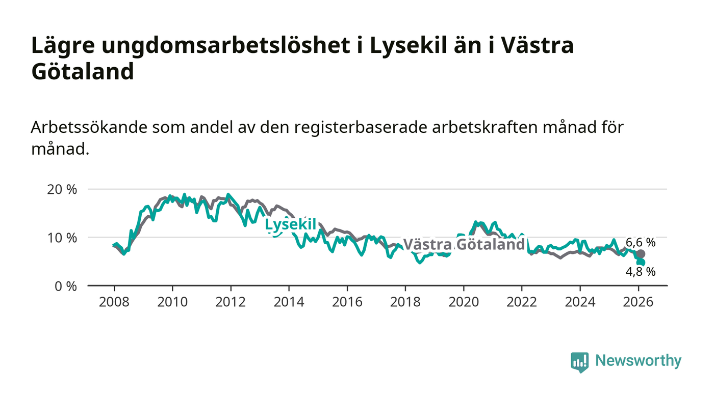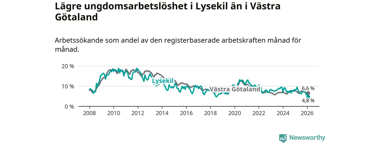 Precis som den totala arbetslösheten ligger ungdomsarbetslösheten i Lysekil lägre än i Västra Götaland som helhet. Skillnaden mellan kommunen och länet är 1,8 procentenheter.
