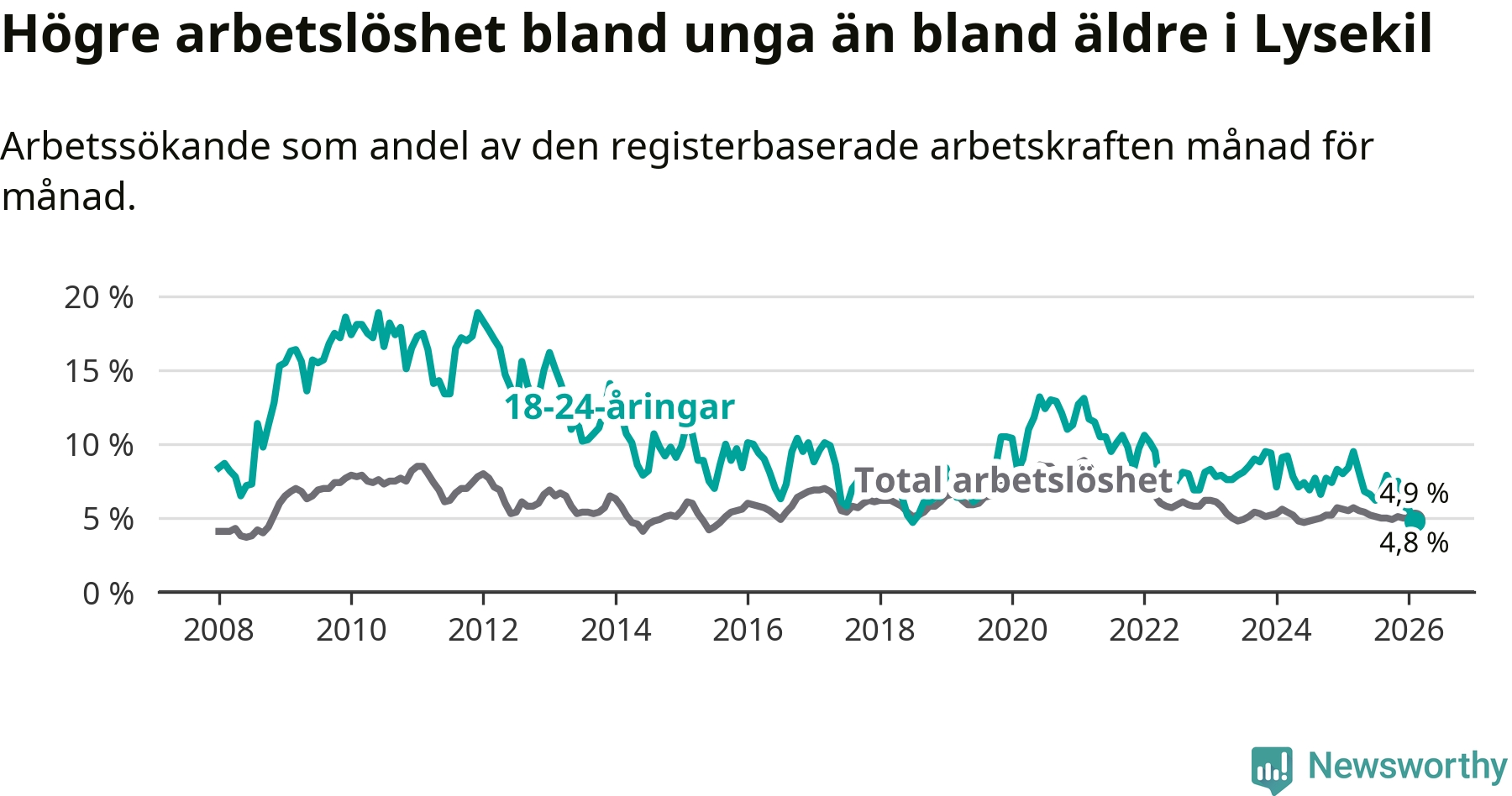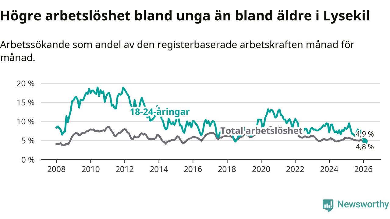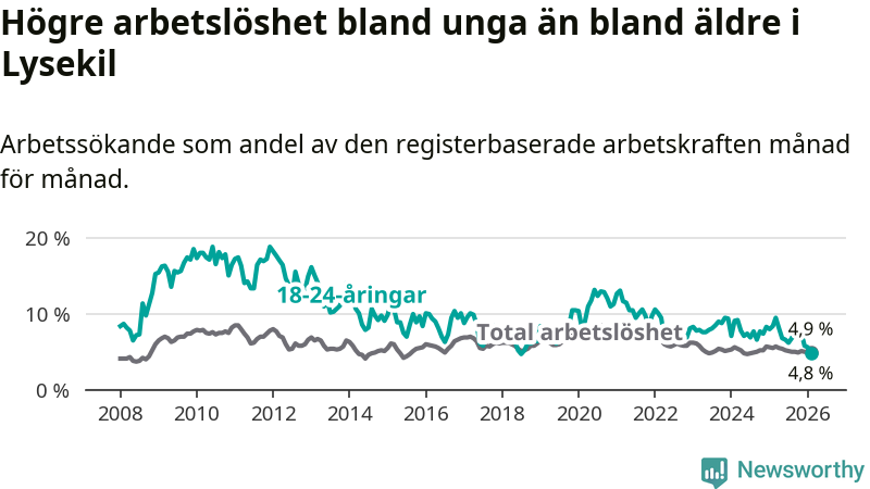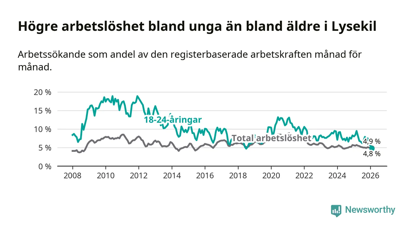 Den senaste månadsstatistiken från Arbetsförmedlingen visar på en nedgång i ungdoms­arbetslöshet i Lysekils kommun med 3,6 procentenheter. Arbetslösheten bland personer i åldern 18–24 år låg i februari på 4,8 procent.