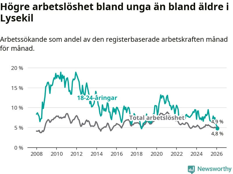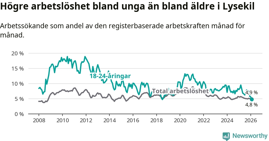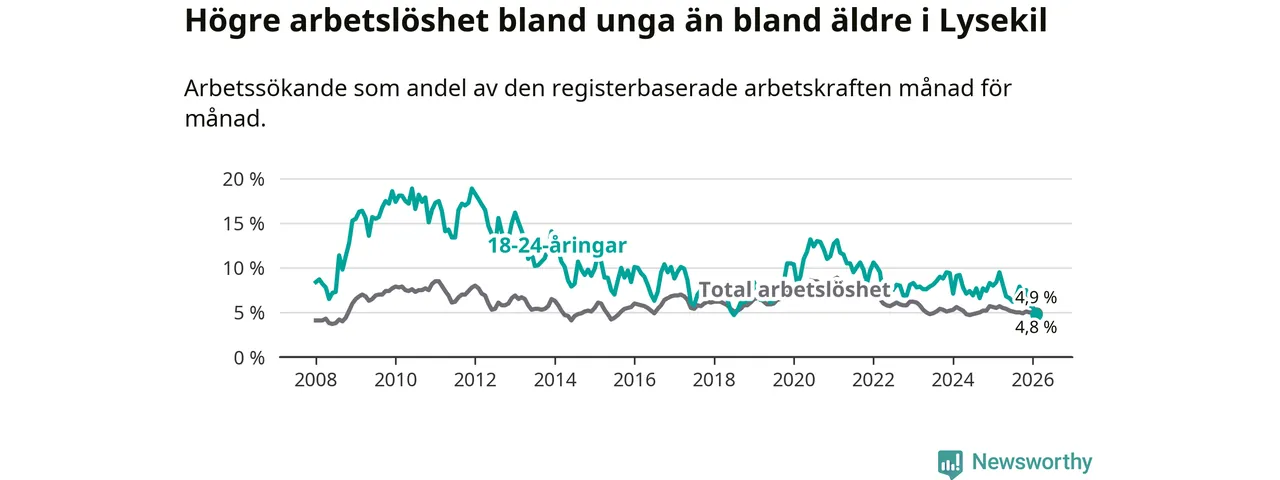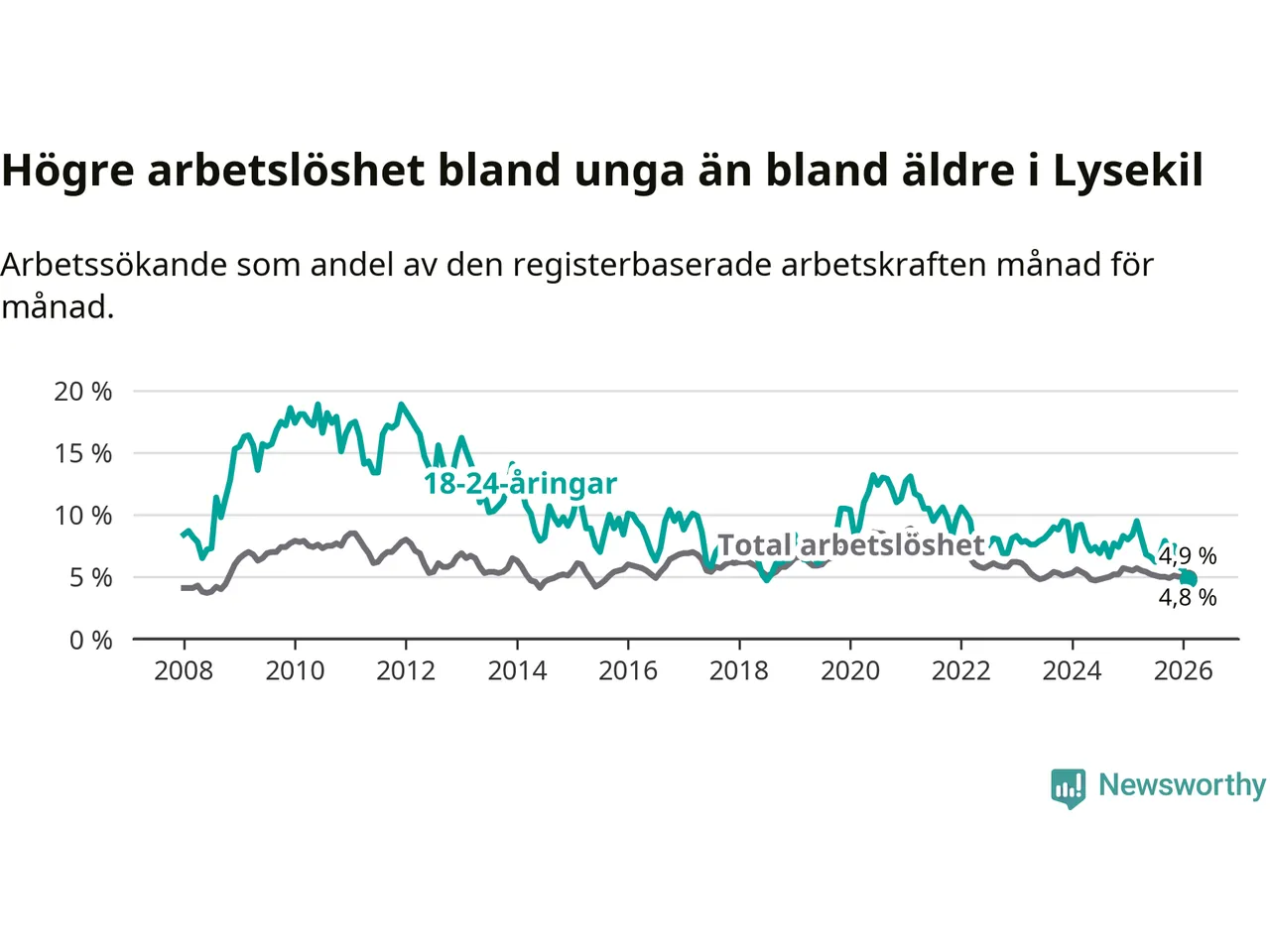 Den senaste månadsstatistiken från Arbetsförmedlingen visar på en nedgång i ungdoms­arbetslöshet i Lysekils kommun med 3,6 procentenheter. Arbetslösheten bland personer i åldern 18–24 år låg i februari på 4,8 procent.