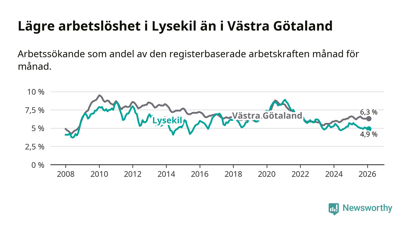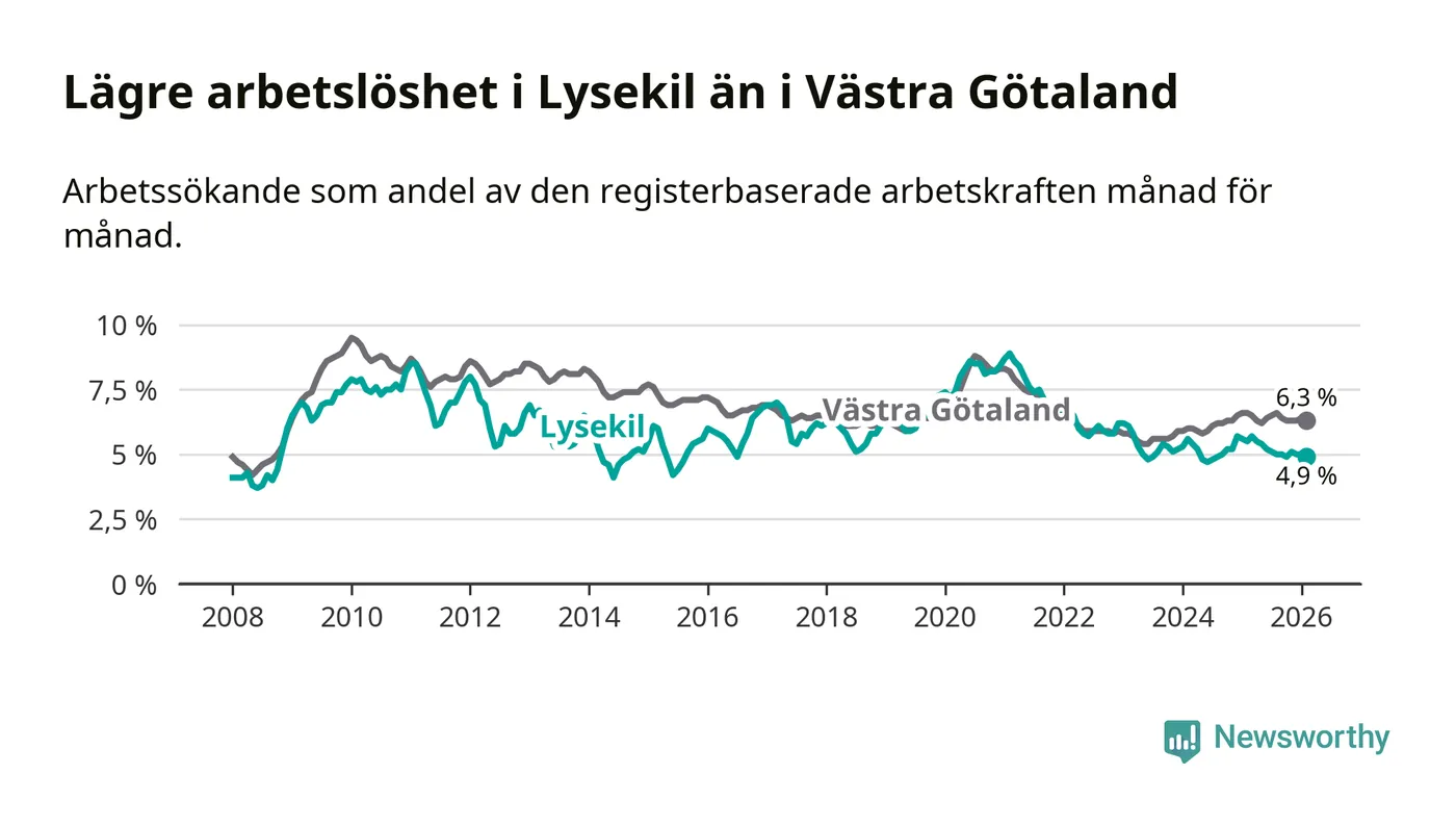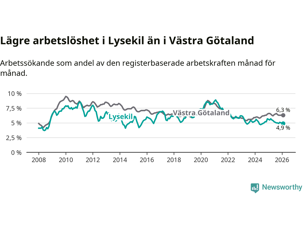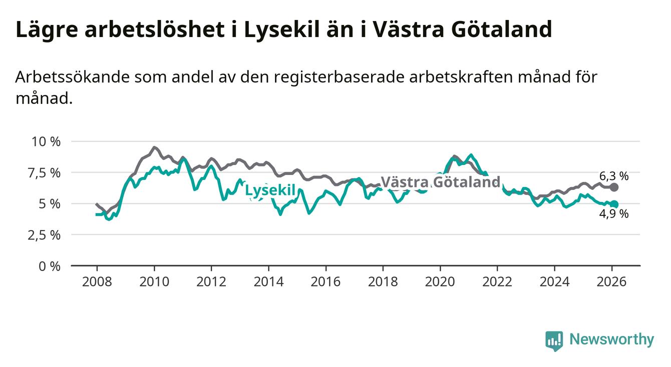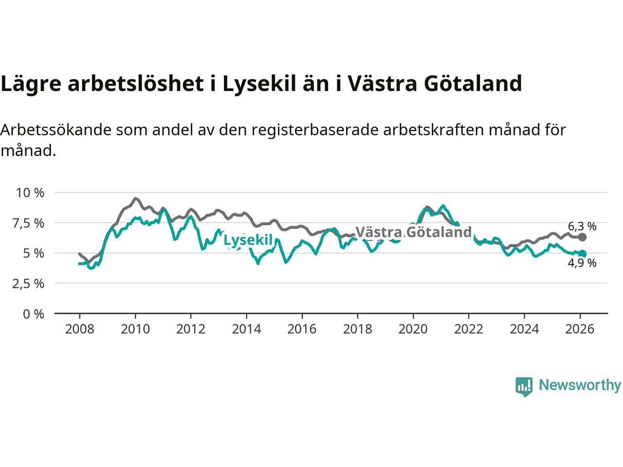 Under februari månad rapporterade Lysekils kommun en total arbetslöshet på 4,9 procent. Det är en minskning jämfört med samma tidpunkt i fjol (−0,6 procentenheter). Även i Västra Götalands län sjunker arbetslösheten .